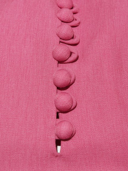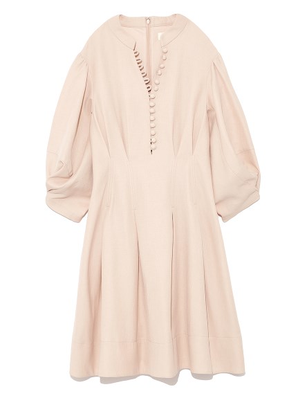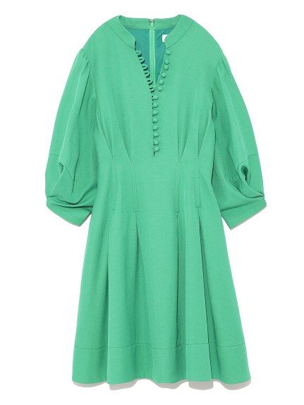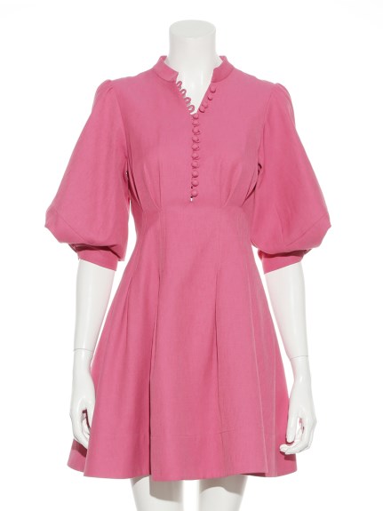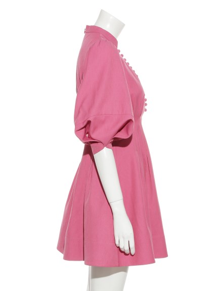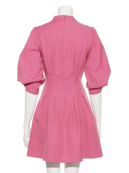 ハリのある素材を使って、構築的なデザインを取り入れた、華やぎワンピース。袖にボリュームをもたせ、ウエストを絞りながらもたっぷりタッグを取ったことで、ミニ丈でも大人っぽい雰囲気に。Vゾーンのくるみボタンが上品さを醸し出しています。