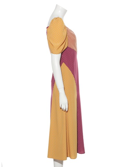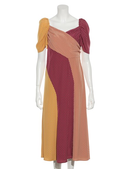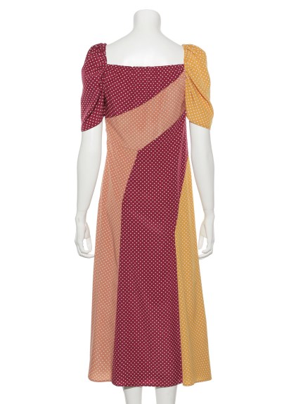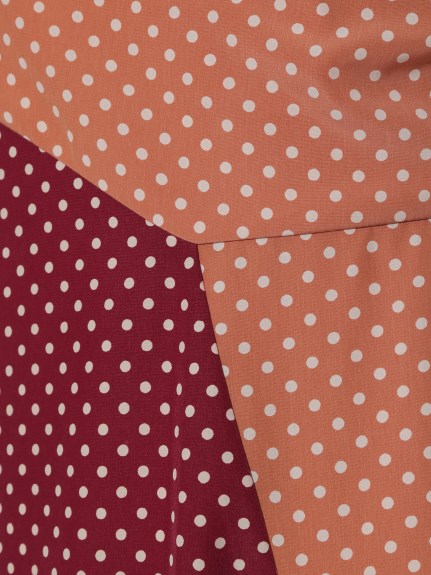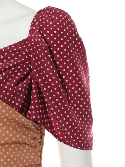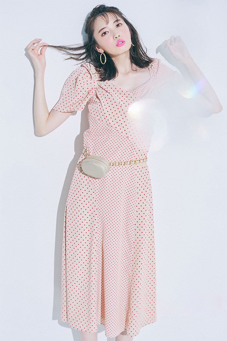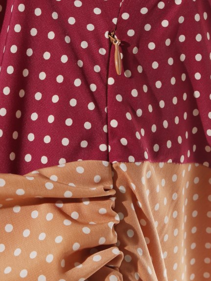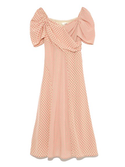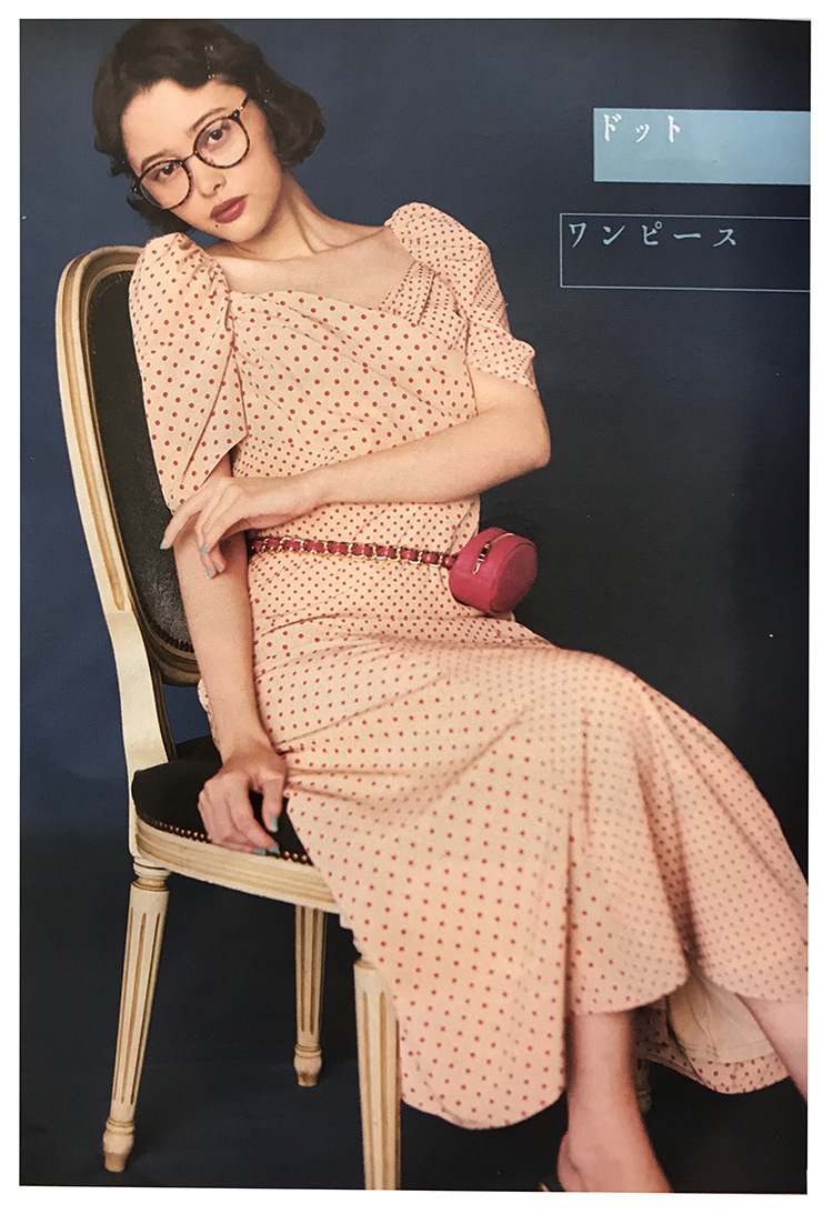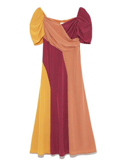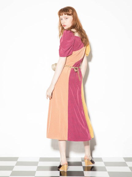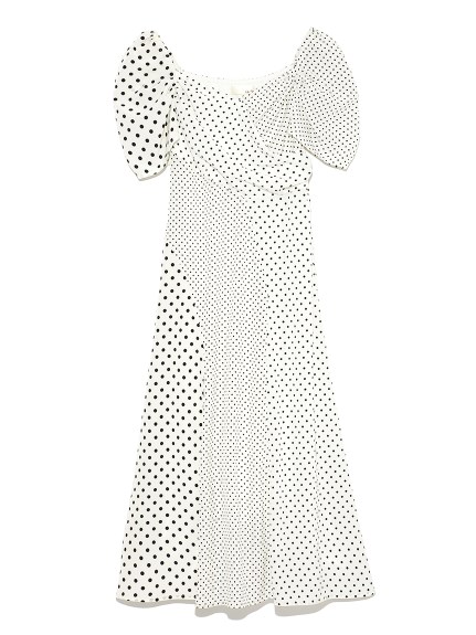オフホワイトは黒の水玉、ベージュはピンクの水玉、ミックスは3色の生地を、それぞれ使っているのが特徴。クラッチバッグや大振りピアスなど小物を充実させれば、よりグラマラスな雰囲気が楽しめます。