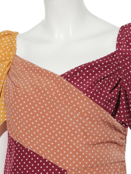 3種類の生地を張り合わせることで、表情豊かに仕上げた贅沢なワンピース。胸元はふんわりとカシュクールに、ウエストから下はストンとした落ち感を生かしているので、メリハリがついて大人っぽい雰囲気に。