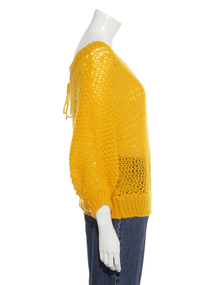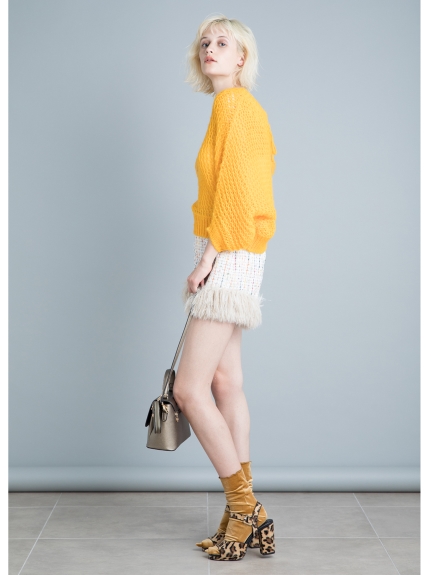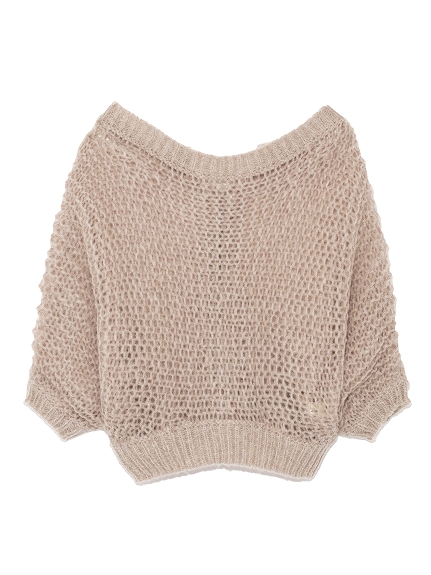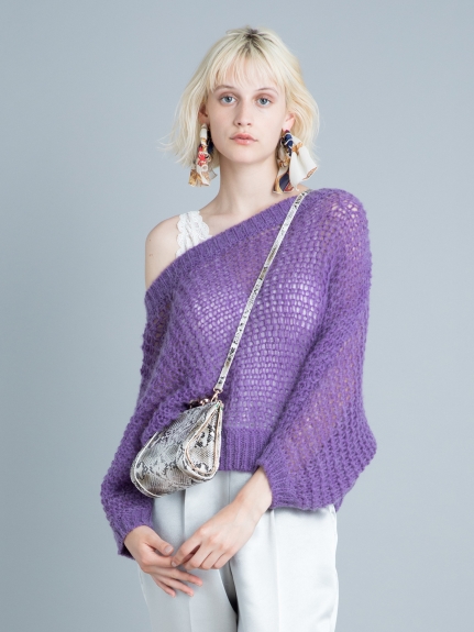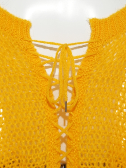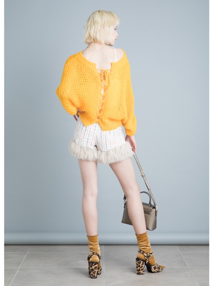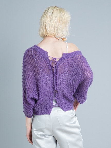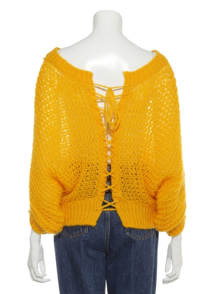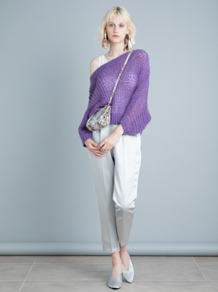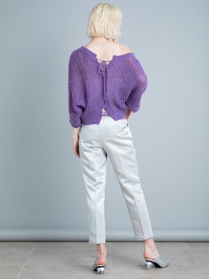 ざっくりと編んだ手編み風のカジュアルな編地で、ドルマンスリーブのエレガントなニットをつくりました。後ろはレースアップ仕様になっているので、女性らしいバックスタイルに。上半身はニットの中で泳がせつつ、ボトムスはスティックパンツやタイトシルエットのスカートを合わせると、甘辛バランスの取れた旬のコーディネートに。