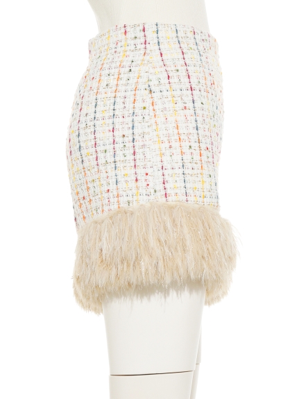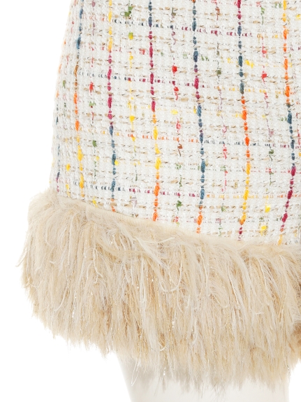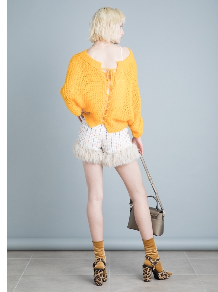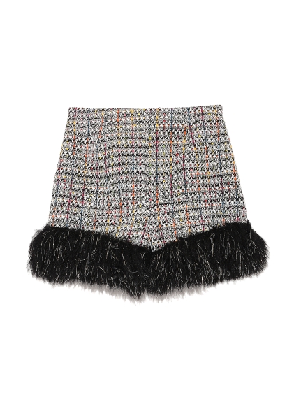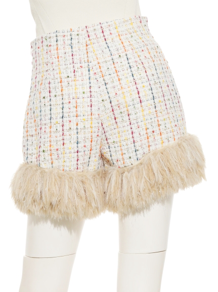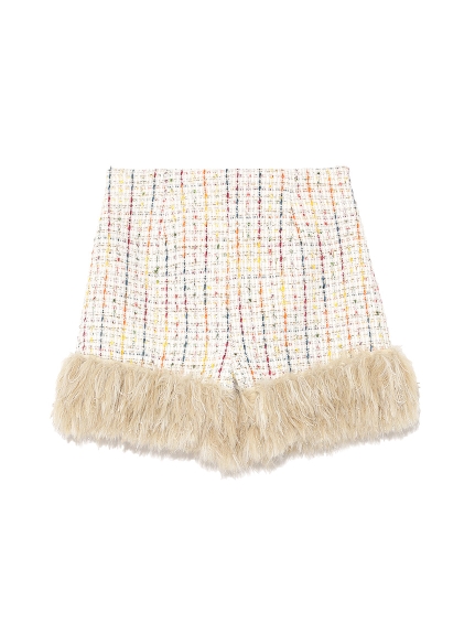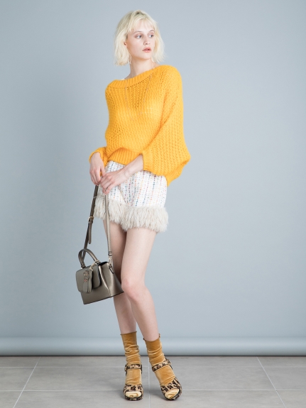 毎シーズン人気のエコファー付きショートパンツが、この秋冬も登場です。すっきりとしたハイウエストデザインの裾を飾るのは、光沢糸がきらめくフェザーヤーン。ニットにフェザーヤーンを引き揃えたタッセルをひとつずつ縫い付けた、スペシャル感を堪能できます。