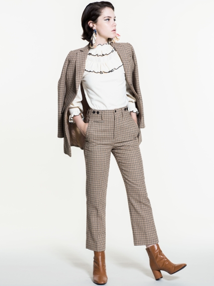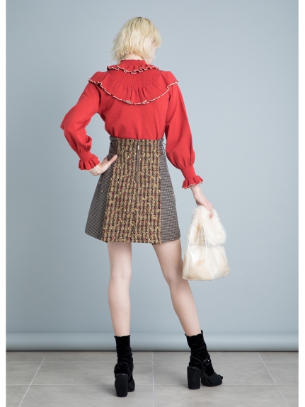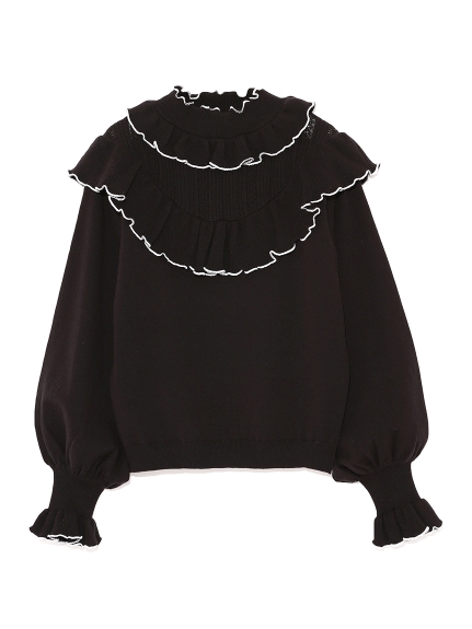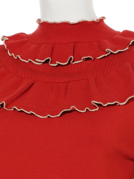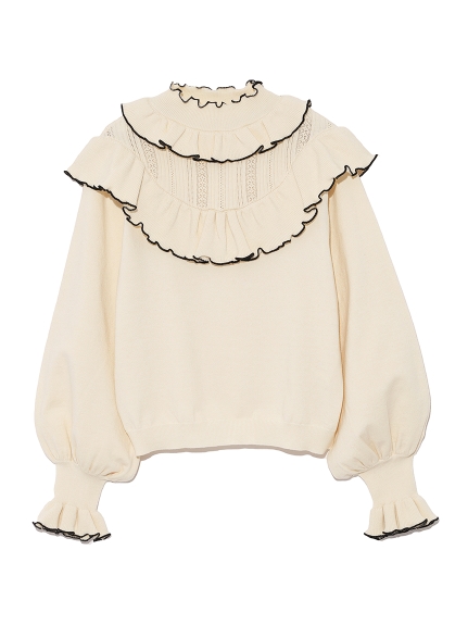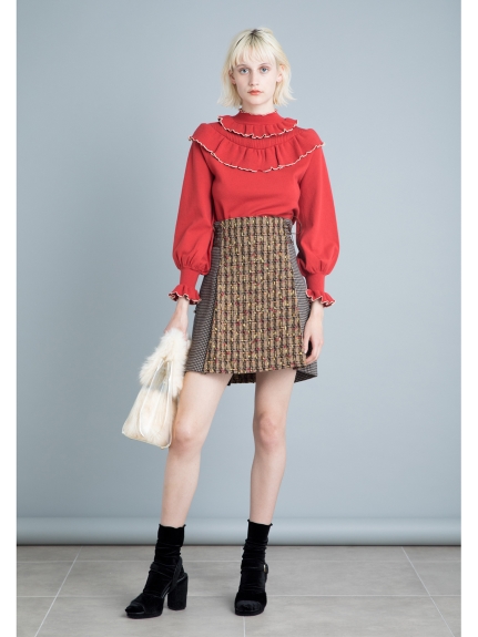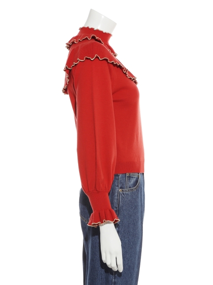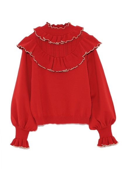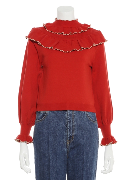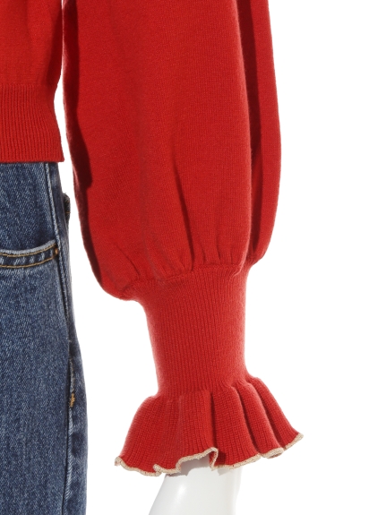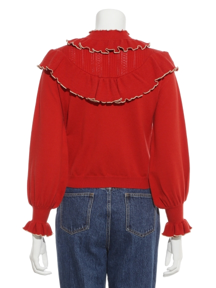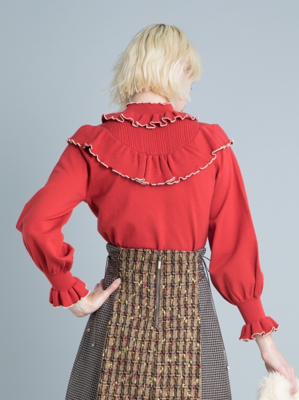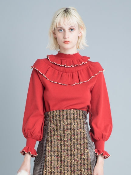 まるでケープを羽織ったかのような、大胆なフリル使いが存在感のあるニット。ネックラインからデコルテ周り、さらに袖口にもメローフリルをたっぷりと施しました。デコルテ部分は透け感のある編み地に切り変えて、高級感をプラス。プリーツ素材のロングスカートや台形のミニスカートなどと合わせて、女性らしく仕上げるのがコツです。