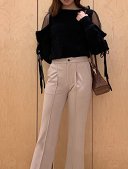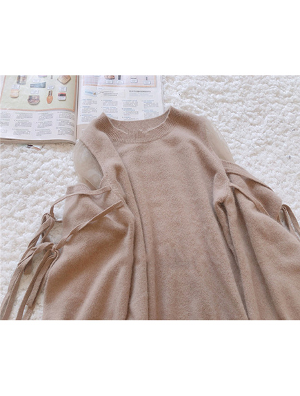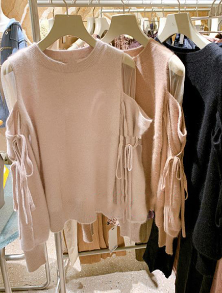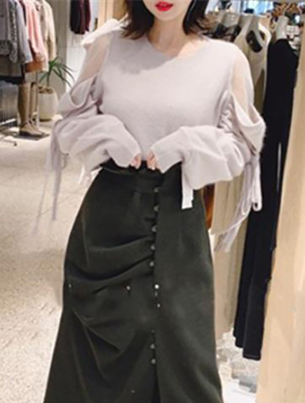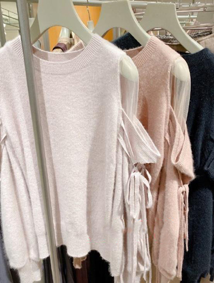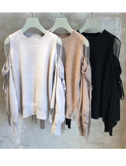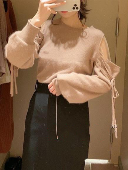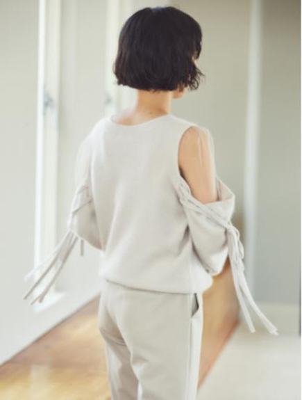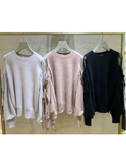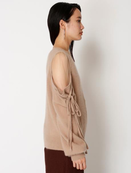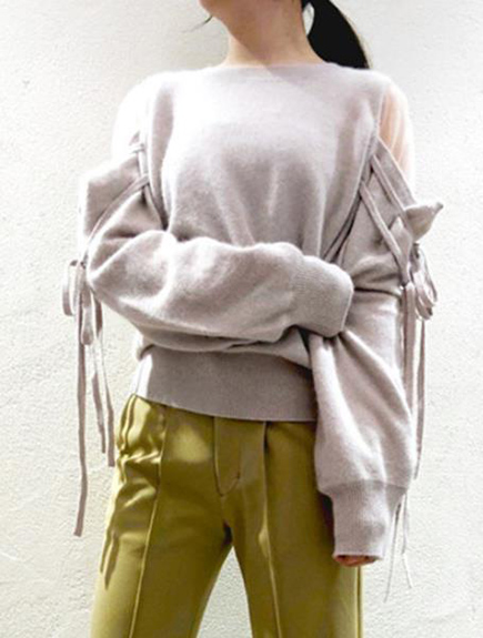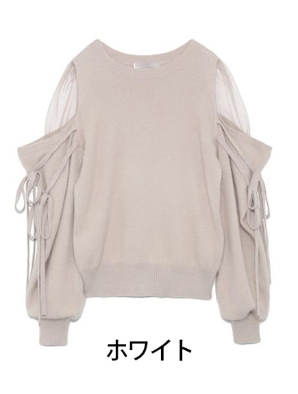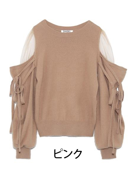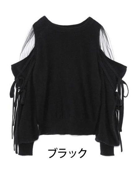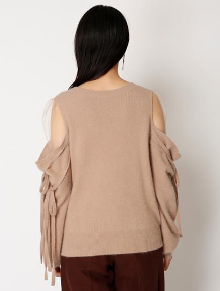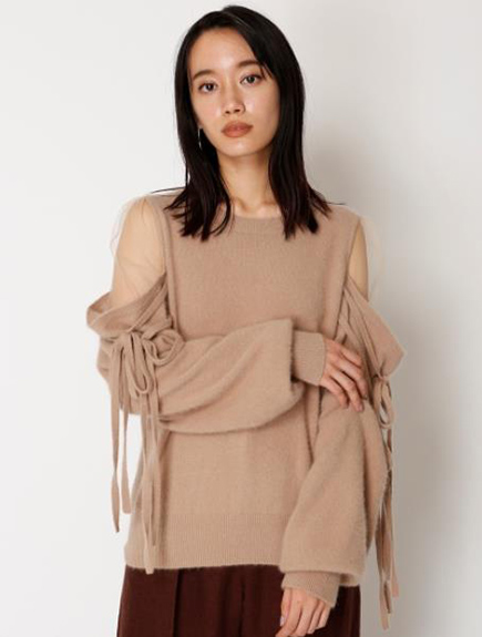 チュールで切り替えたシースルーショルダーが、フェミニンな装いへ誘うニットプルオーバー。