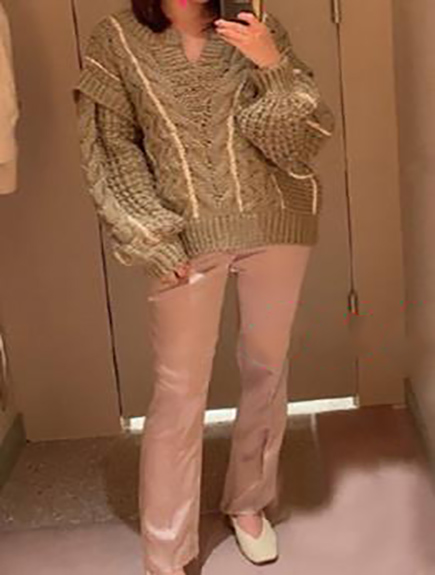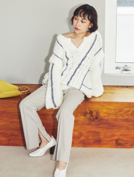 ドロップショルダーが今季らしさを表現するビッグサイズのプルオーバーは、レギンスやニットパンツなどの細身のボトムと好相性。