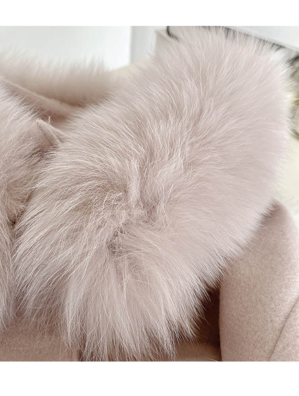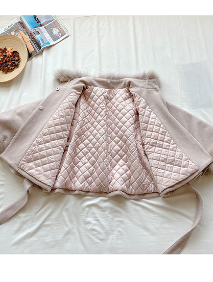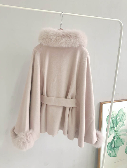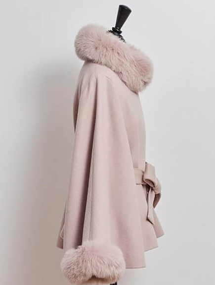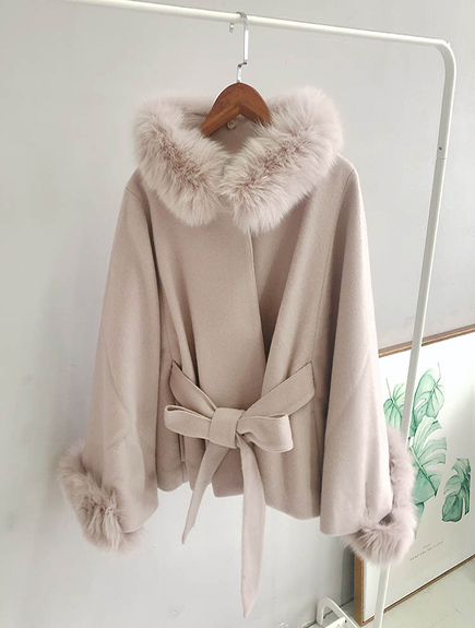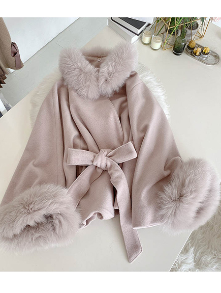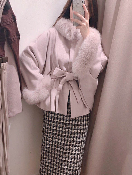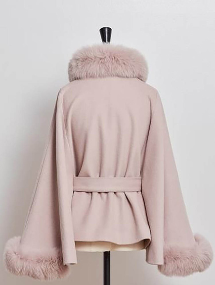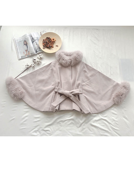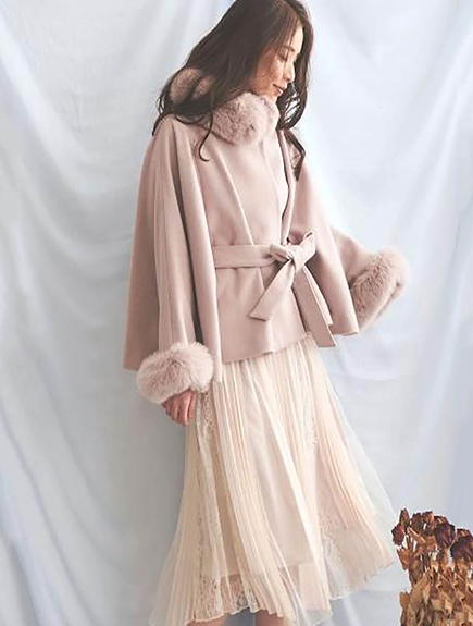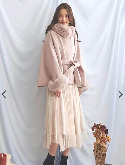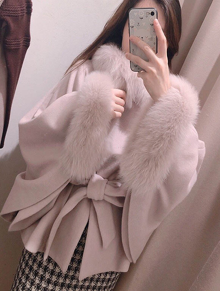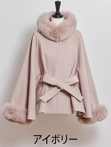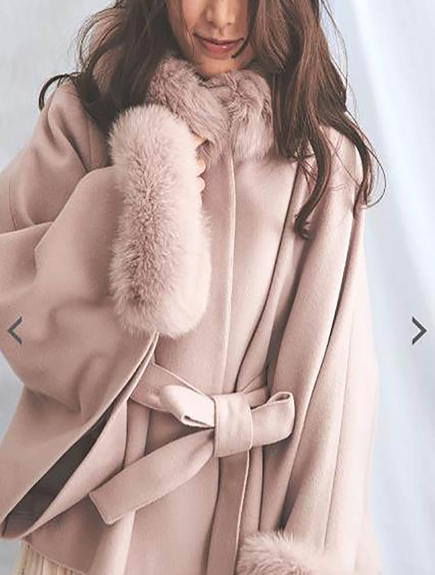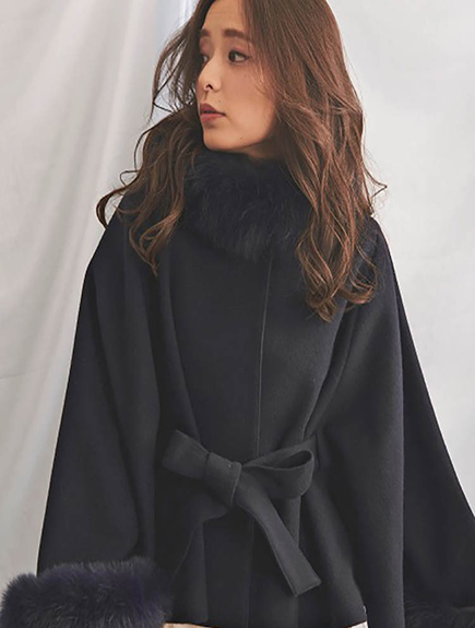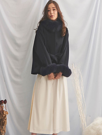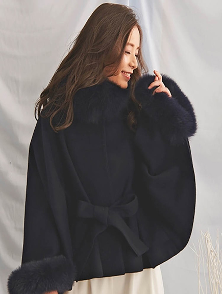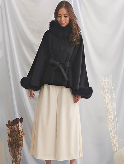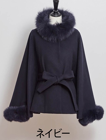 トレンドのケープ型のウールコートです。FOXファーを贅沢に使用しリッチな印象に仕上げました。タイトスカート合わせですっきりと見せるのがおすすめ。ケープ型で袖がないので、ボリュームのあるニットの上から着てもごわつかず、おさまり良く着ることが出来ます。 サイズ表記 着丈 肩幅 裄丈 袖丈 F 61cm 39cm 75cm 55 cm