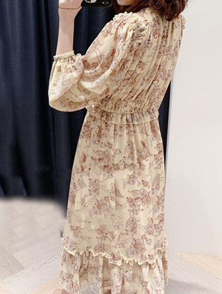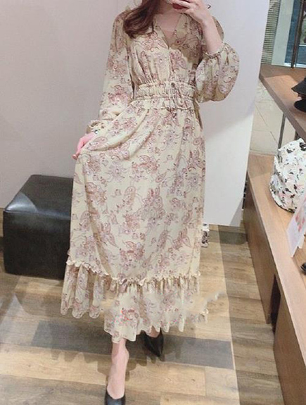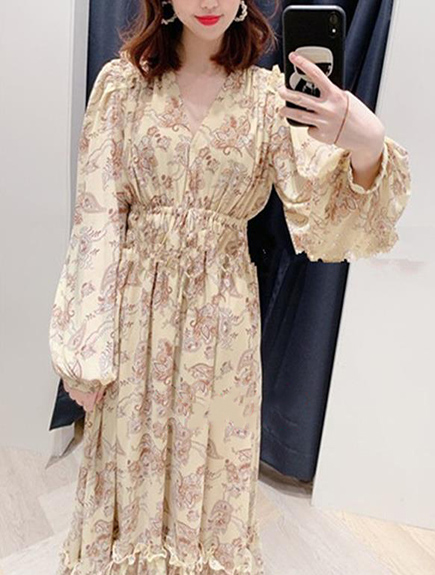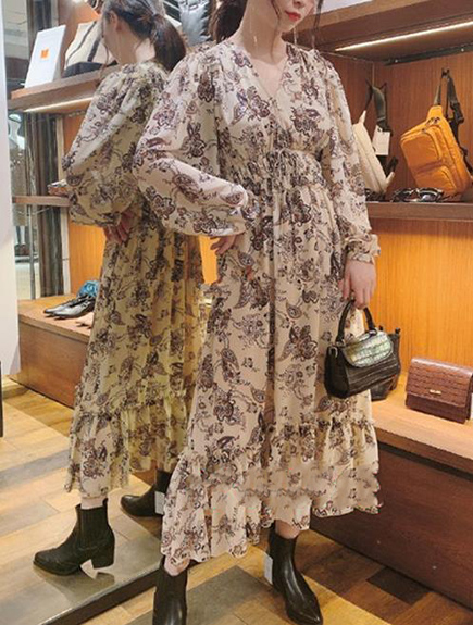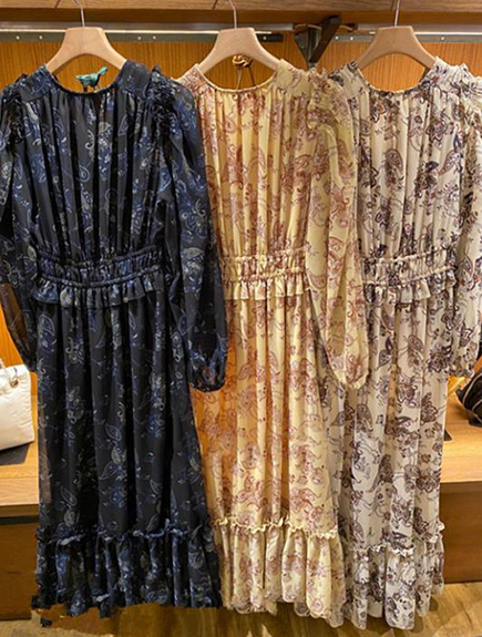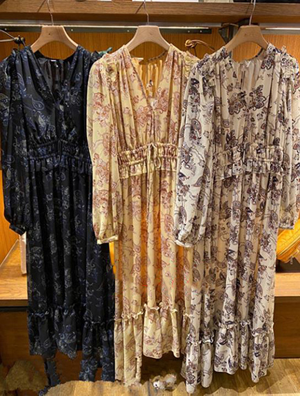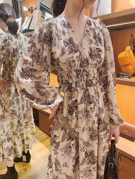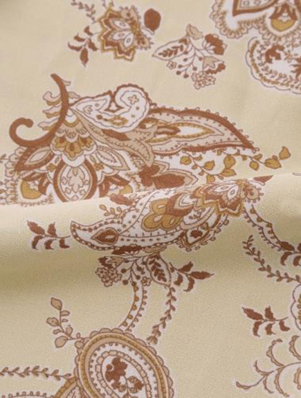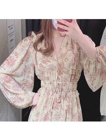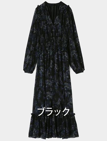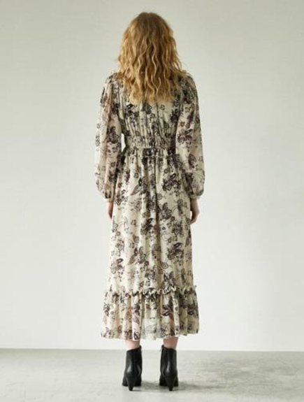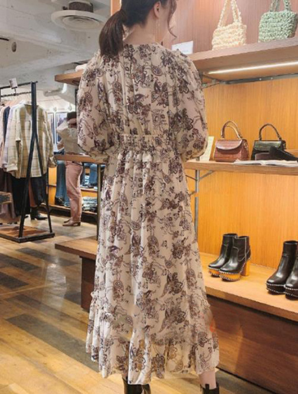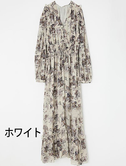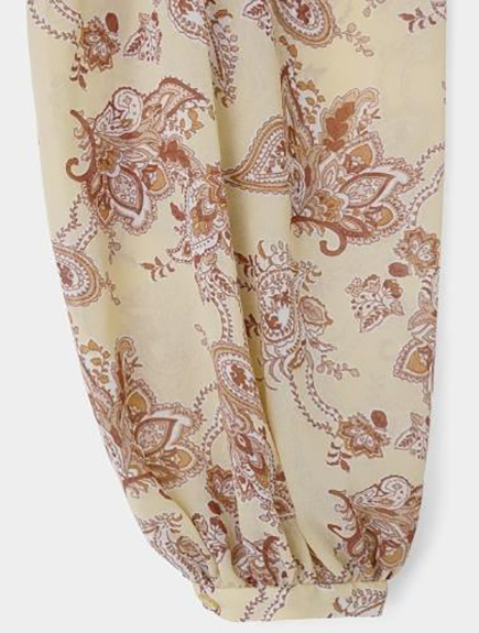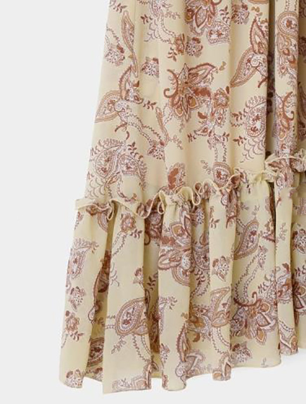 柔らかく落ち感のあるシフォン素材に、インパクトのあるオリジナルのペイズリー柄をプリントしました。全体的に細やかなギャザーを寄せ、ドレープ感を出し、女性らしい印象に仕上げました。