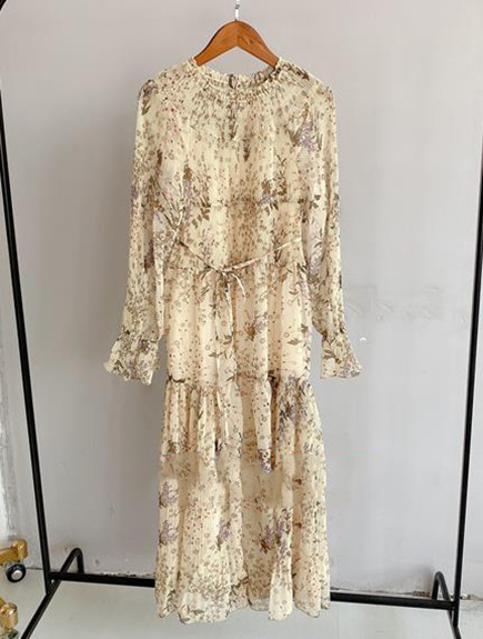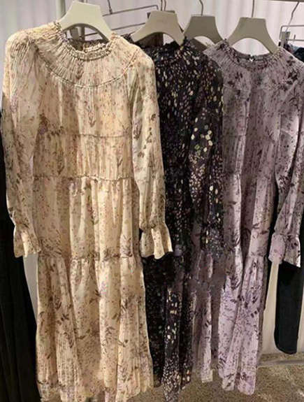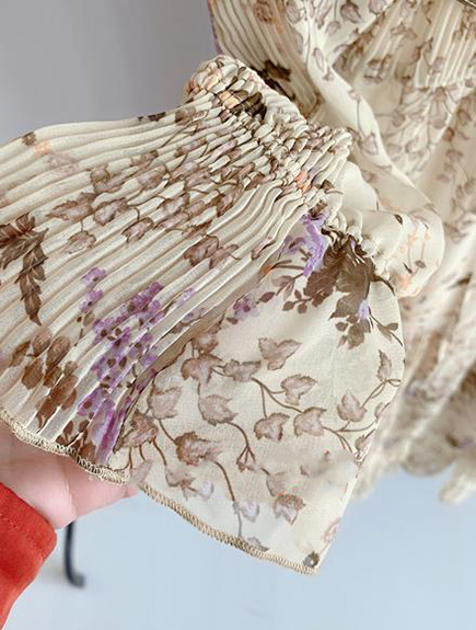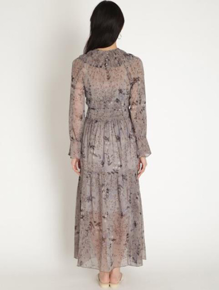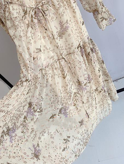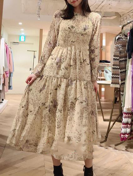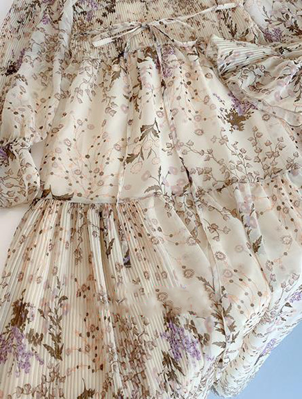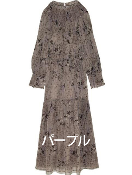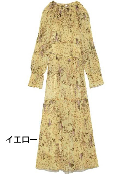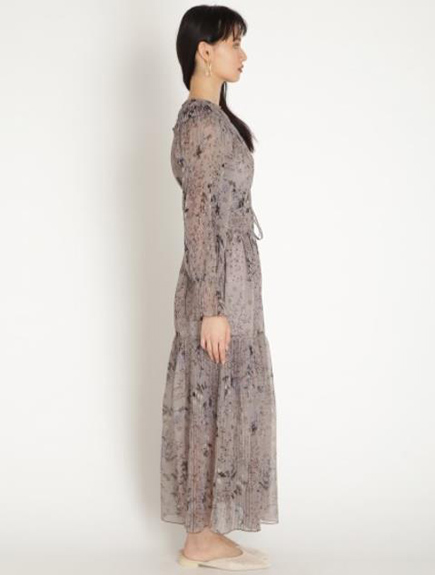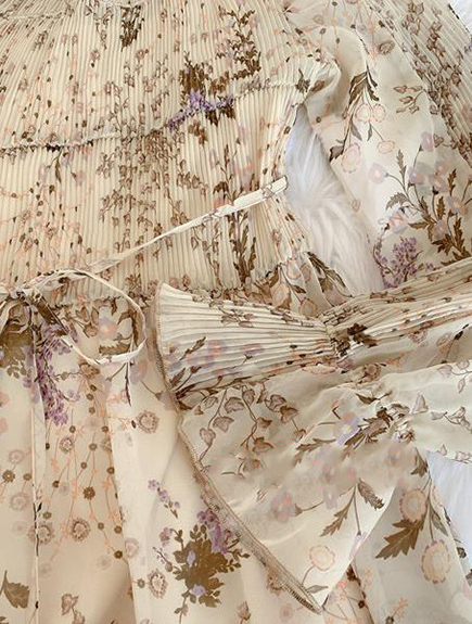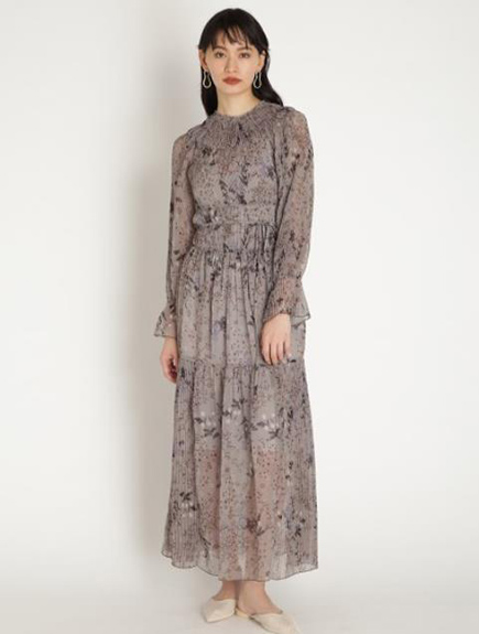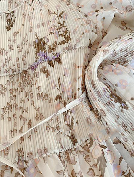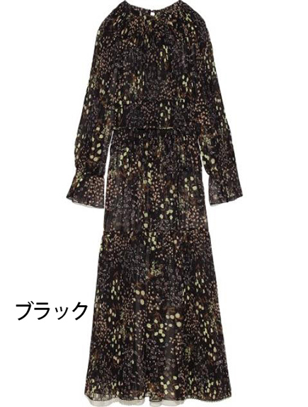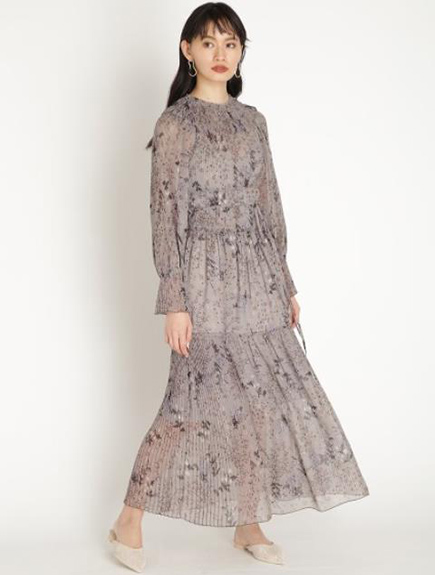 プリーツ加工を施したパーツを組み合わせ、立体的な表情につくり上げた花柄ロングワンピース。