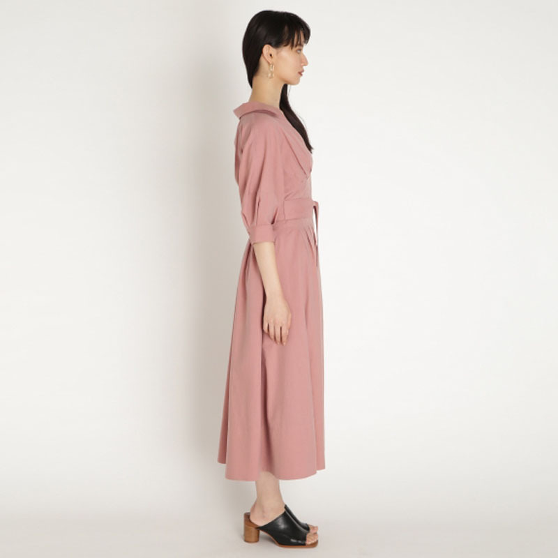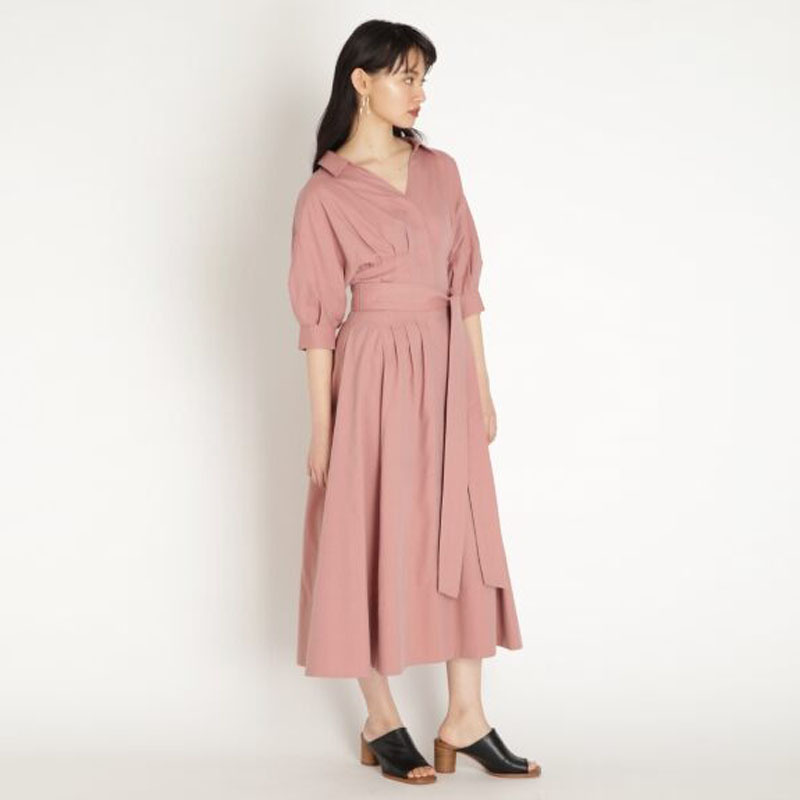程良く開いた襟元はフェイスラインをすっきりと見せてくれ、ウエストに施されたタックは自然なシェイプでスタイルアップを叶えてくれます。