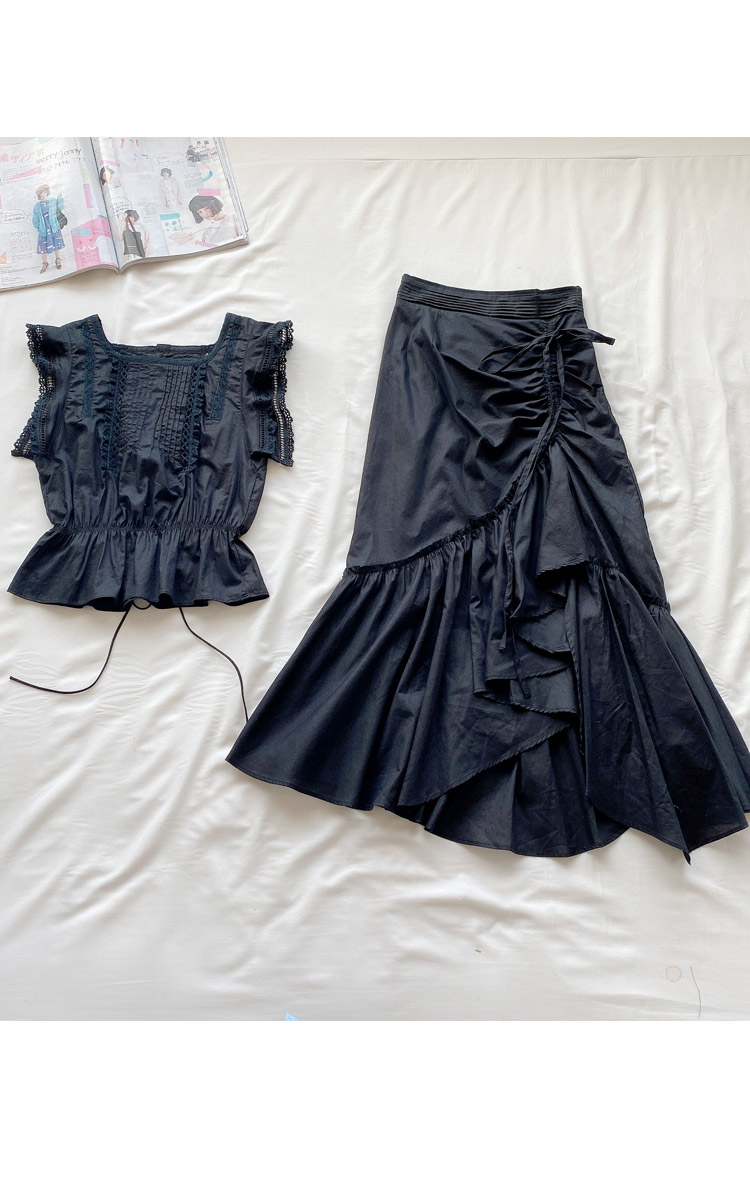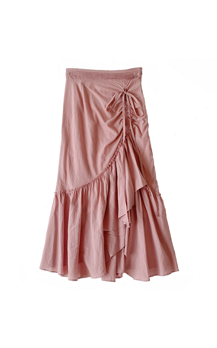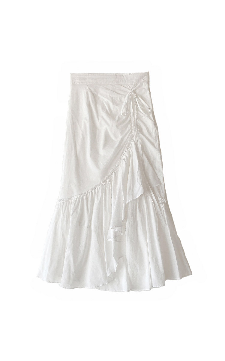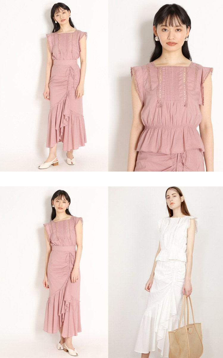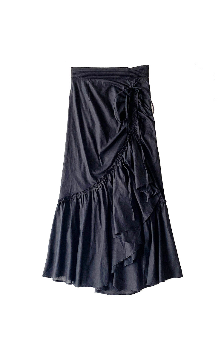 カーヴィなラインを描くティアードスカートは、ボリュームのあるドレープフリルがドラマティックな表情を演出。