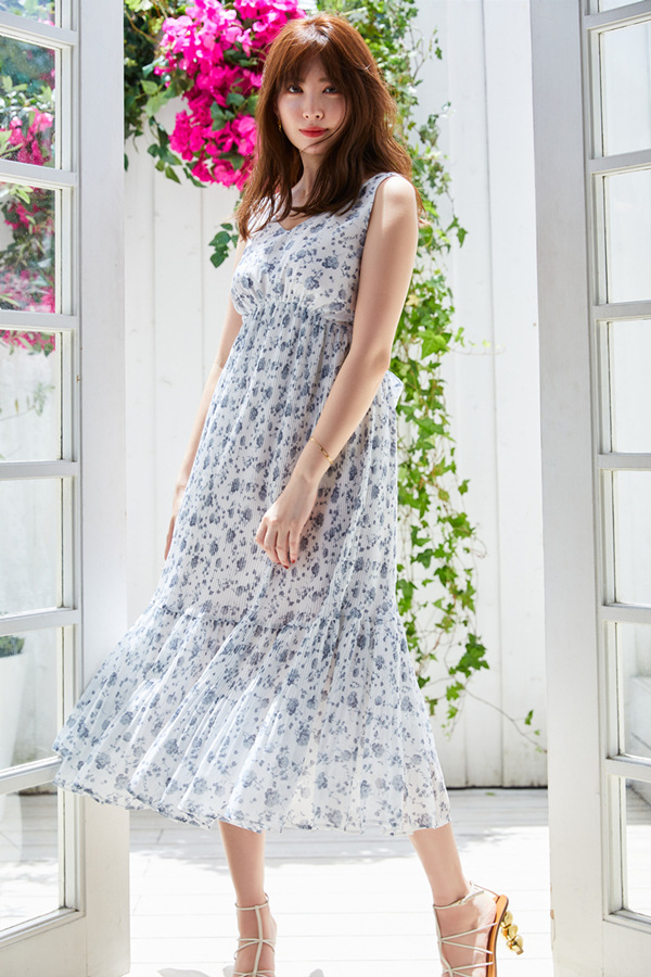 スカートに配された細やかなアコーディオンプリーツがIラインシルエットの印象を与え、歩くたびに優雅な雰囲気を演出します。ティアード下のプリーツは裾に向かい消しプリーツになっているので裾の広がりが上品で洗練された仕上がりになっています。