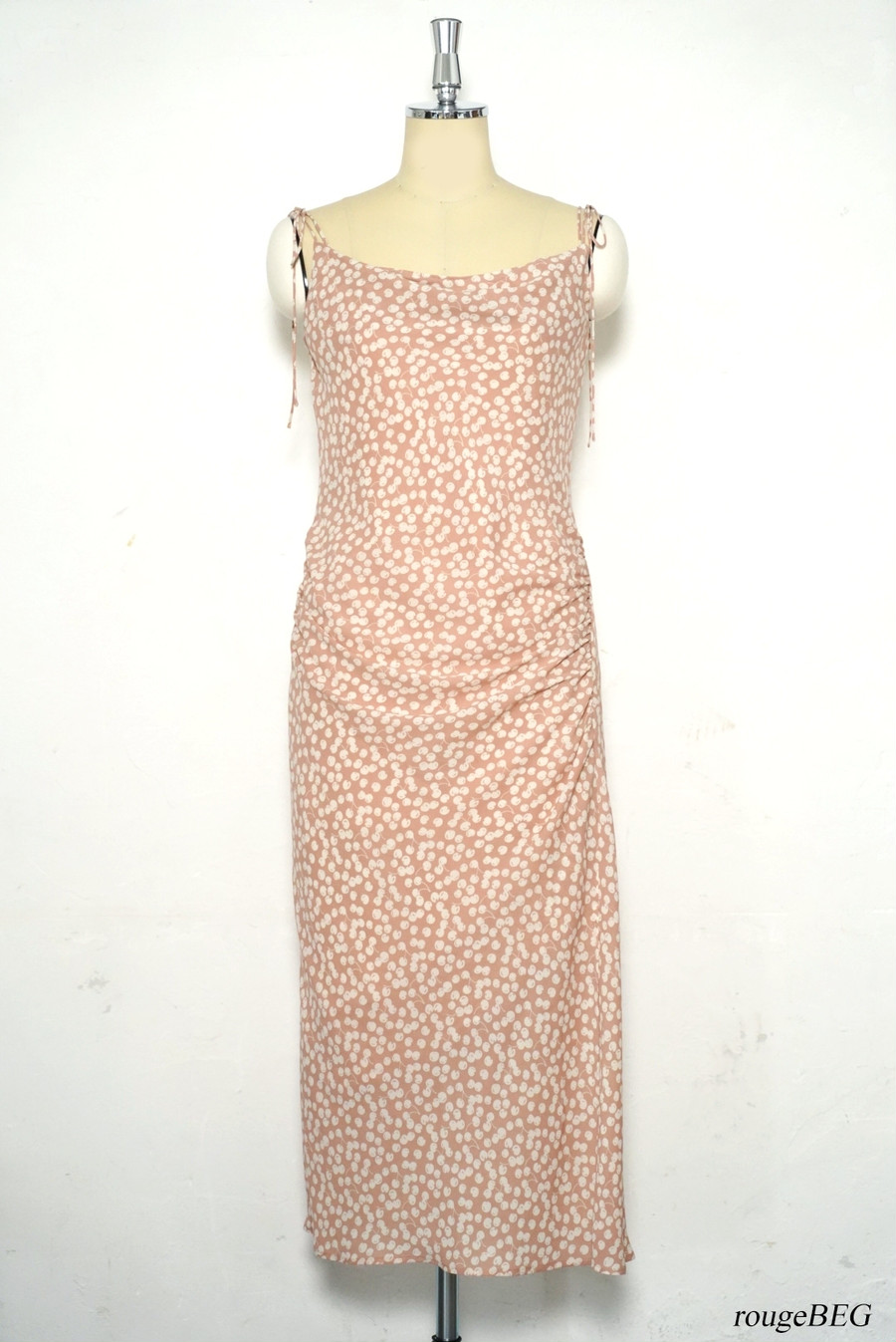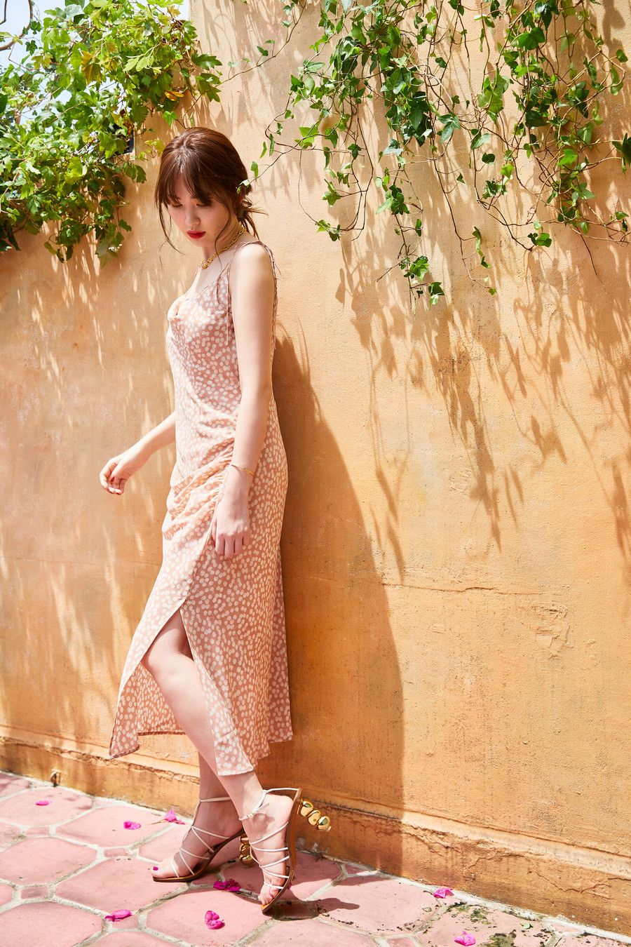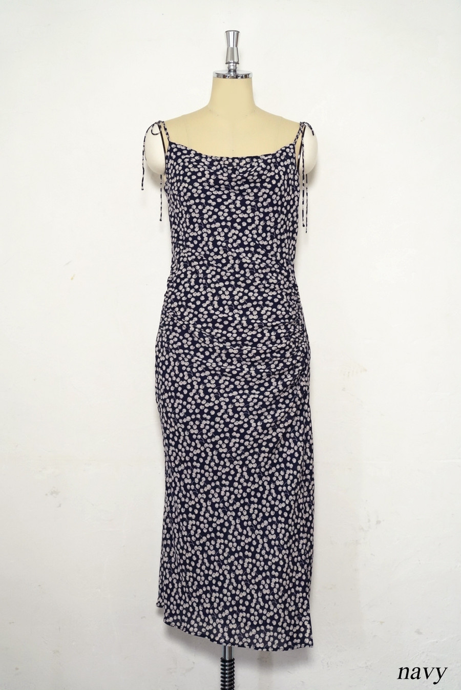 肩ひもはストラップに加え、リボン結びでも長さ調節可能。ギャザーを寄せたウエスト周りのドレープから流れ落ちるエレガントなシルエットに仕上げました。左側にはスリットが入っているので足元を綺麗に見せてくれます。