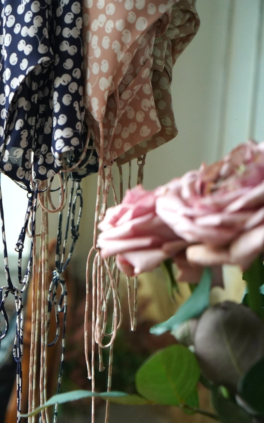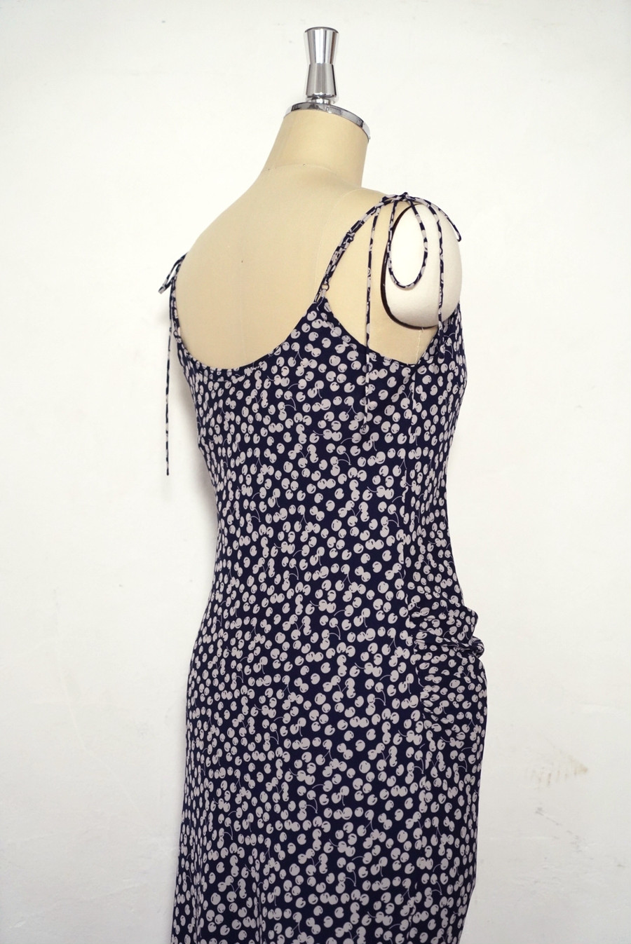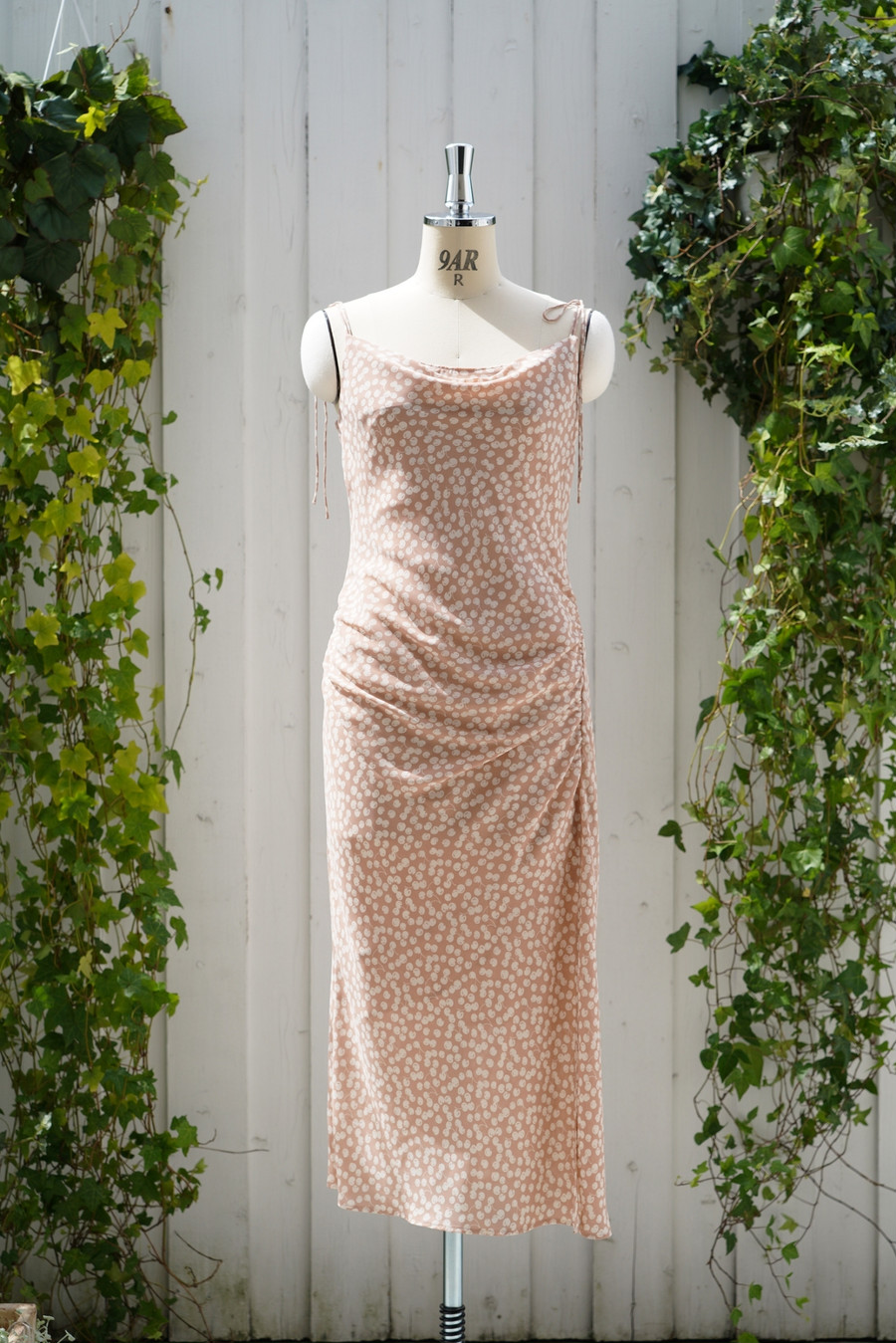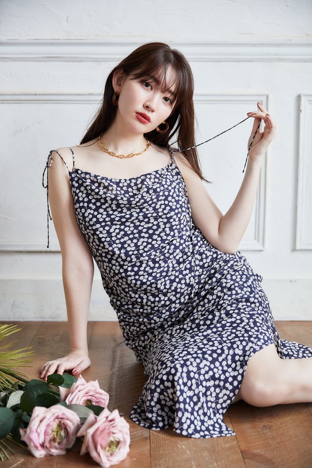 肩ひもはストラップに加え、リボン結びでも長さ調節可能。ギャザーを寄せたウエスト周りのドレープから流れ落ちるエレガントなシルエットに仕上げました。左側にはスリットが入っているので足元を綺麗に見せてくれます。