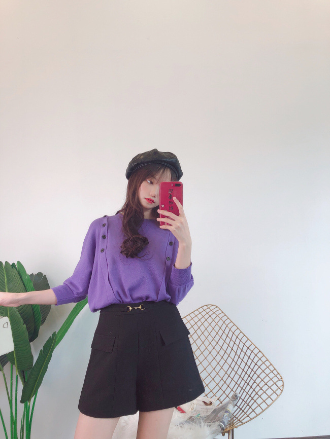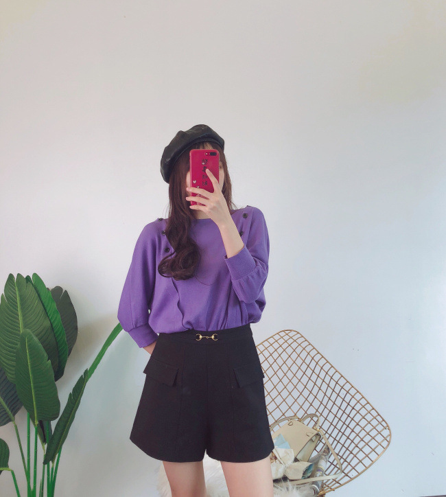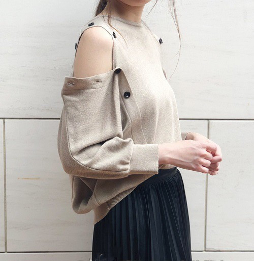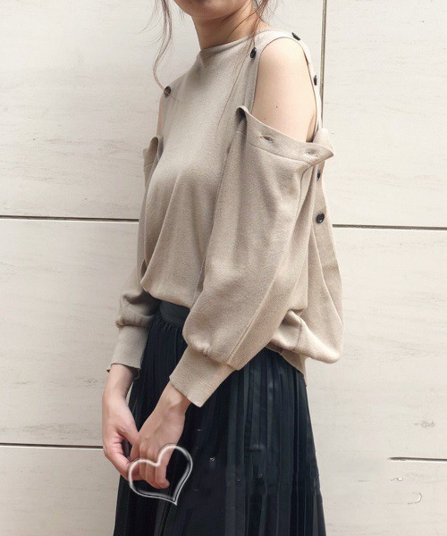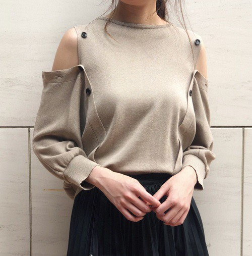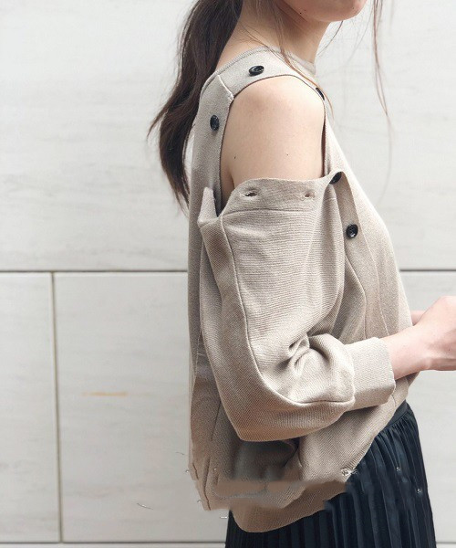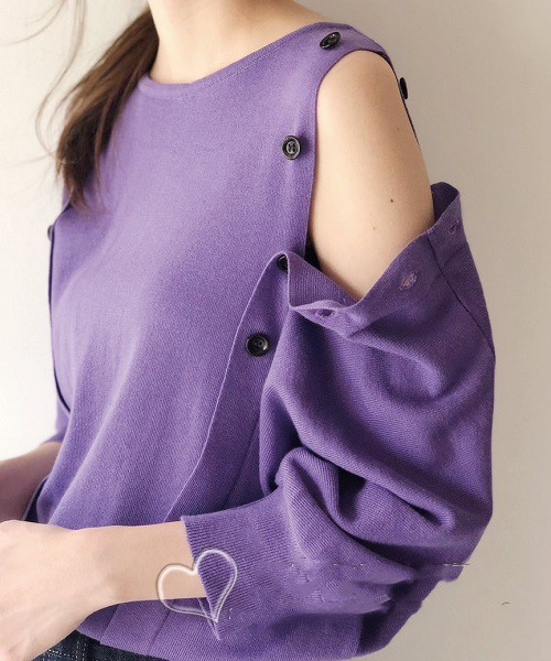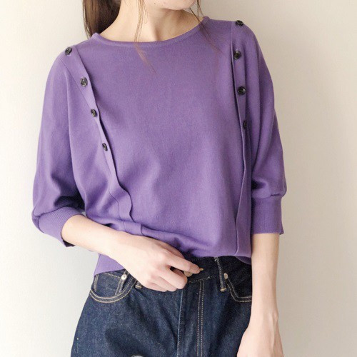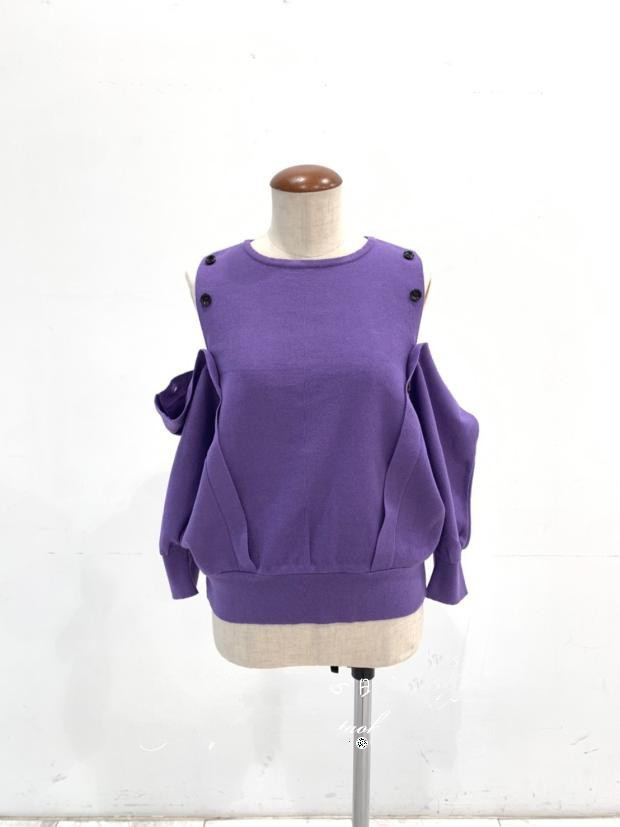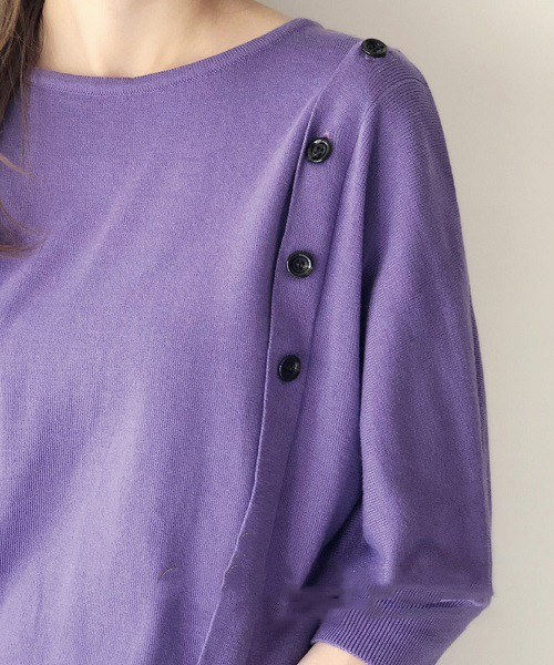 肌触りが心地よいシルク混の糸を使用した秋カラーのサマーニット。 肩部分のボタンを外すと、オープンショルダーになる 2WAYタイプのアイテムとなっております。 ベーシックカラーのベージュ・ブラックに加え シーズンカラーでもあるパープルの3色展開となります。 素材 絹50% レーヨン47% シルク3% サイズ 着丈 バスト 袖丈 F 53 112 46
