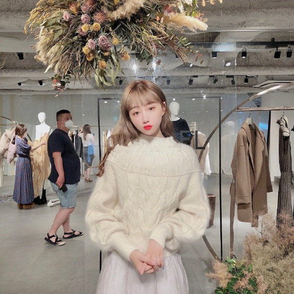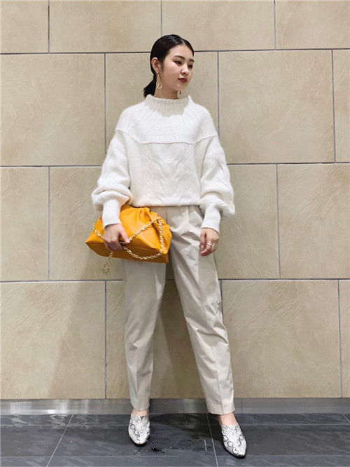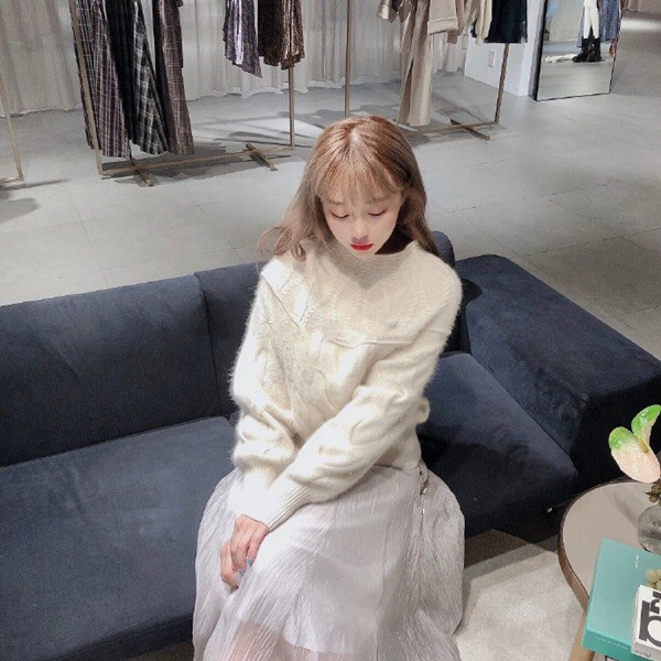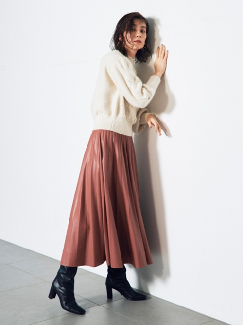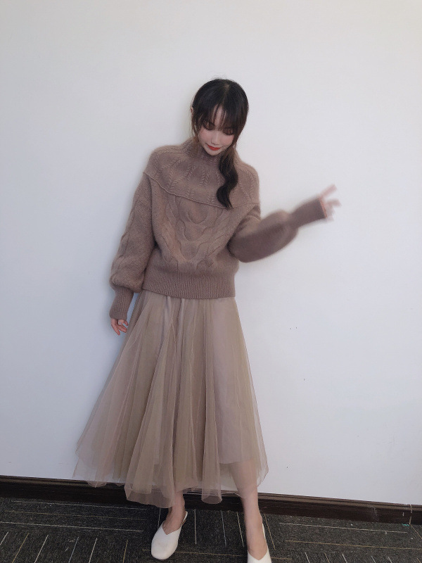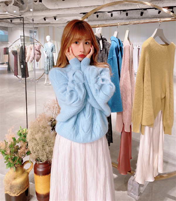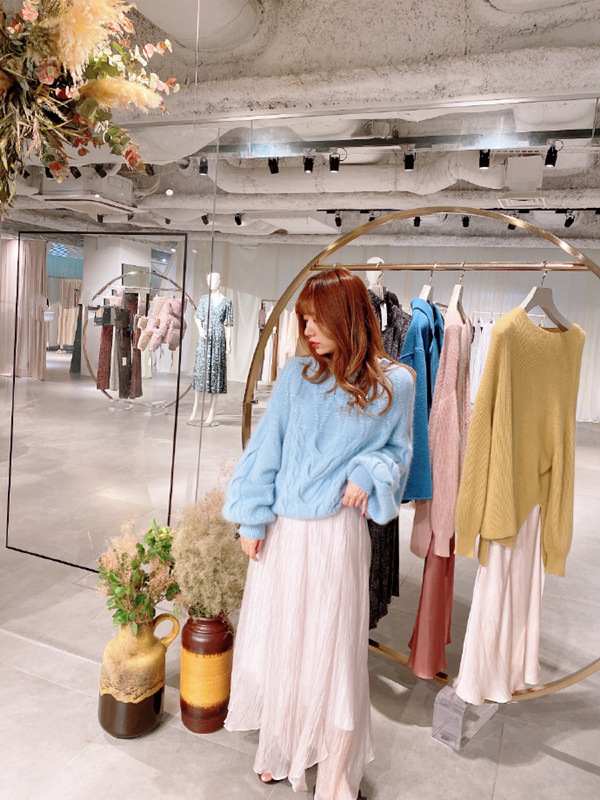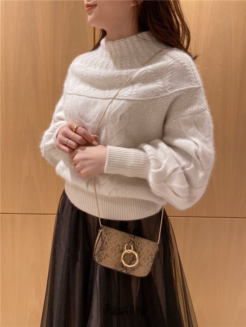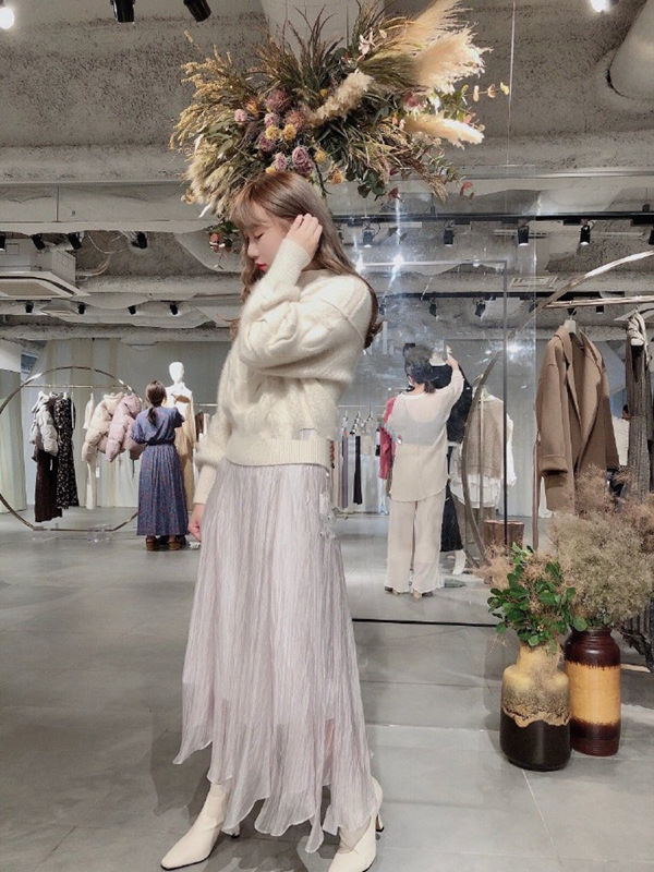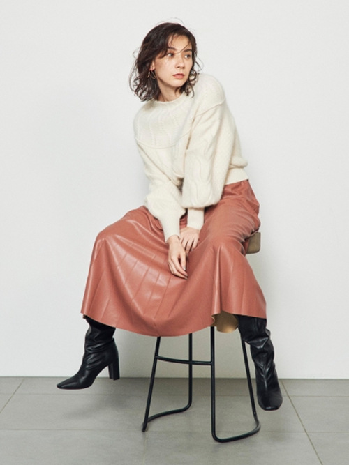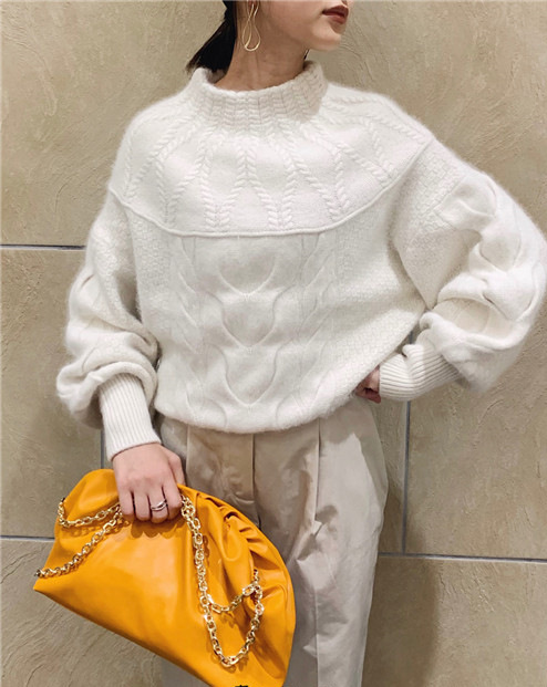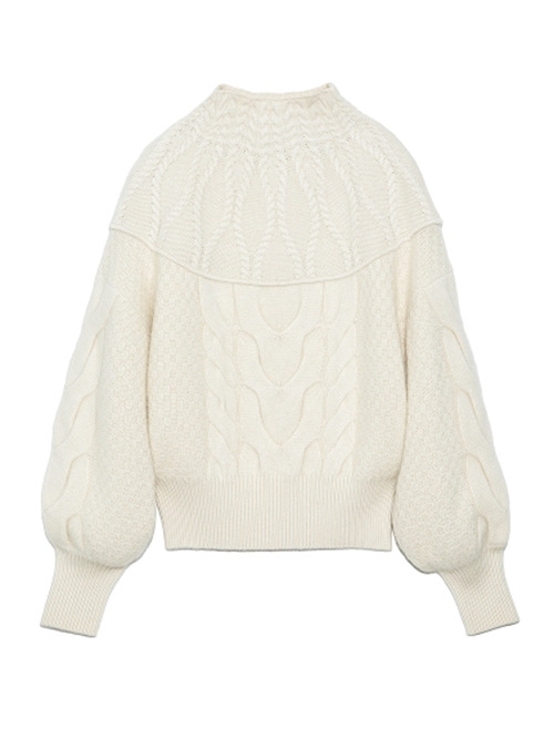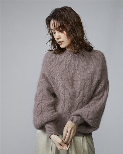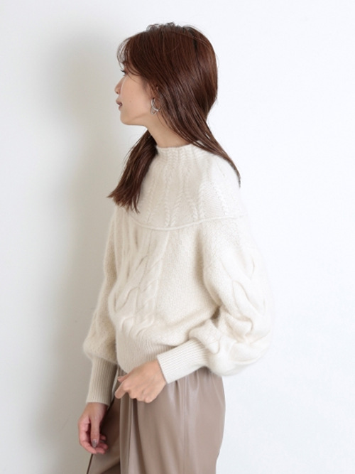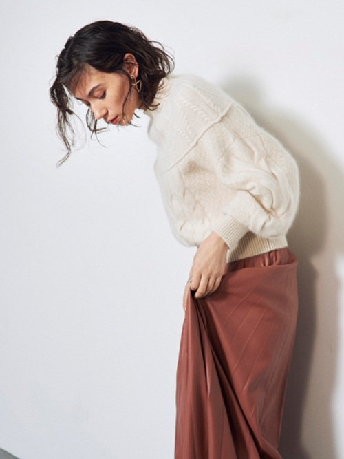 ふんわりとしたケーブル編みで、秋冬ならではの暖かみある立体感を表現したニット。やや広めのネックラインがデコルテに抜けを与え、カジュアルになり過ぎないようボリュームスリーブで女性らしいバランスを意識。首元から肩にかけて放射状の編み地を施すことで、身体の線が華奢に見えるよう工夫しました。パンツ合わせでデイリーに、艶のあるサテンやタイトスカート合わせでレディにと、シチュエーションに応じて様々なスタイリングが楽しめます。