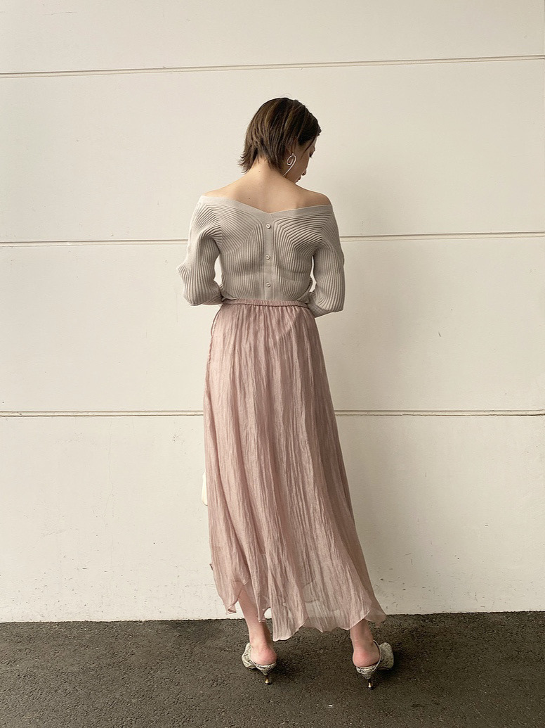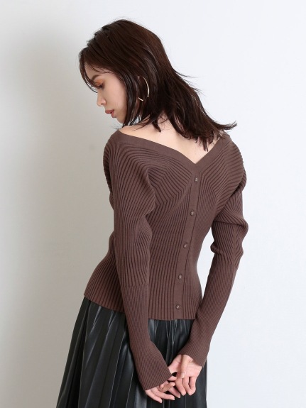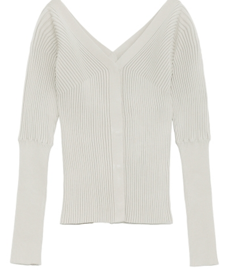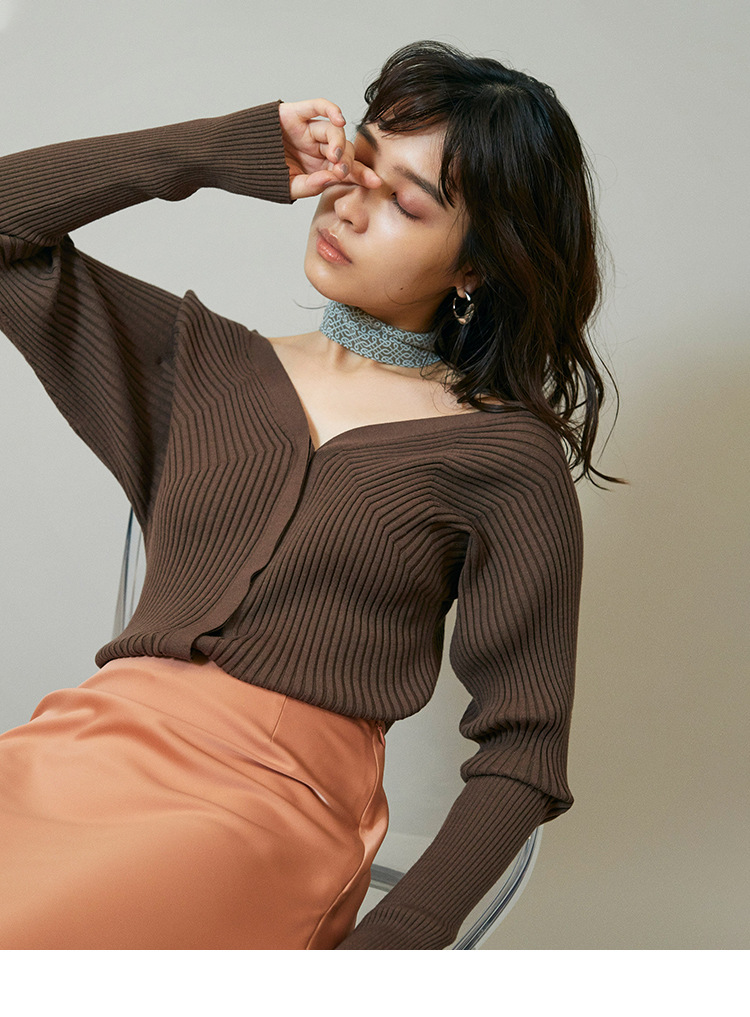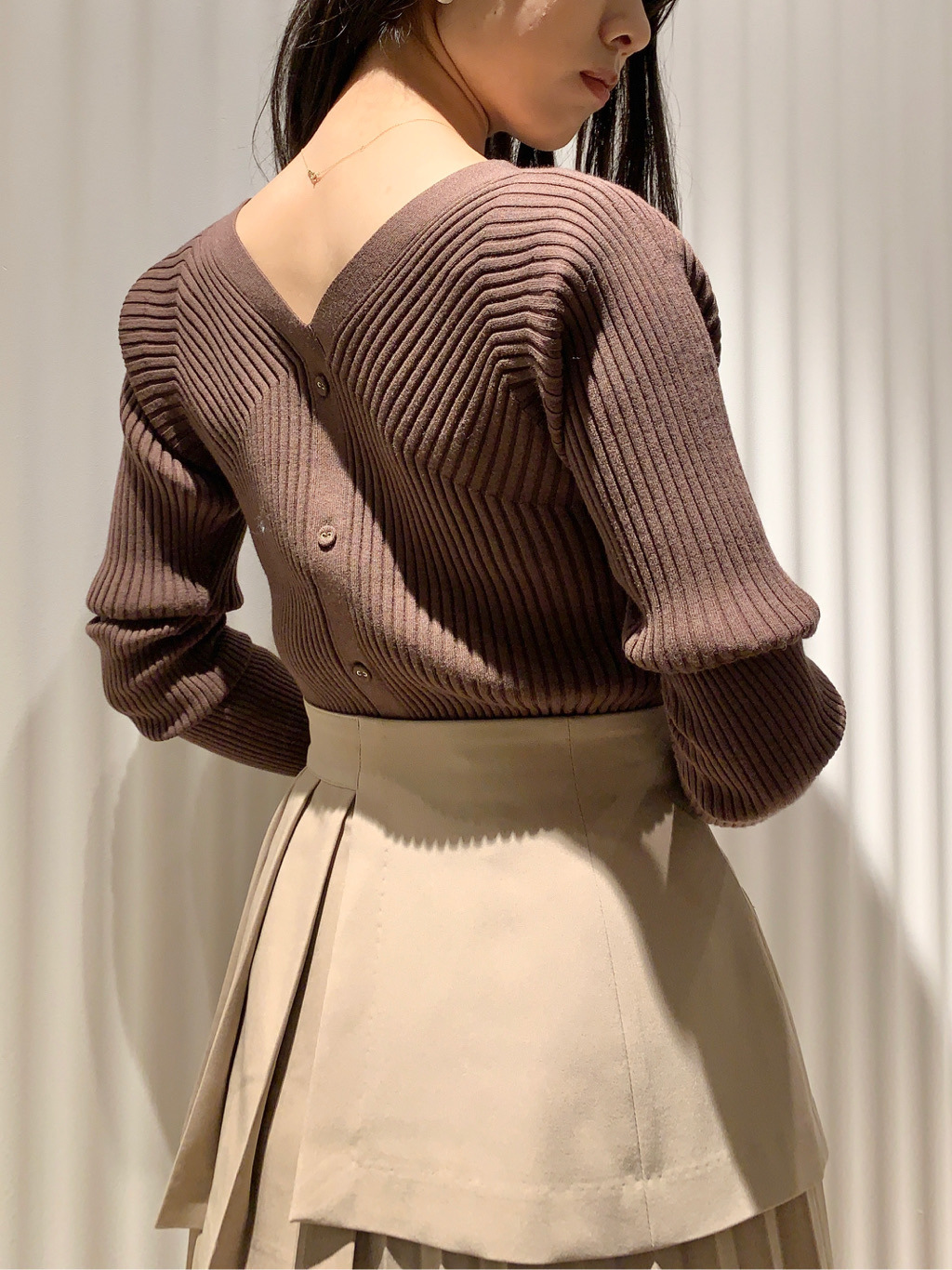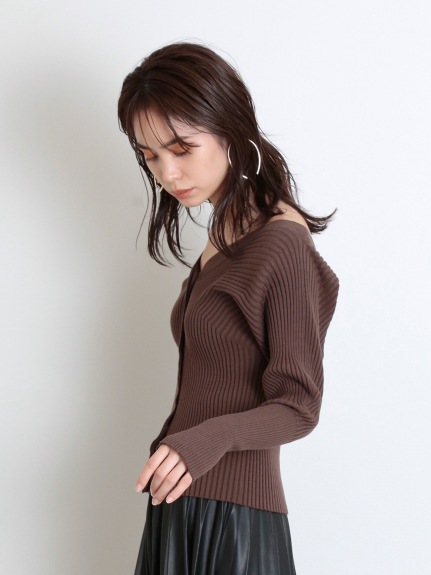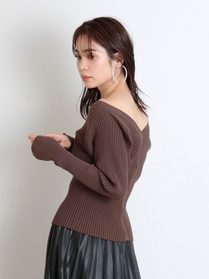 前後着用可能なオフショルダーカーディガン。大胆にカッティングしたネックラインがデコルテに艶を与え、色香纏う大人な装いを叶えます。フロントはボタンを隠す比翼デザインですっきりと仕上げ、コーディネートの邪魔をしないシンプルなデザインに。バックスタイルにはボタンをあしらい、フロントとは対照的な印象的な後ろ姿で、ギャップあるスタイリングを実現しました。ジャンパースカートのインナーやトップスとしても使い勝手のいい一枚です。