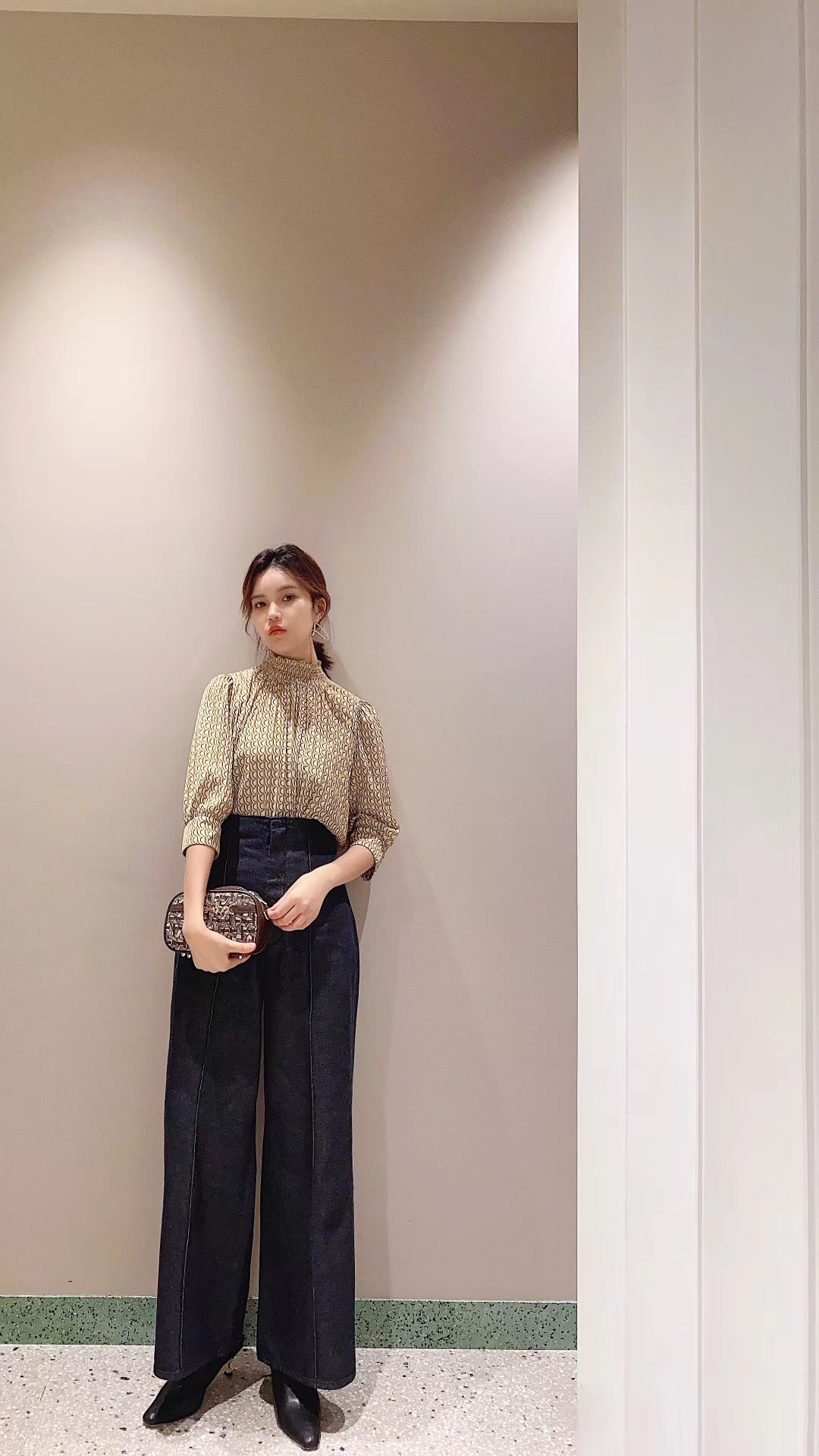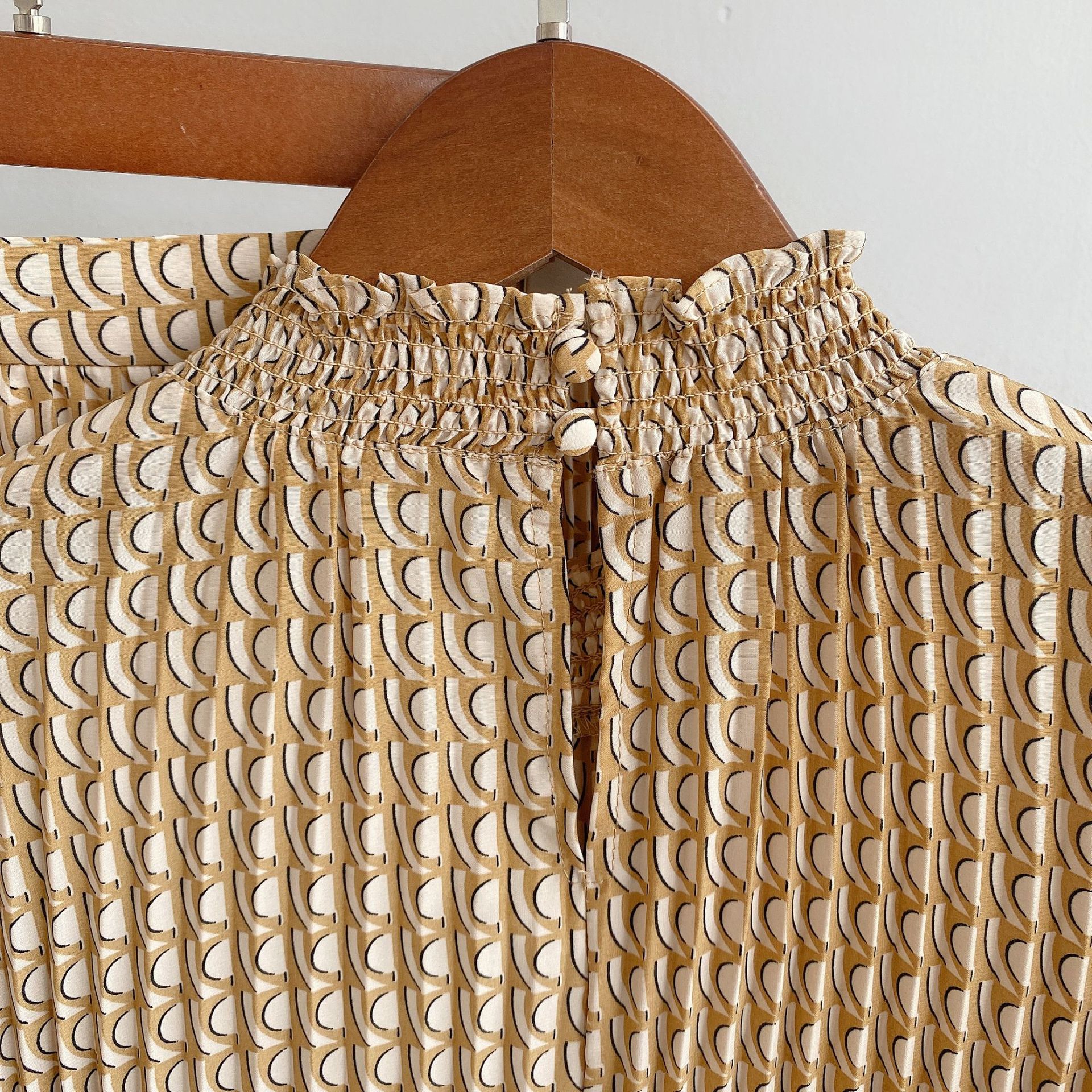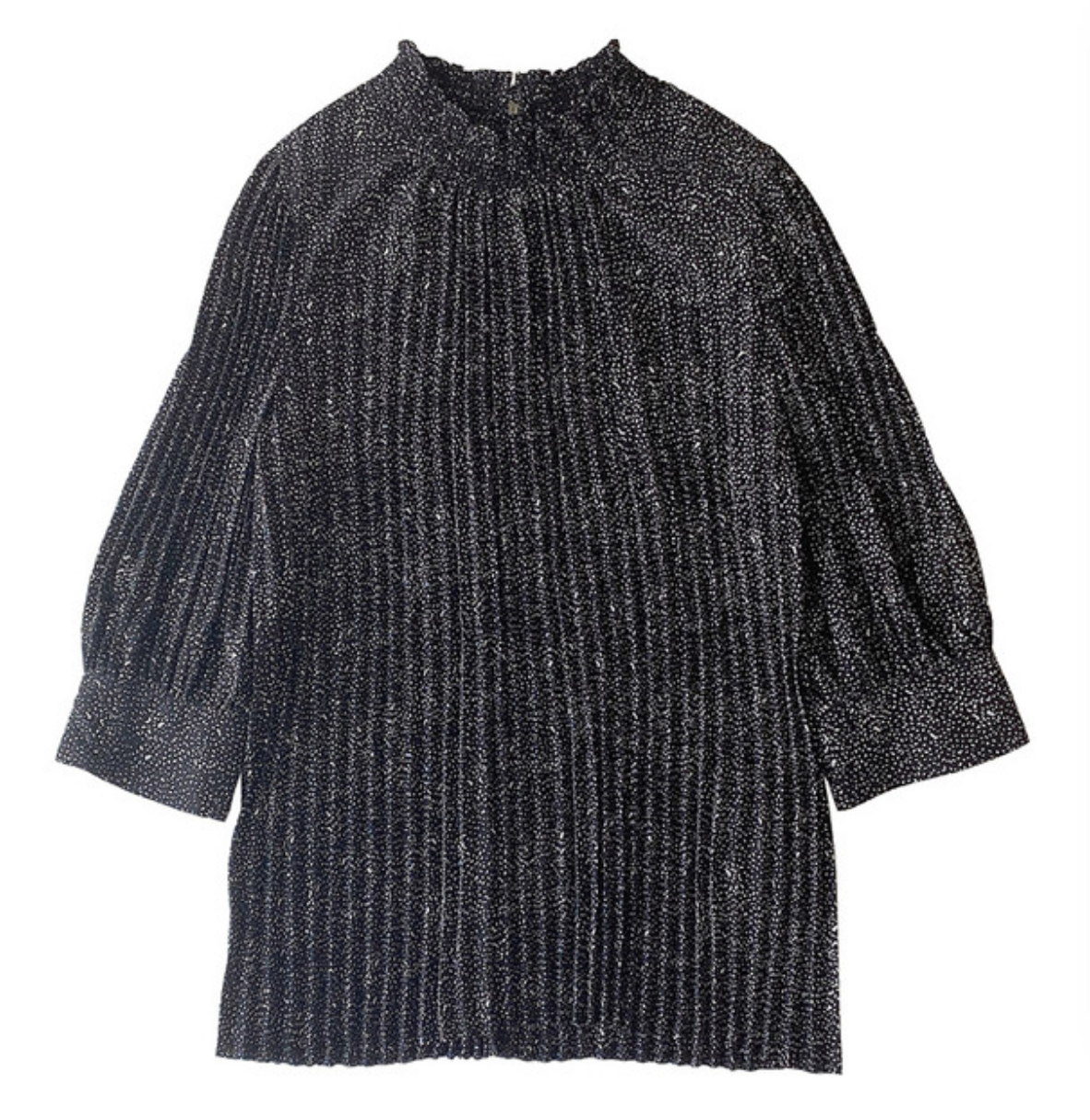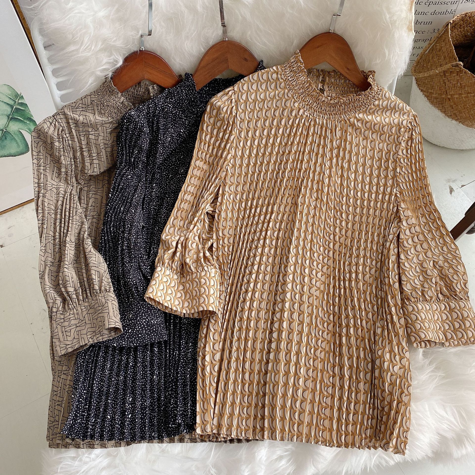 トレンドのモード柄や定番のドット柄でデザインした印象的なプリントブラウス。全体にあしらった細かなプリーツと落ち感のある艶やかな生地が、リュクスな雰囲気を高め奥行きある表情を醸します。シャーリングをあしらったスタンドカラーは、フェイスラインをすっきりと魅せノーブルな装いに。程良いサイズ感がリラックスな着心地を叶え、同シリーズのスカートを合わせればワンピースのような着こなしも楽しめます。