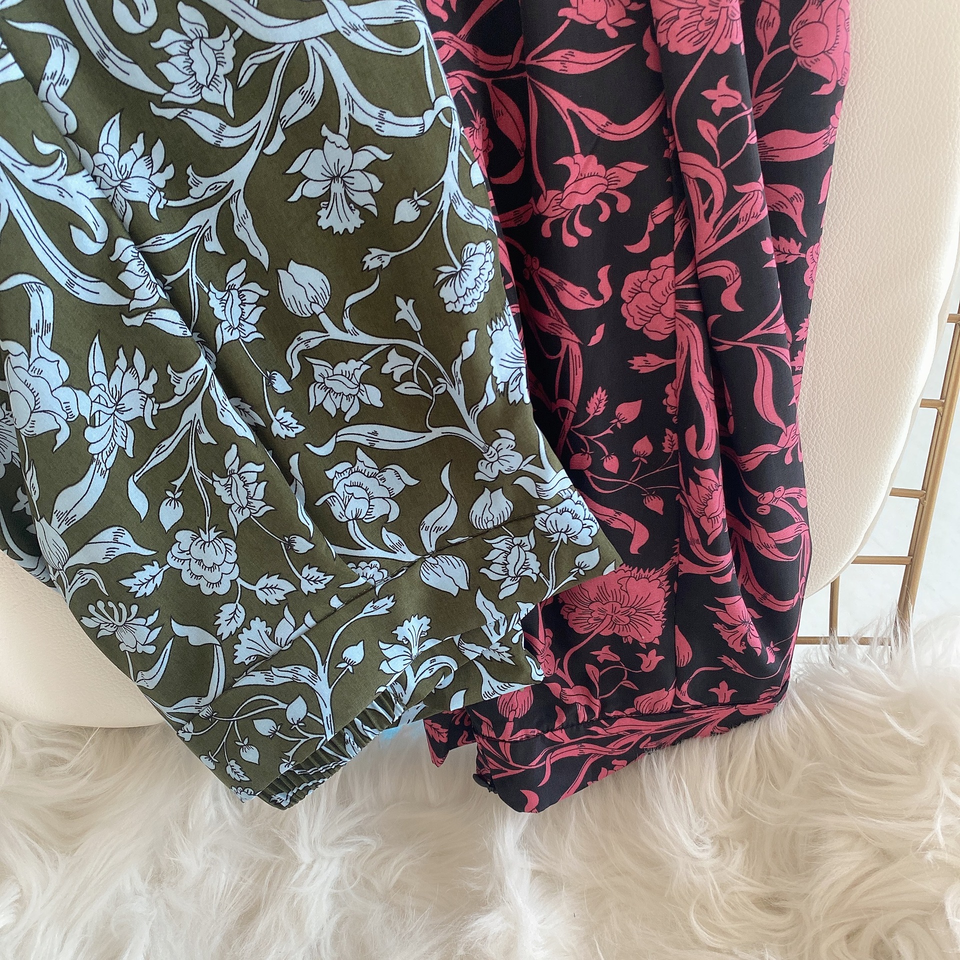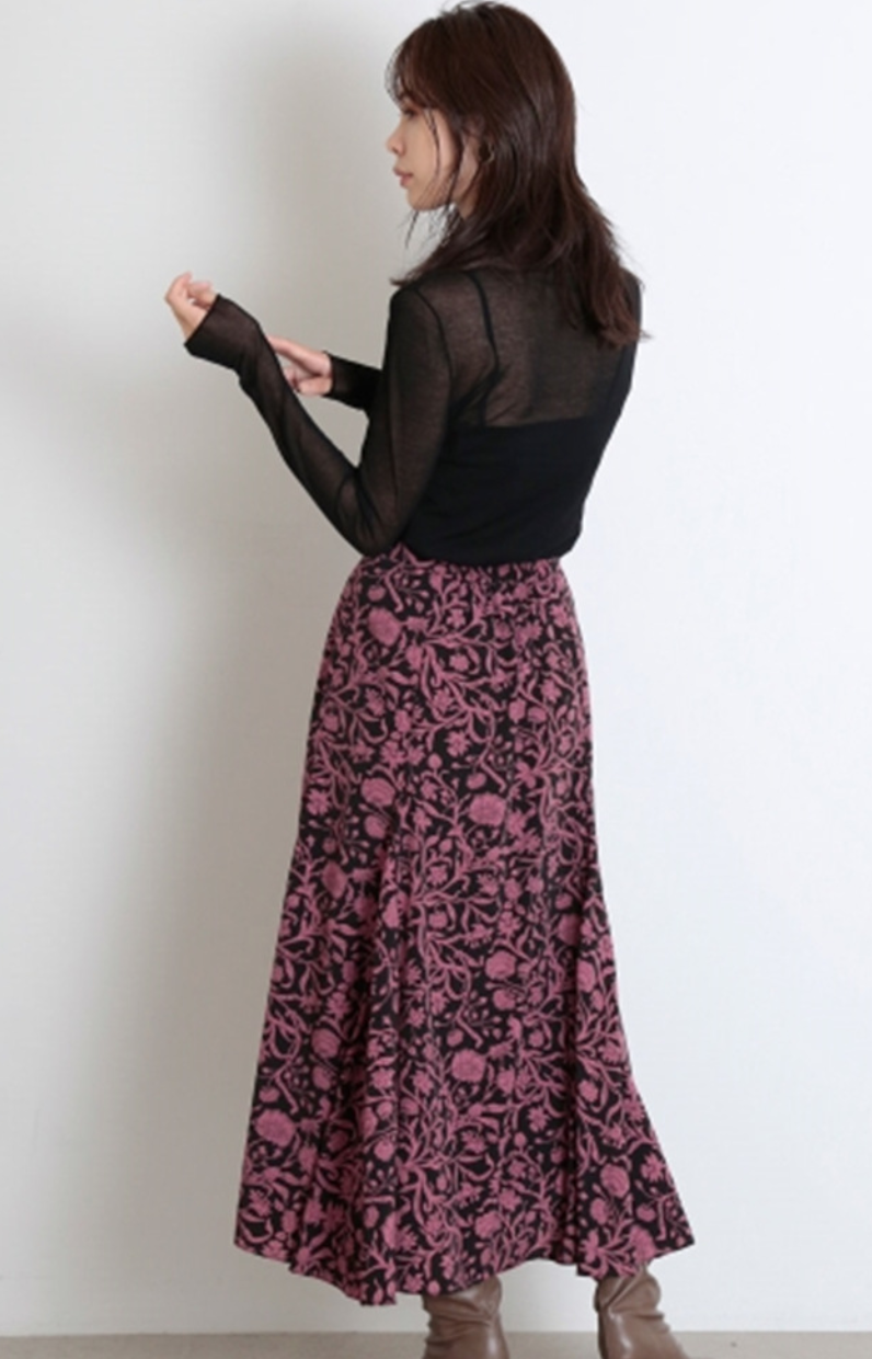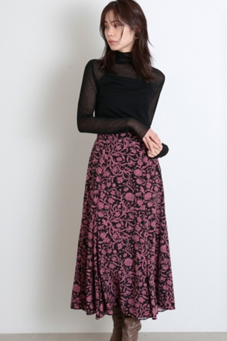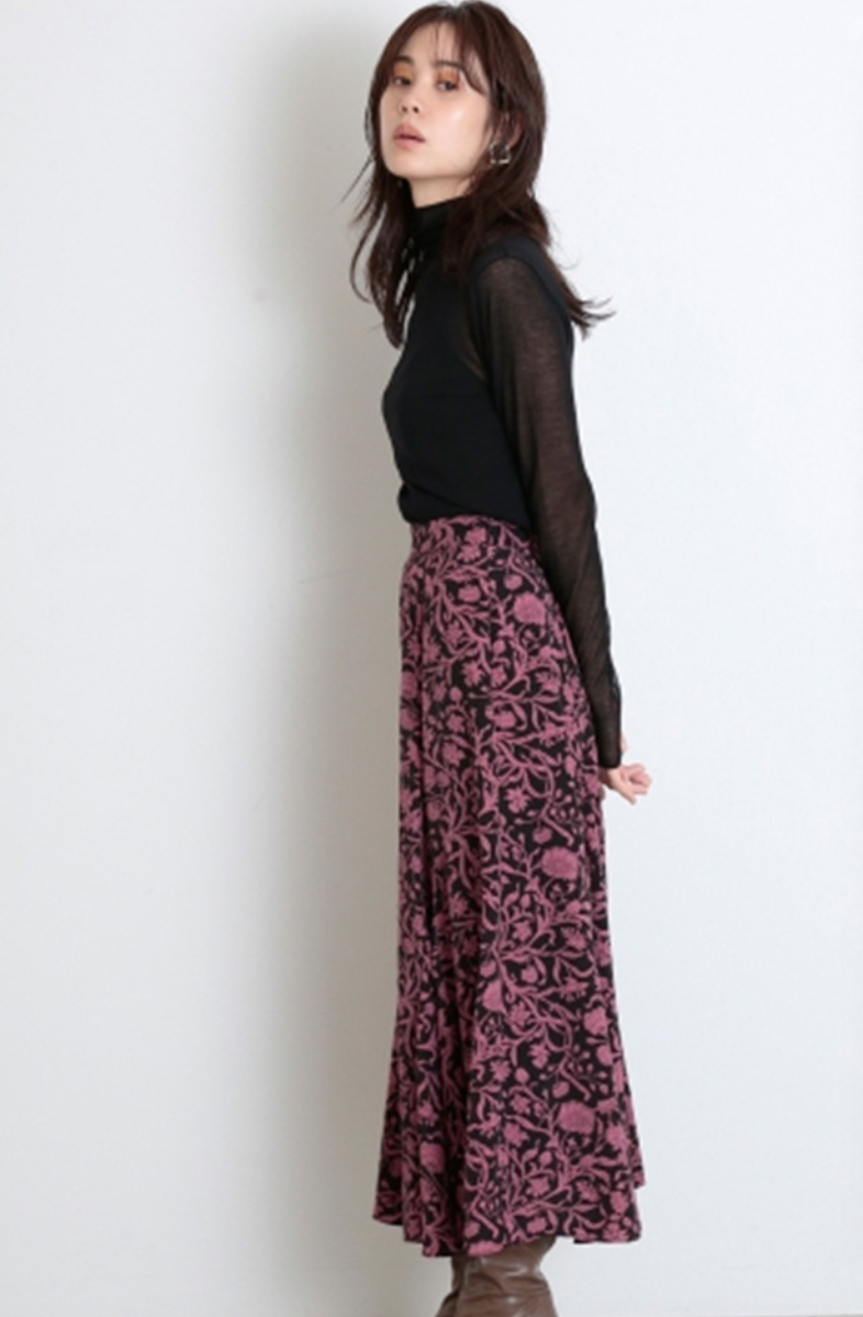 大人のロマンティックを叶えてくれる「リバティ」と「SNIDEL」とのコラボレーションライン。クラシカルな花柄が大人ムードを引き立てるロングスカートは、身体のラインを美しく魅せるナローシルエット。腰周りはすっきりと、裾にかけて可憐なフレアを描き、歩く度に揺れるドラマティックな表情で柔らかさを表現しました。後ろウエストゴムで穿き心地も良く、軽やかなルックスは様々なトップスと好相性です