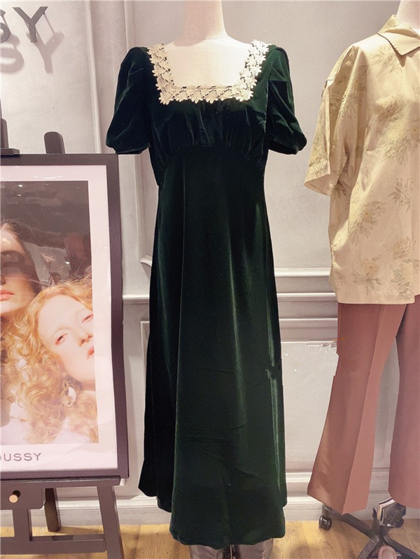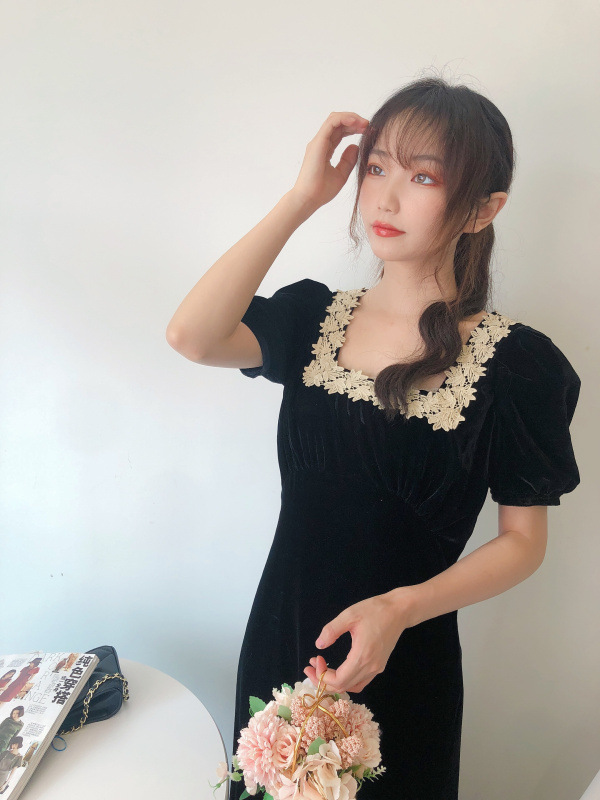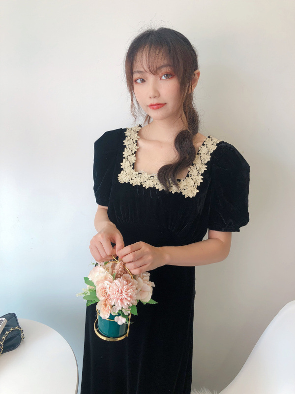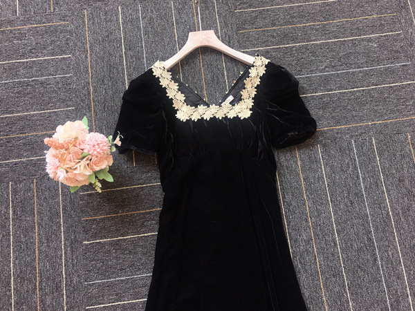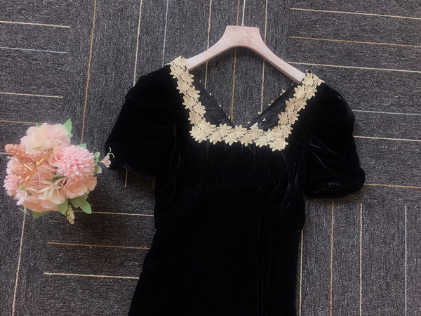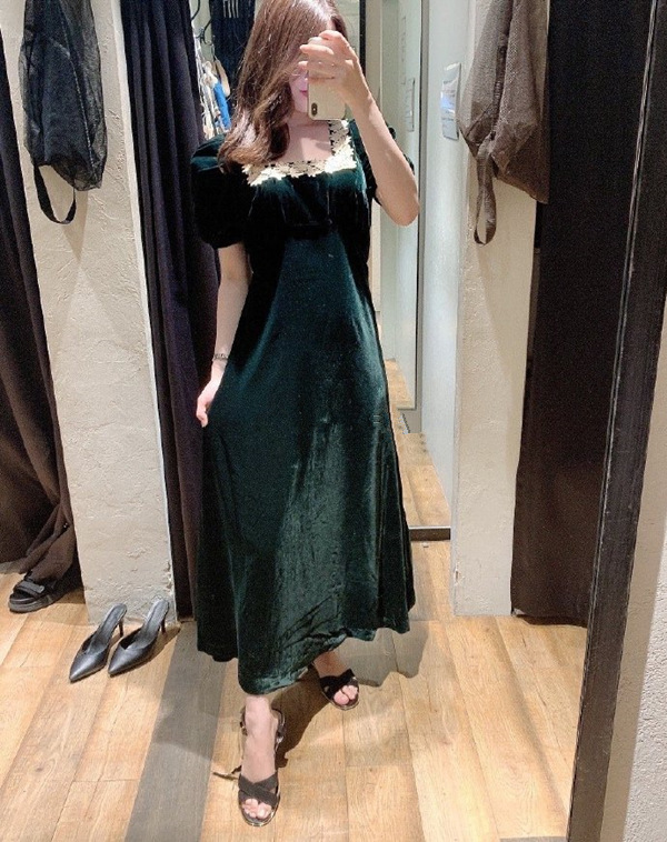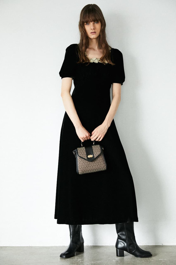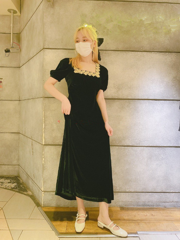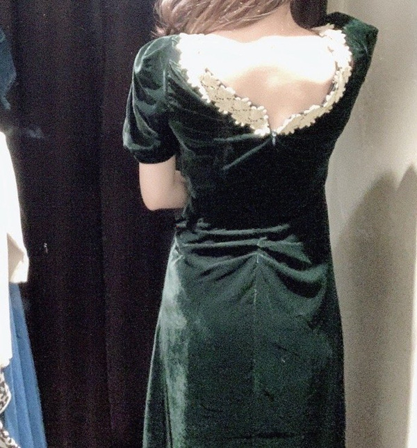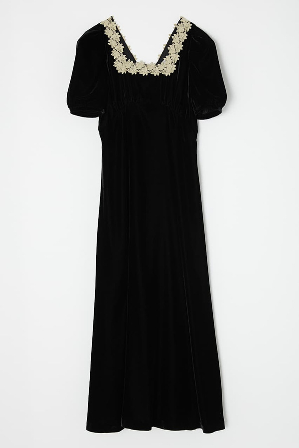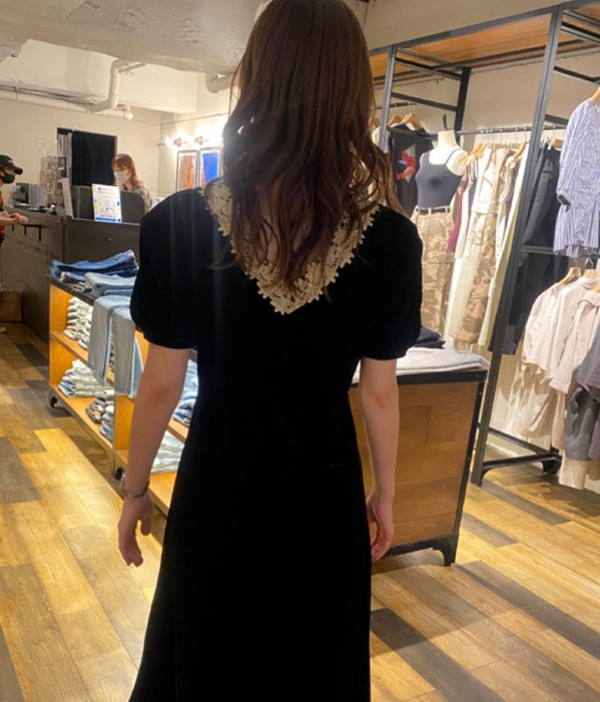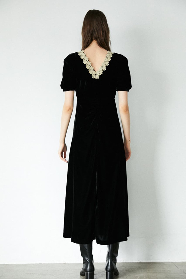 胸元のレースがポイントのヴィンテージ感漂うDRESS。女性らしくしなやかな、ドレープのシルエットにこだわったアイテムです。高級感のあるベロア素材でどこかヴィンテージな雰囲気に仕上げました。 素材 : (表地)本体:ポリエステル100、レース部分:ポリエステル100、(裏地)ポリエステル100 サイズ 着丈 バスト 肩幅 ウエスト 袖丈 S 124 84-86 31 66 24 M 126 88-90 32 70 25