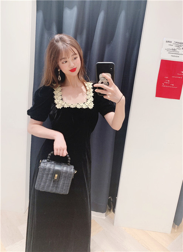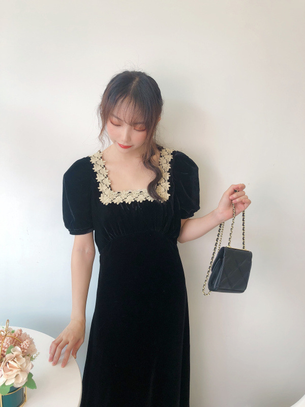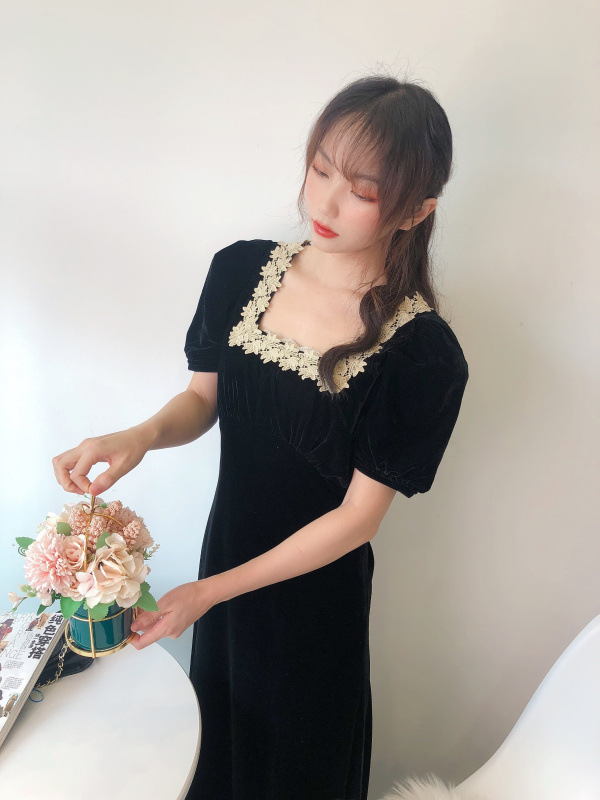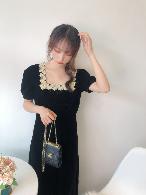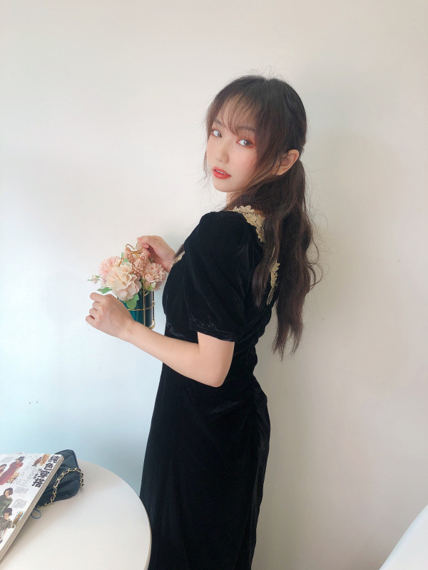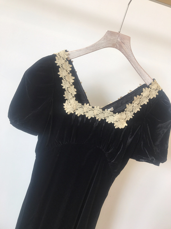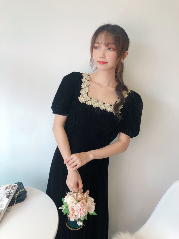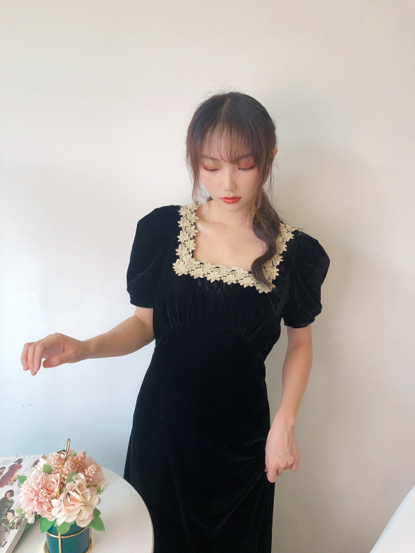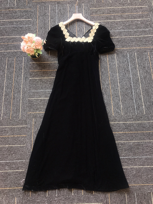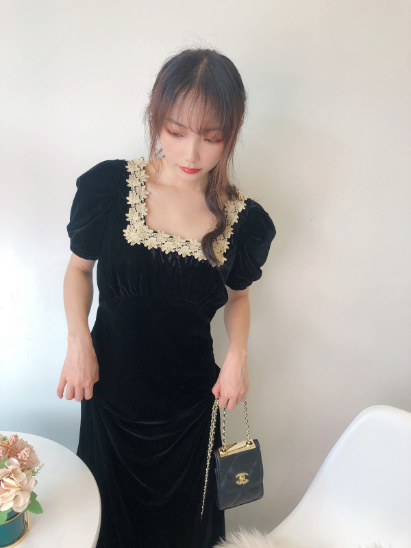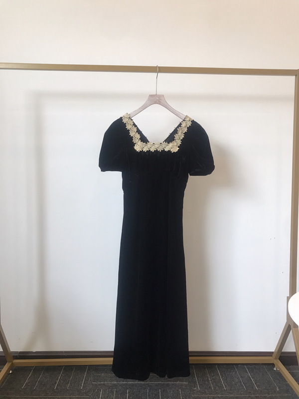 胸元のレースがポイントのヴィンテージ感漂うDRESS。女性らしくしなやかな、ドレープのシルエットにこだわったアイテムです。高級感のあるベロア素材でどこかヴィンテージな雰囲気に仕上げました。 素材 : (表地)本体:ポリエステル100、レース部分:ポリエステル100、(裏地)ポリエステル100 サイズ 着丈 バスト 肩幅 ウエスト 袖丈 S 124 84-86 31 66 24 M 126 88-90 32 70 25