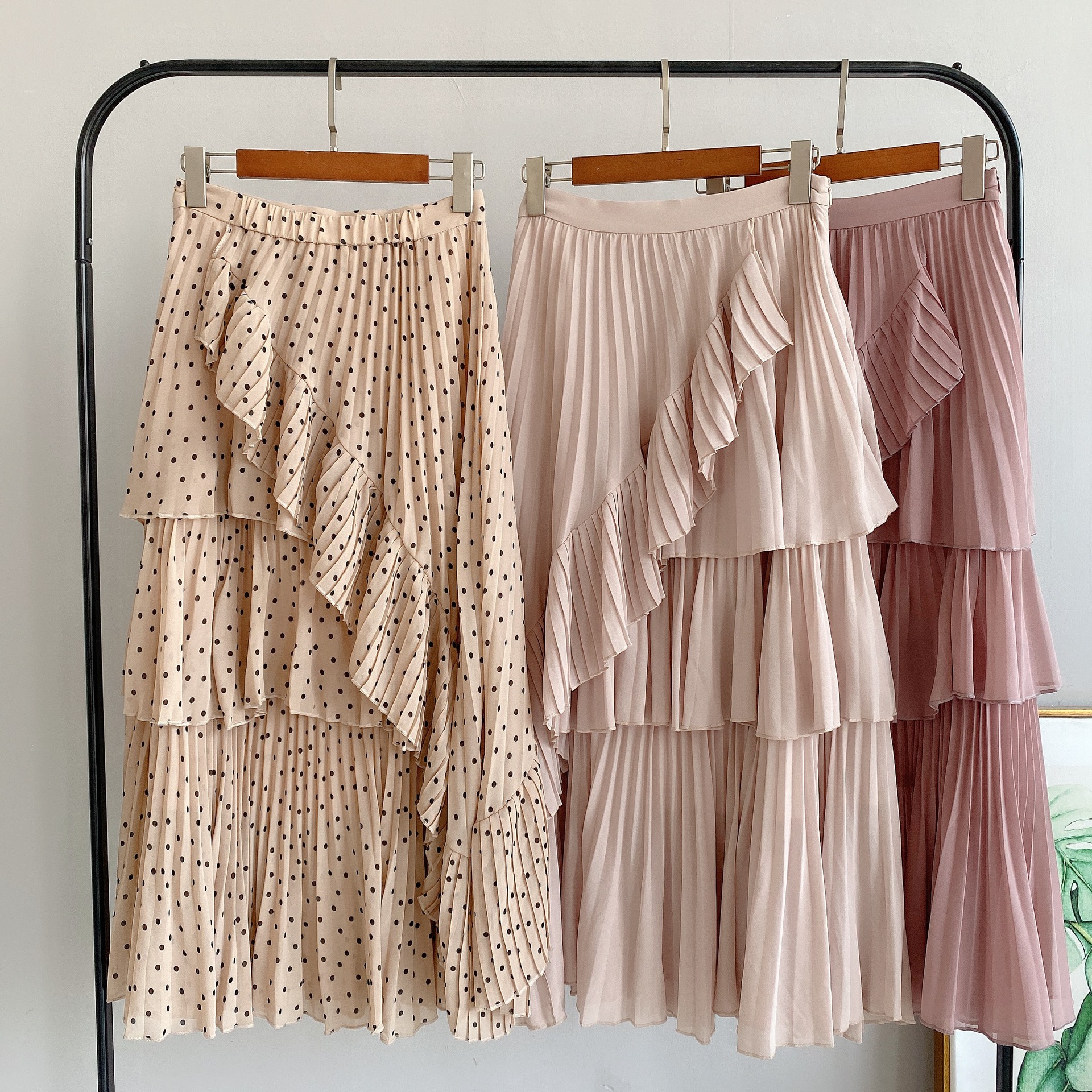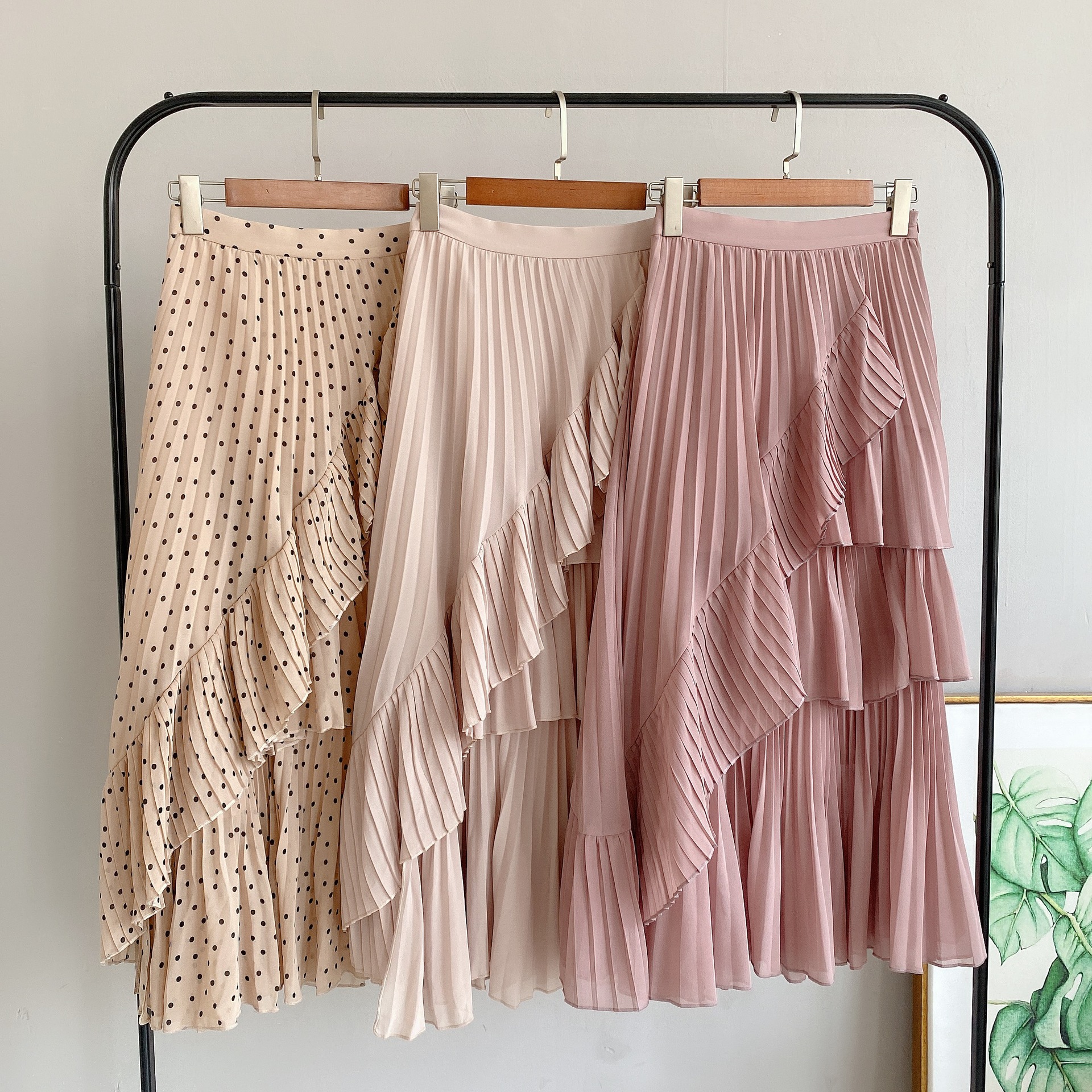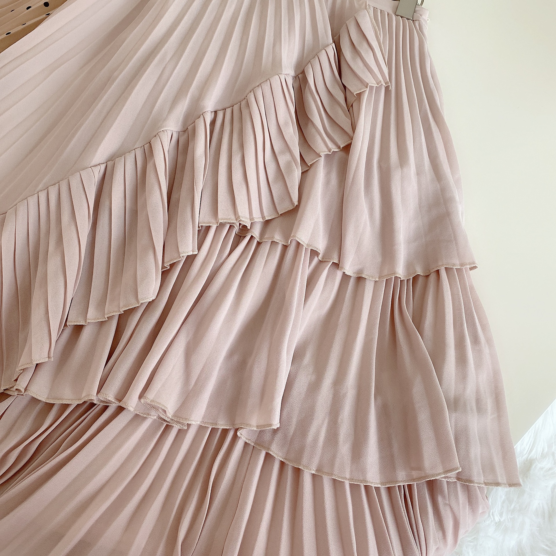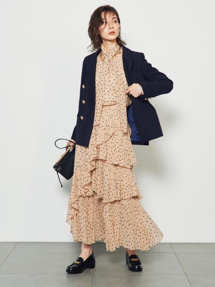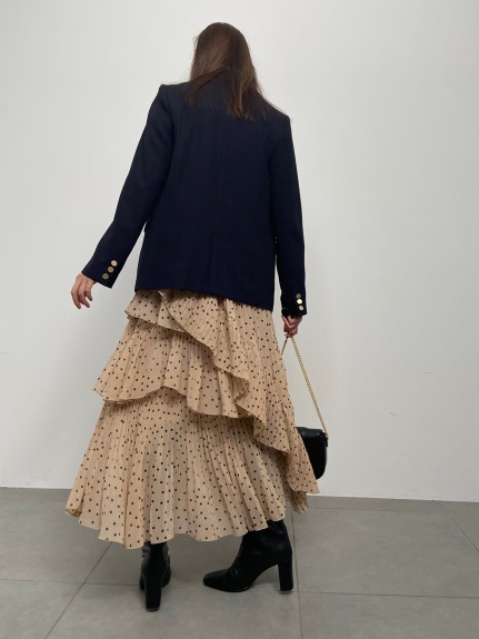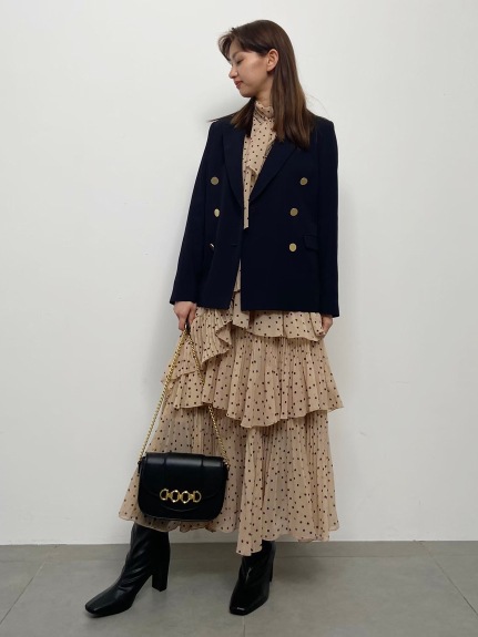 軽やかなシフォン生地を使用した、幾重にも重ねたティアードが女性らしさを醸すボリュームスカート。柔らかな生地を使用することで着膨れを防ぎ、縦ラインも強調できる絶妙なシルエットで仕上げました。2種類のプリーツを贅沢にあしらい、斜めにあしらったフリルやアシンメトリーデザインで、愛らしさの中にモードなエッセンスをプラス。エアリーなフォルムが歩く度に揺れ、ロマンティックなシルエットを描きます。オーバーサイズニットやスウェットなどを合わせた、ミックスコーディネートがおすすめです。