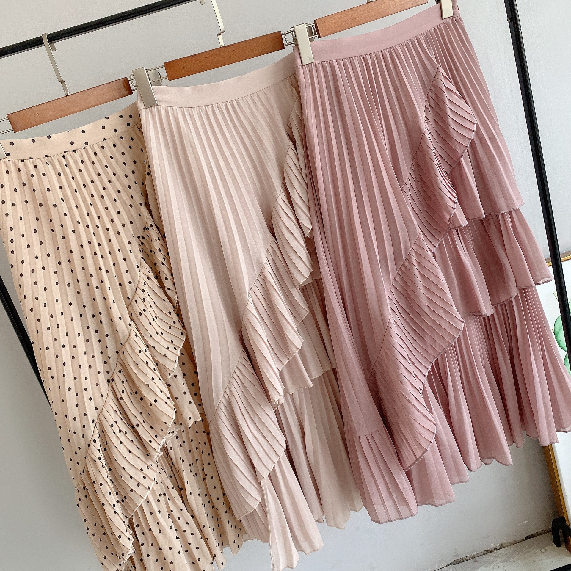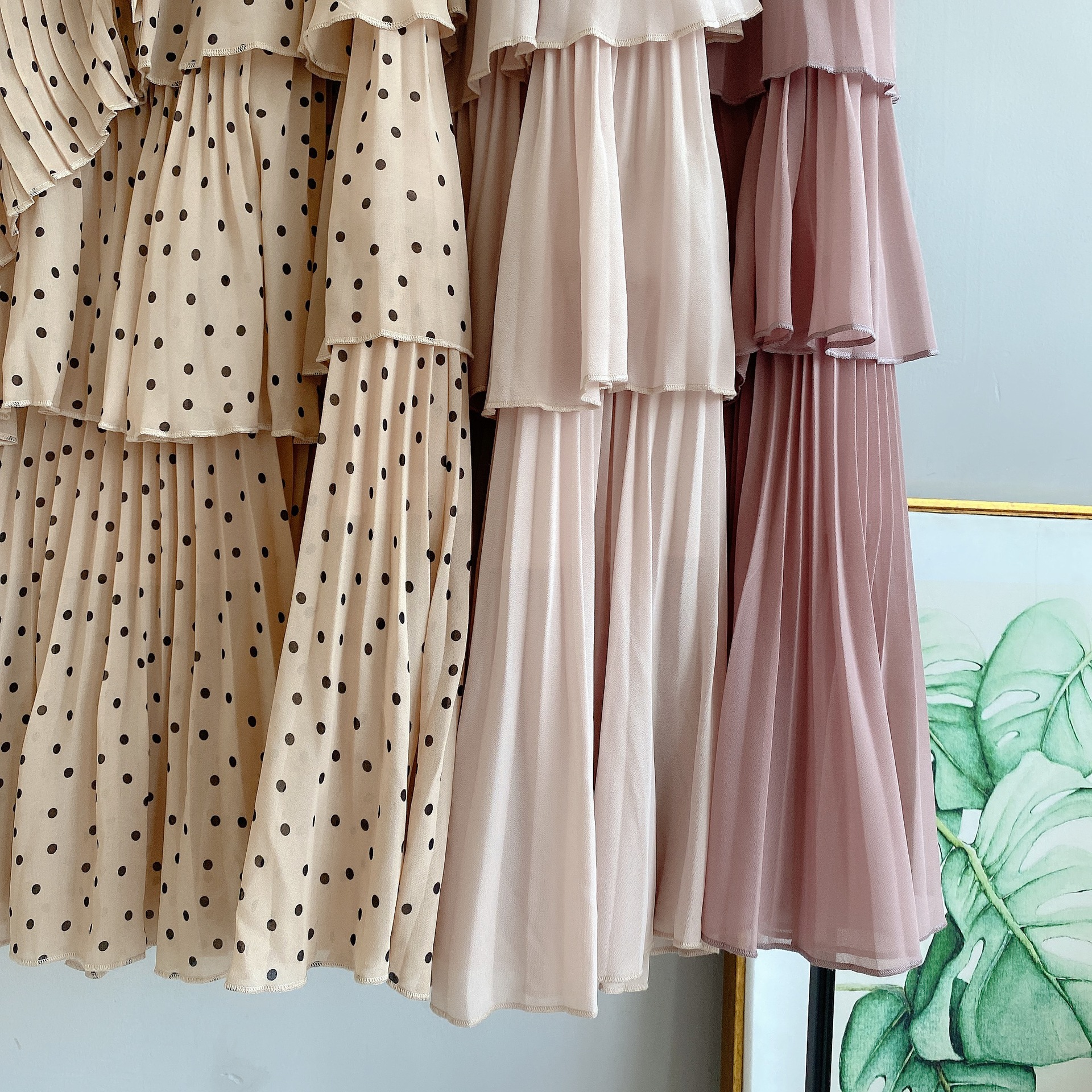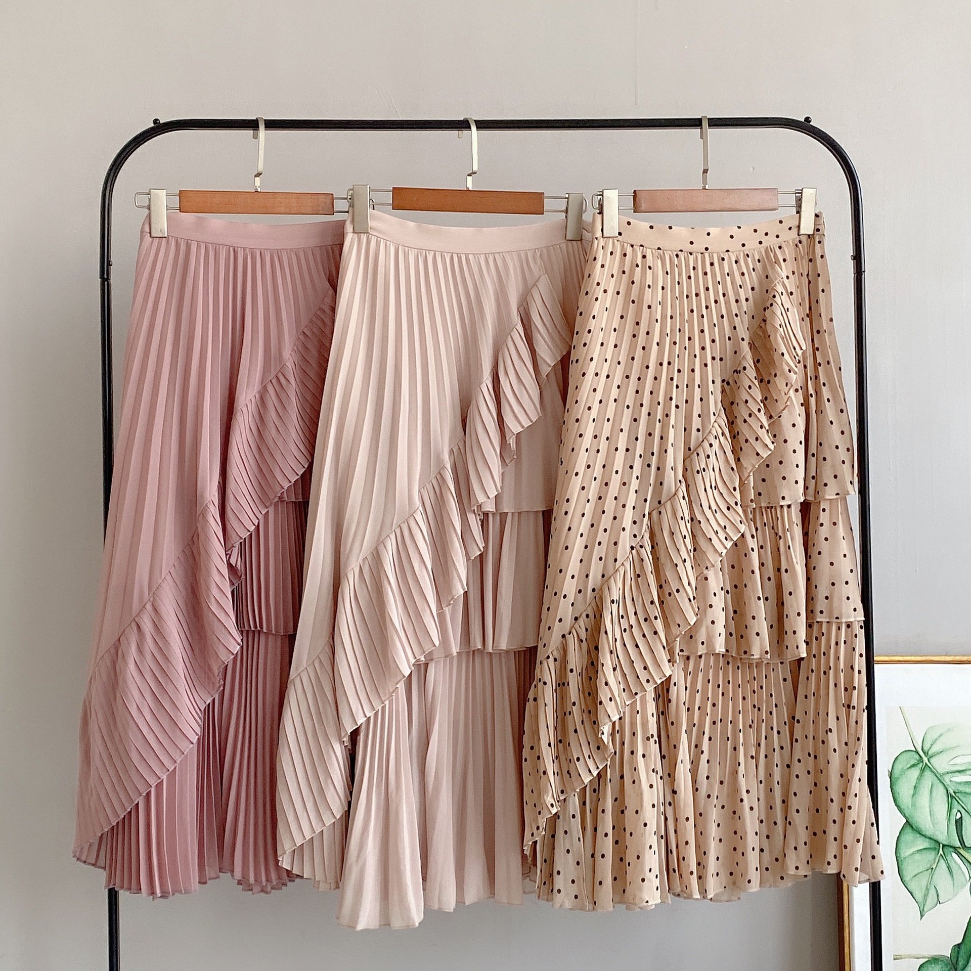軽やかなシフォン生地を使用した、幾重にも重ねたティアードが女性らしさを醸すボリュームスカート。柔らかな生地を使用することで着膨れを防ぎ、縦ラインも強調できる絶妙なシルエットで仕上げました。2種類のプリーツを贅沢にあしらい、斜めにあしらったフリルやアシンメトリーデザインで、愛らしさの中にモードなエッセンスをプラス。エアリーなフォルムが歩く度に揺れ、ロマンティックなシルエットを描きます。オーバーサイズニットやスウェットなどを合わせた、ミックスコーディネートがおすすめです。