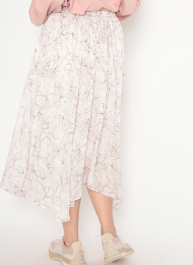 手書き風の花柄がキャッチーなプリントスカート。 プリーツとアシンメトリーの裾がアクセントに引き立つ、女性らしさのあるデザインです。 コンパクトなトップはもちろん、ゆったりとしたルーズニットとの相性もよく、コーディネートの幅が広がります。 素材 表地・裏地:ポリエステル100% サイズ表記 総丈 ウエスト(ゴムあり) ヒップ F 70/85cm 64-82cm 96cm