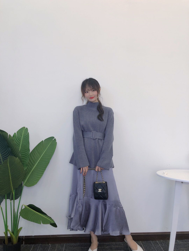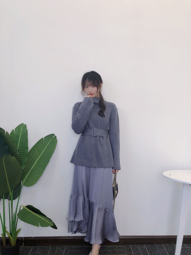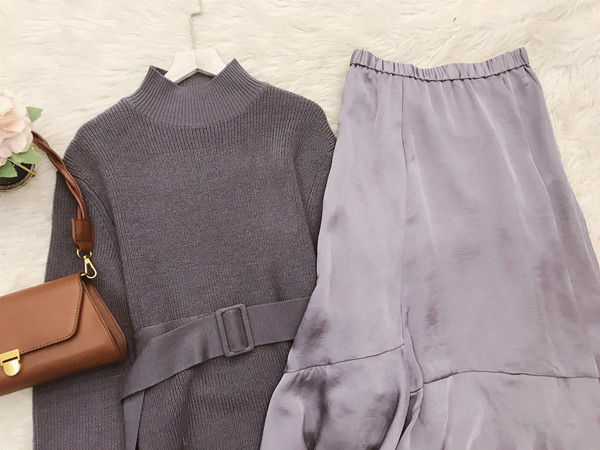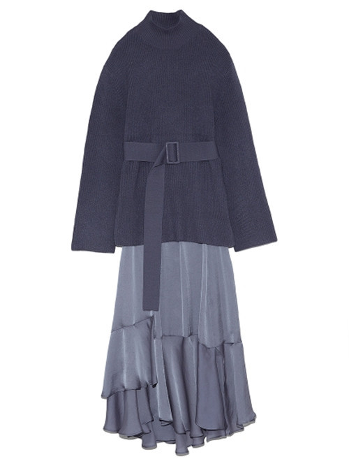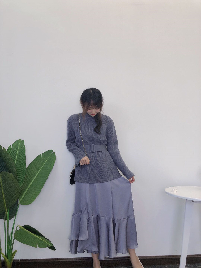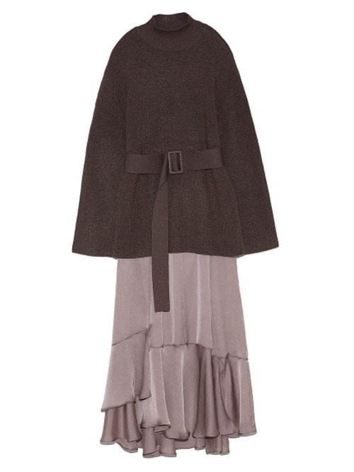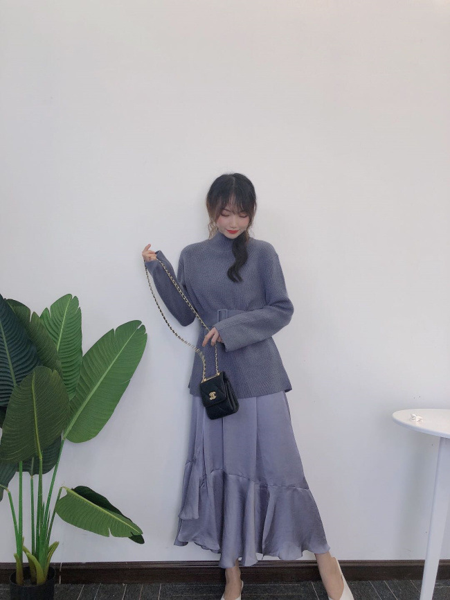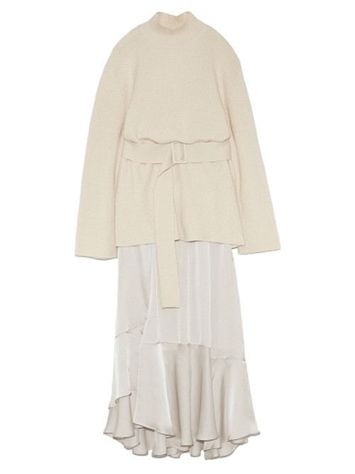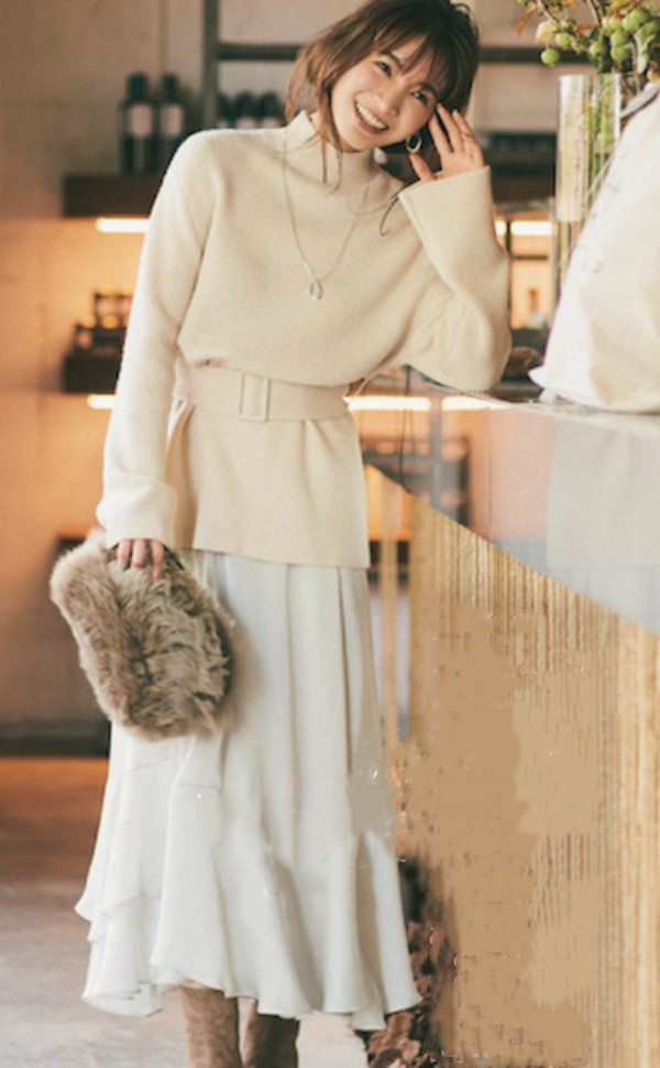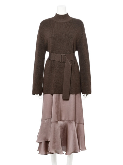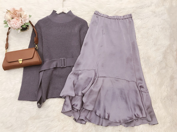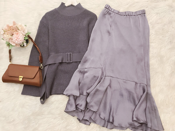 やわらかなハイネックニットトップスと揺れる裾が華やかなアシンメトリースカートのセットアップは、それぞれ単品でも着用可能なデザインです。