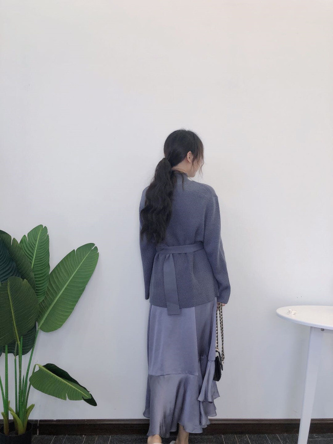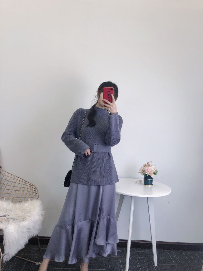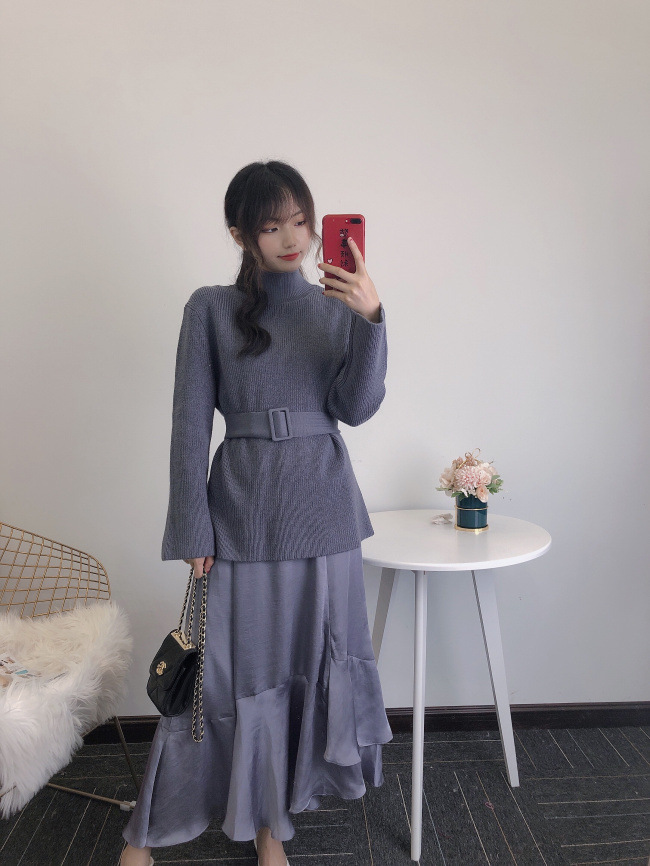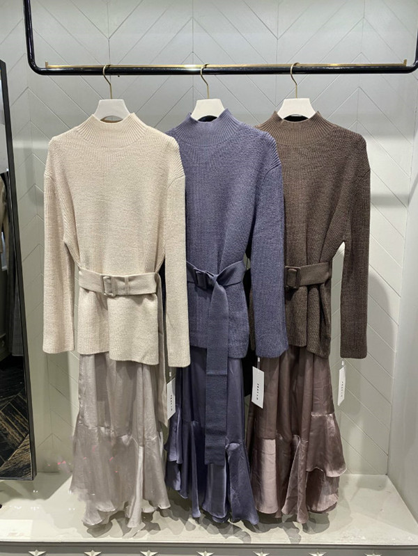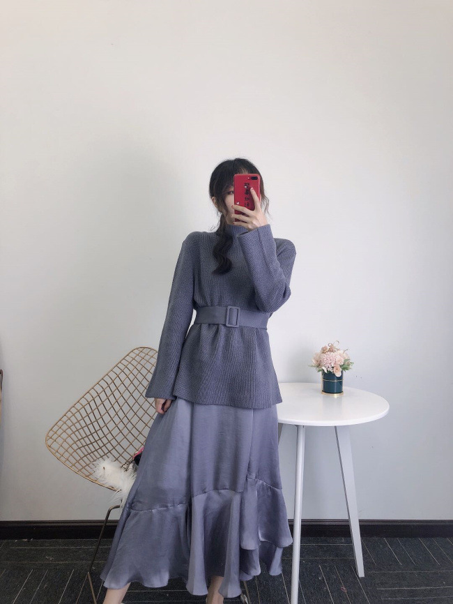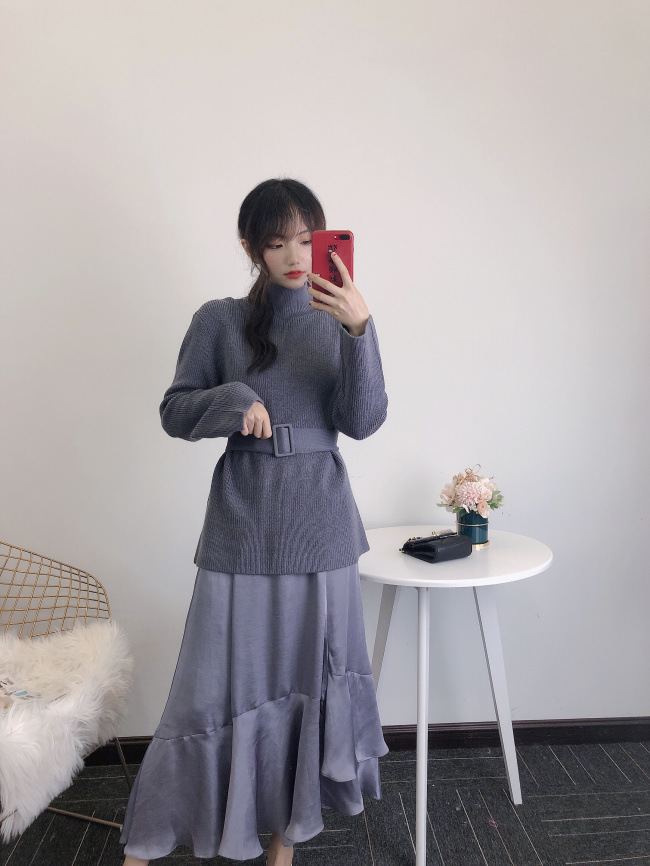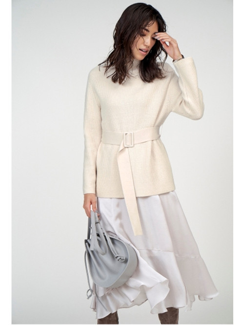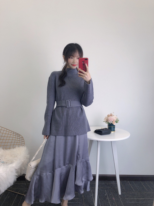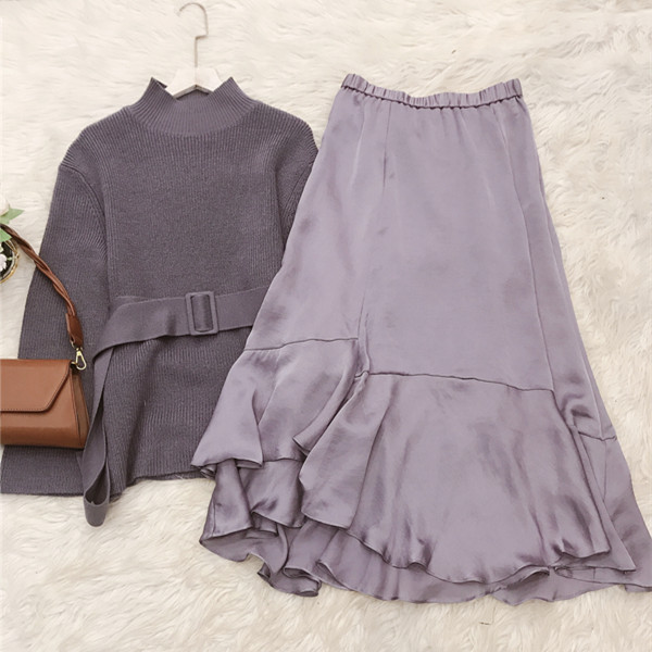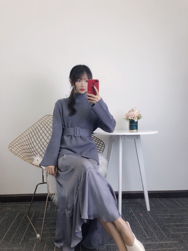 やわらかなハイネックニットトップスと揺れる裾が華やかなアシンメトリースカートのセットアップは、それぞれ単品でも着用可能なデザインです。