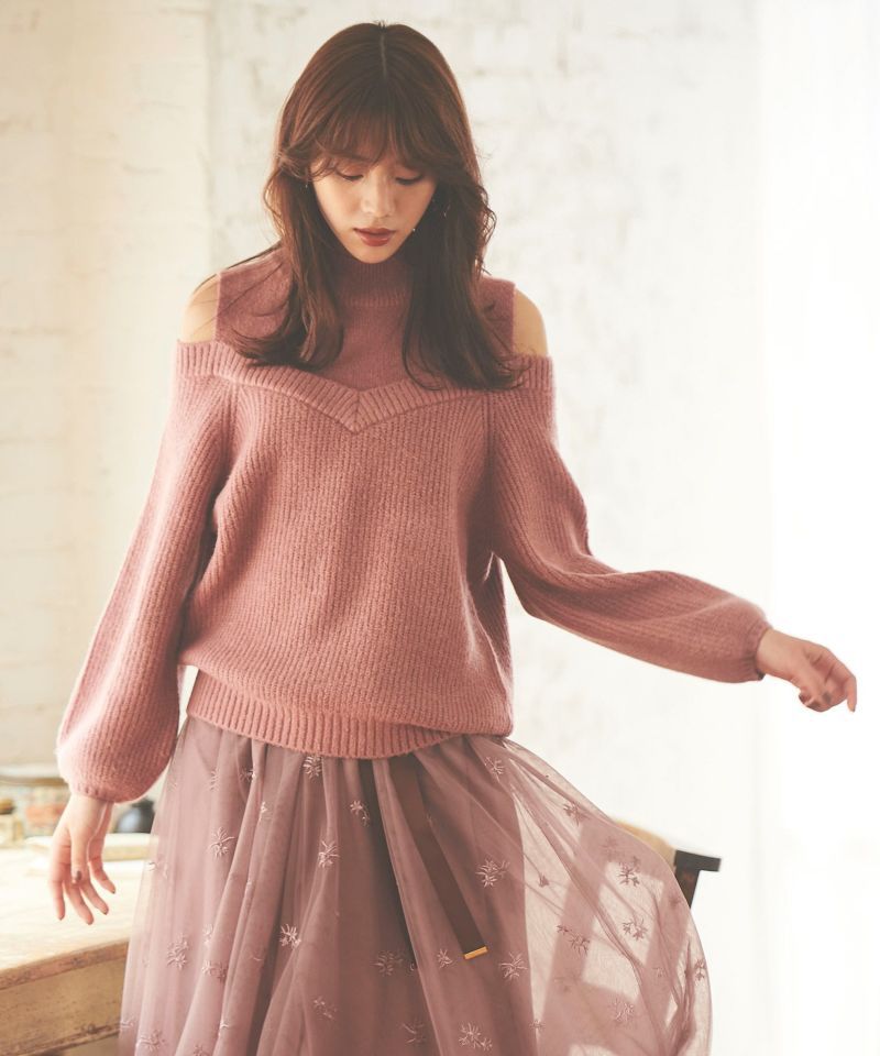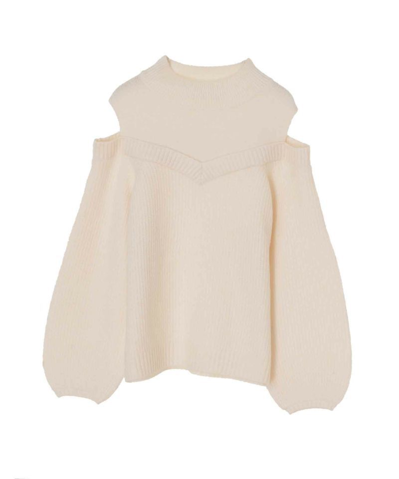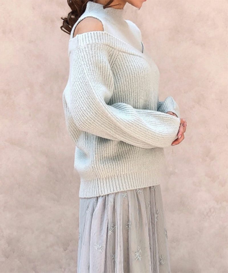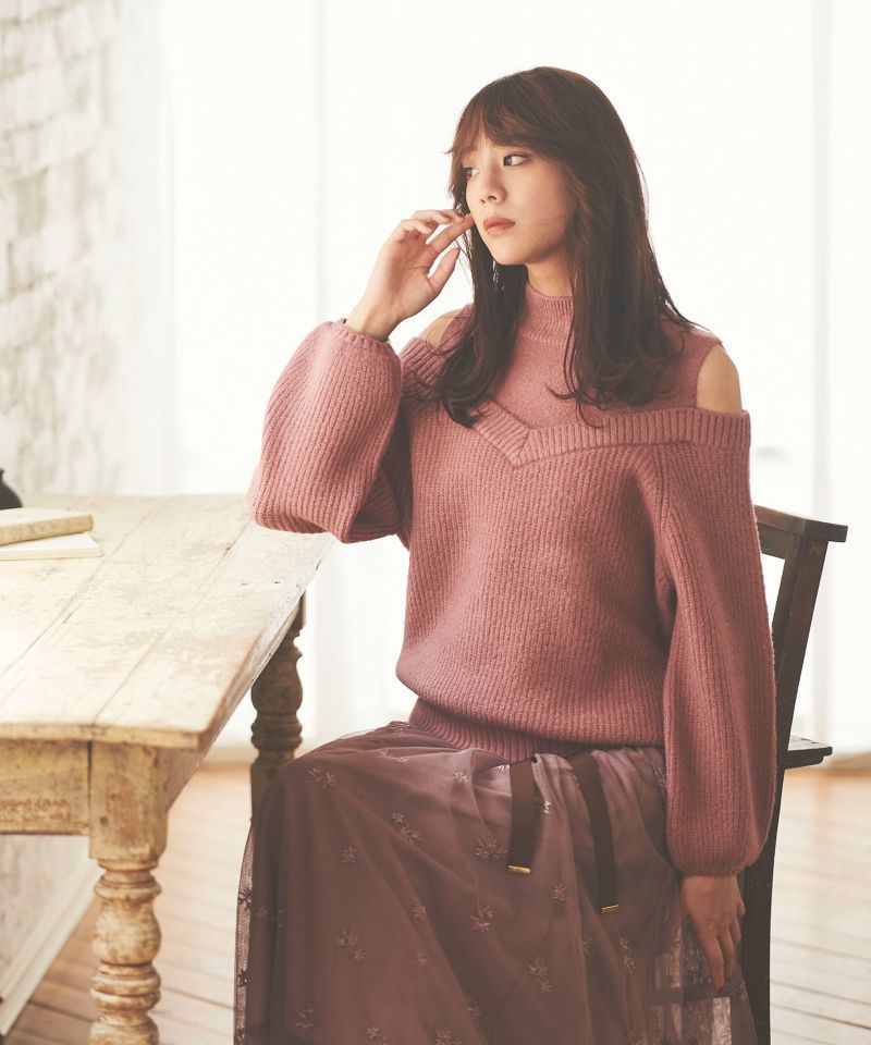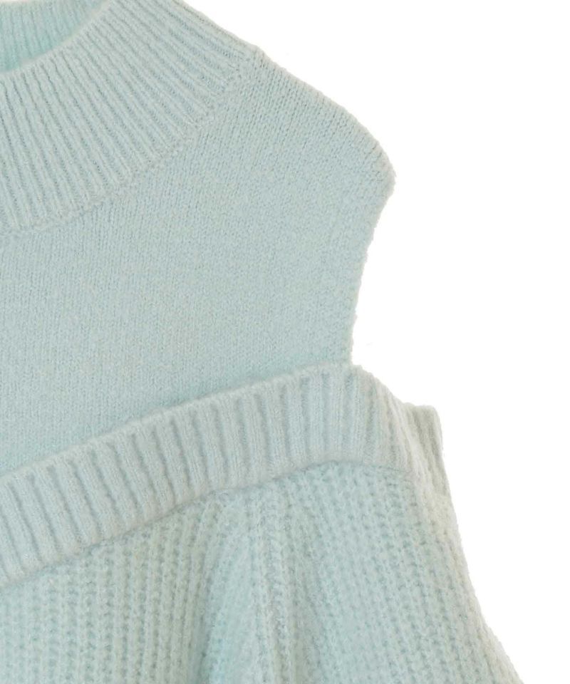 ノースリーブニットとざっくりとした長袖ニットが一枚になったデザインは、オープンショルダーからさり気ない肌見で色っぽさをプラス。