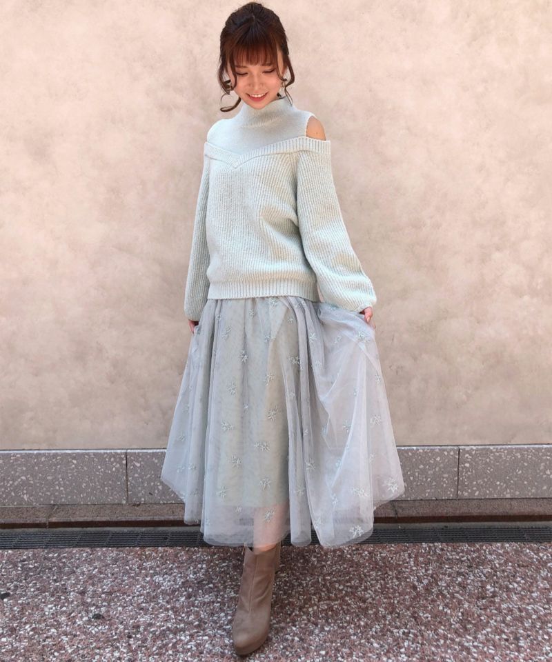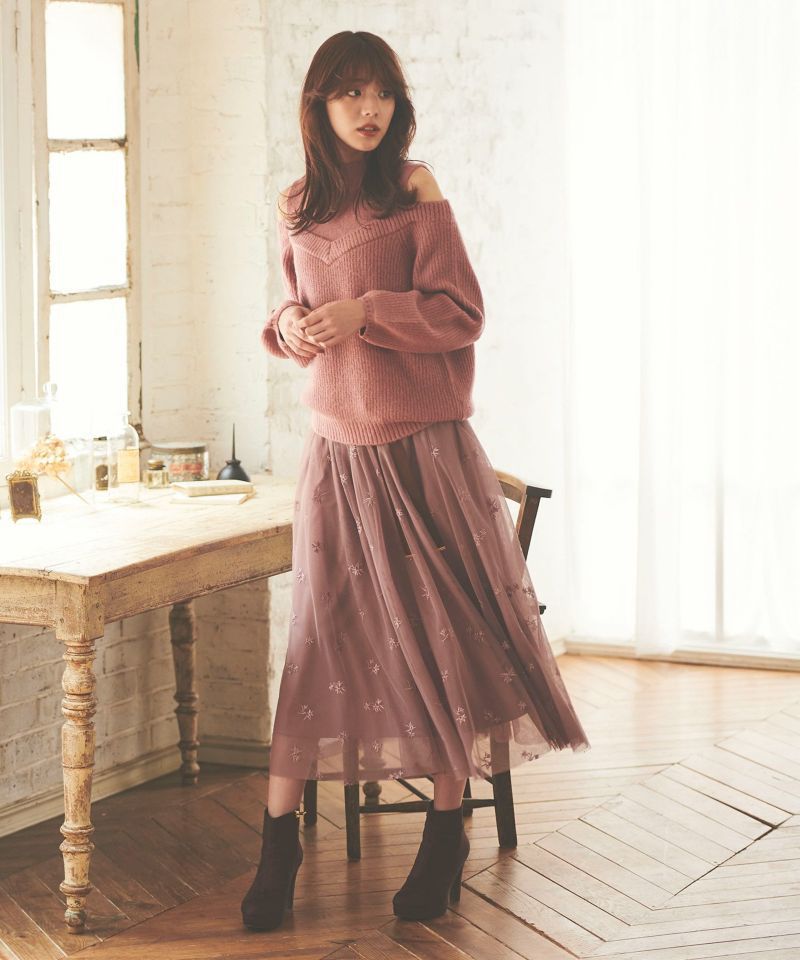 ボトムスはカジュアルなデニムから、トレンドのロングスカートを合わせてリラックスした着こなしが、冬ならではのニットスタイルに。フェミニン要素を取り入れてカジュアル過ぎない着こなしに。