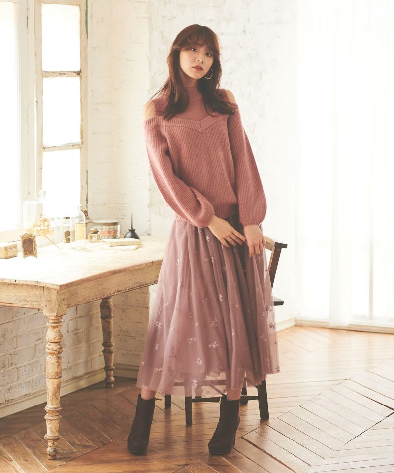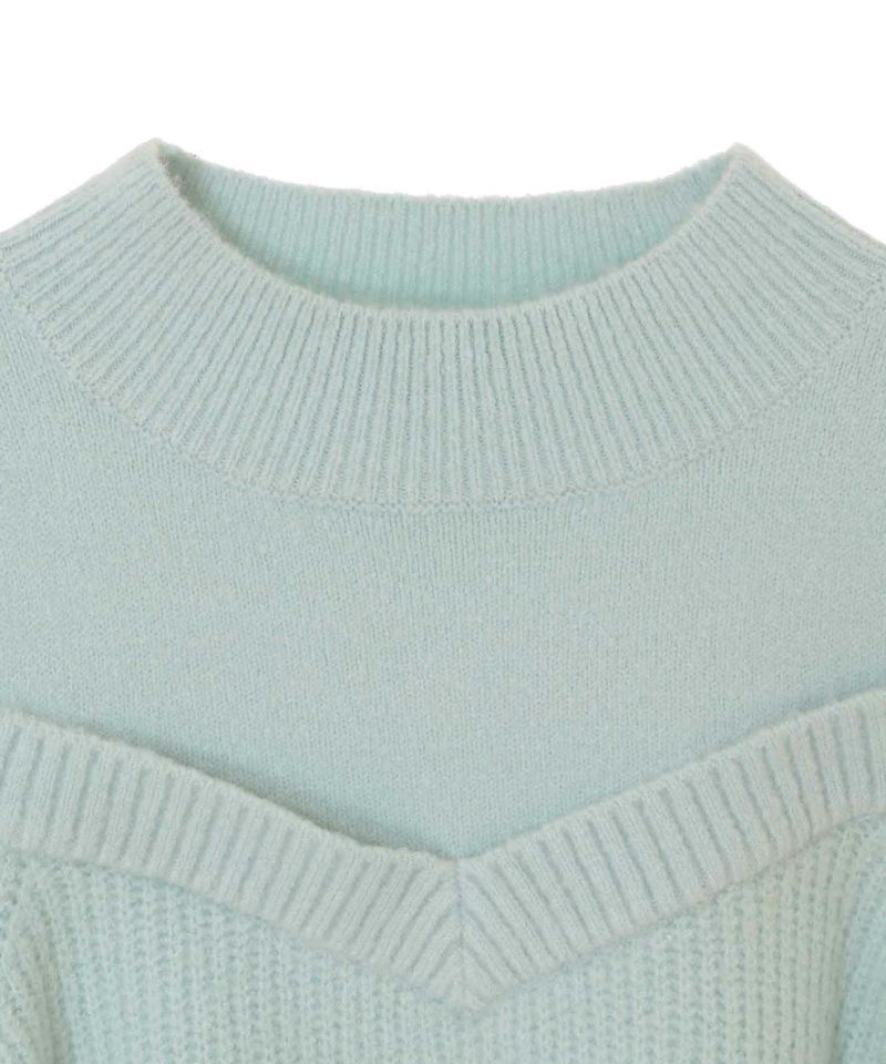 真冬のニットは少しの肌見せでフェミニンなを演出フェイクレイヤードデザインニット。