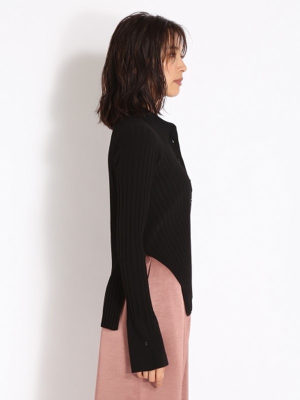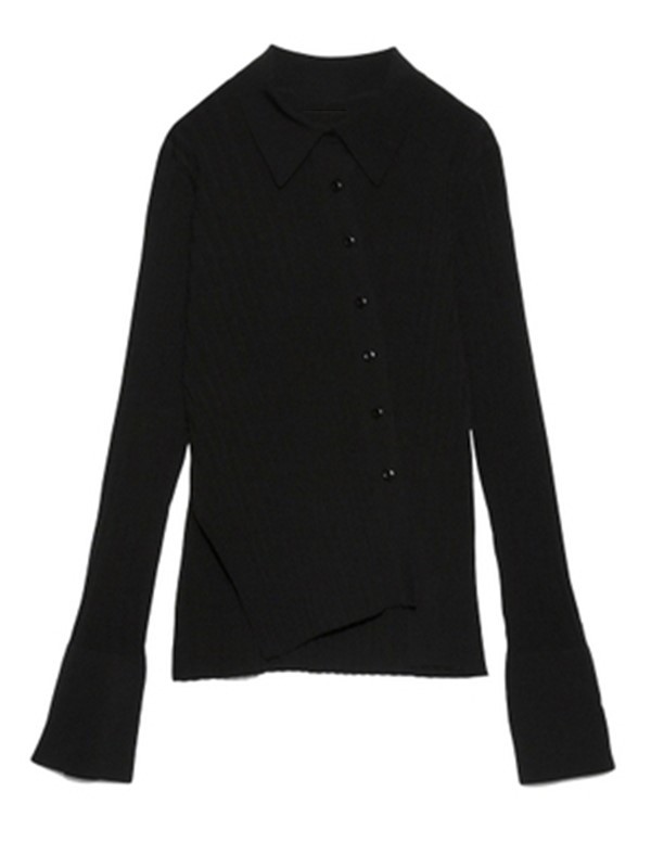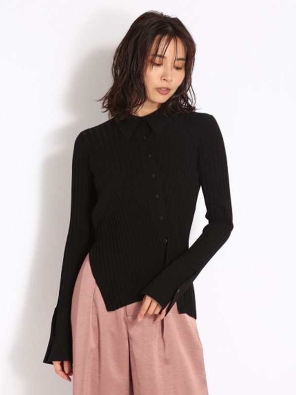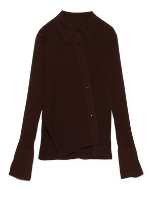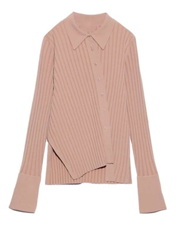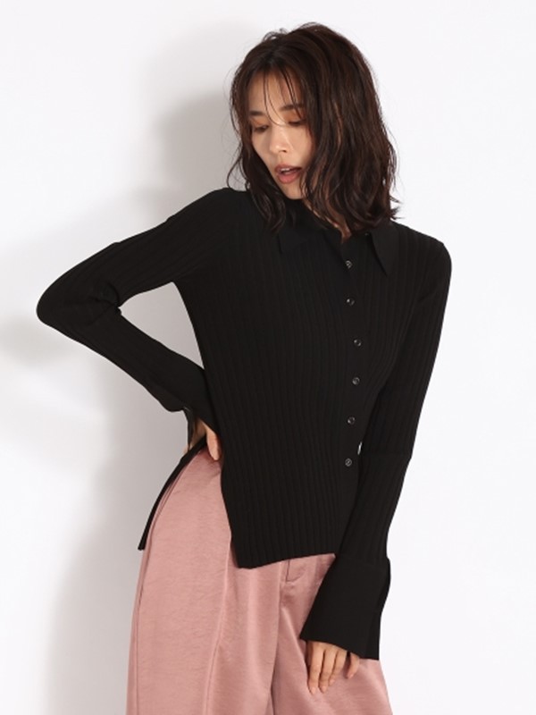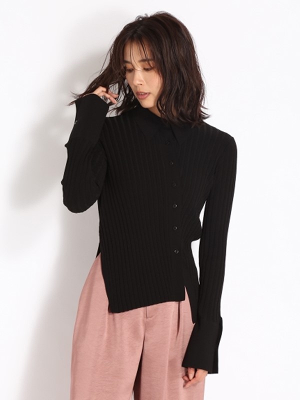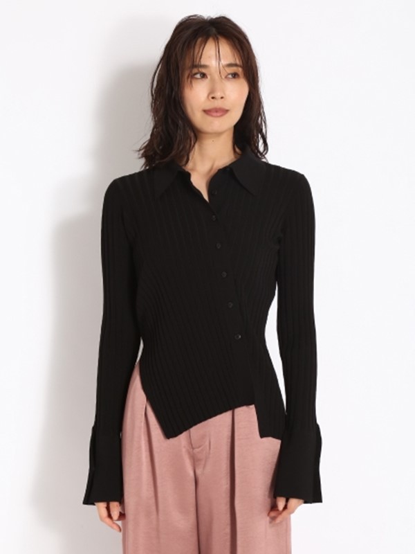 前立てが斜めになったアシンメトリーデザインの衿付きニットカーディガンです。