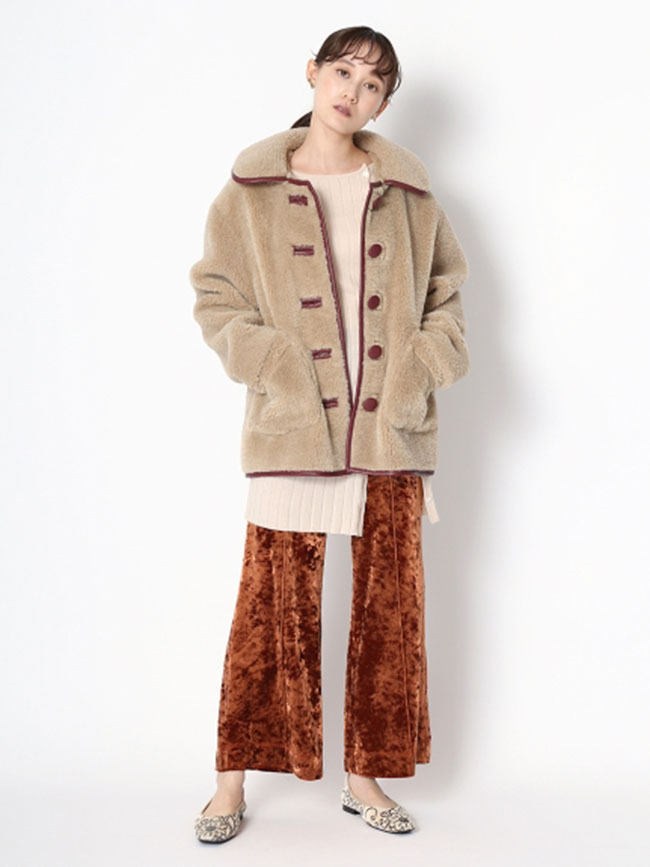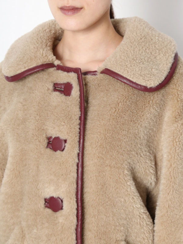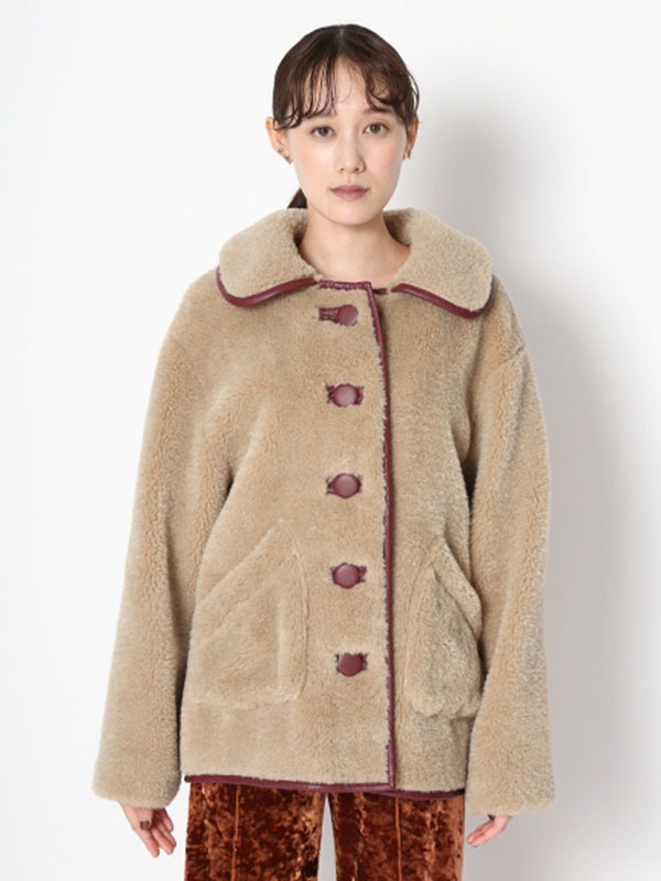 フェイクレザーのパイピング使いで、ヴィンテージライクに表現したボアコート。ふんわりと女性らしいボアの魅力を活かしつつ、配色デザインで少しクールな印象をプラスしました。 贅沢なボリュームに大きめにつけたポケットで寒い日もおしゃれに防寒できます。ミドル丈なのでバランスがとりやすく、ワンピースやパンツなどいろいろなアイテムに合わせやすい丈感で仕上げました。