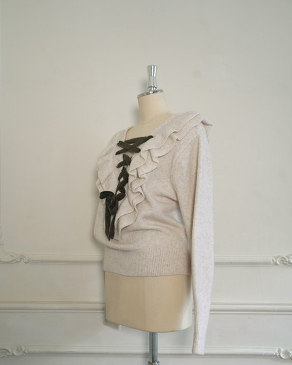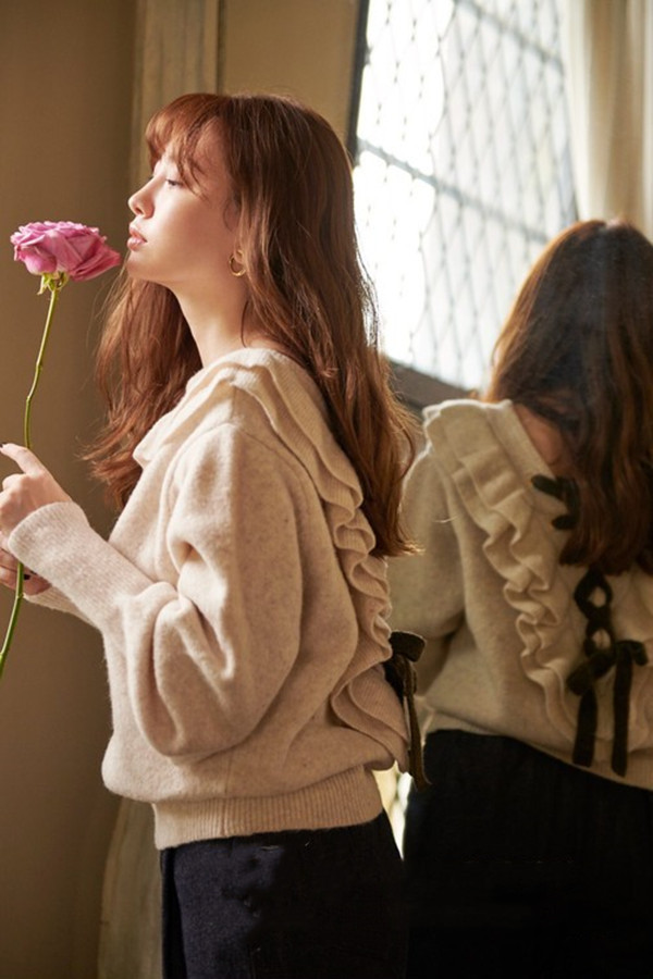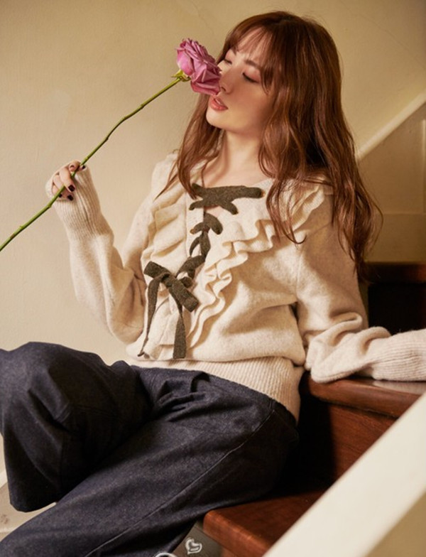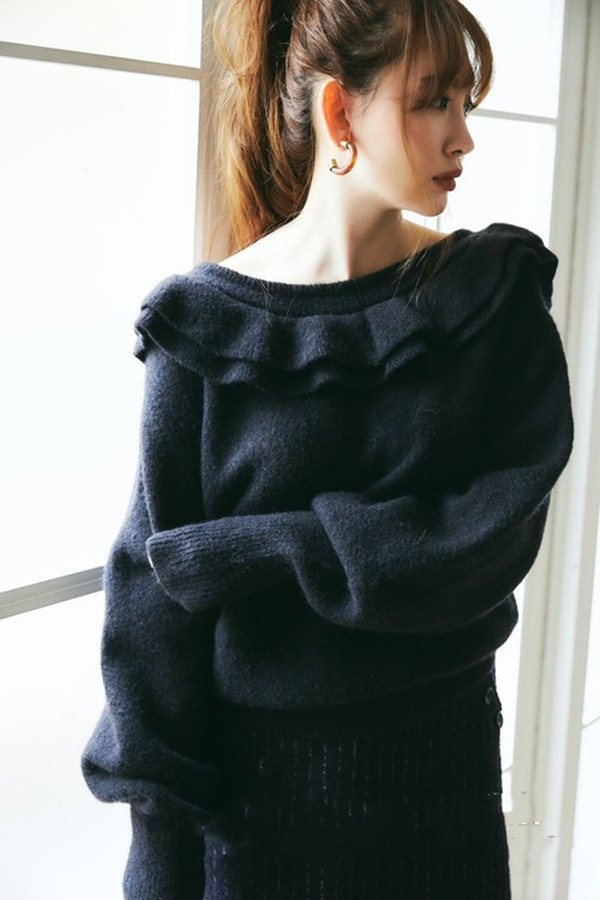リラックスウェアのようなカジュアル感覚で着られる、気軽な着心地の中にもメランジ編みやフリルの質感が上質なプルオーバー。