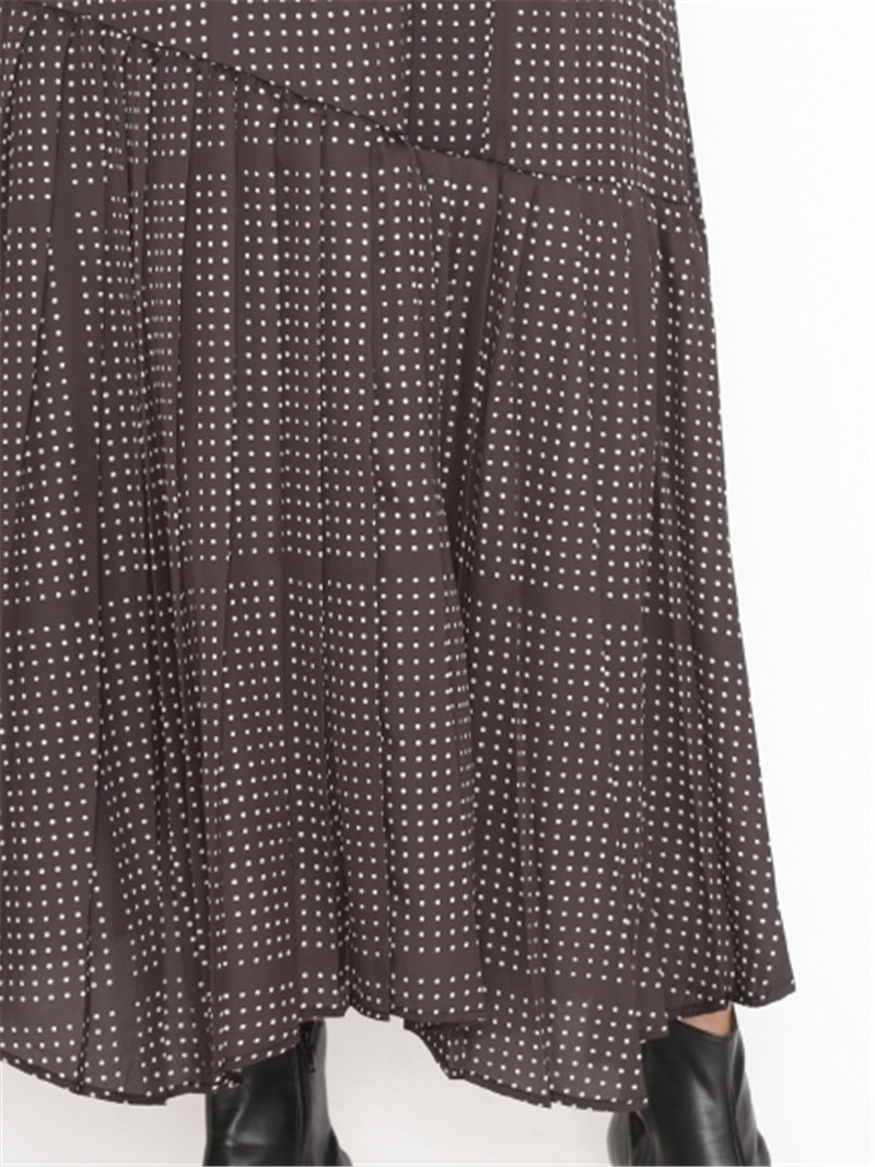 落ち感のある柔らかなポリエステル素材を使用しました。トレンドの線画柄、大人なブラウンリーフ柄、フレームドットの3色展開です