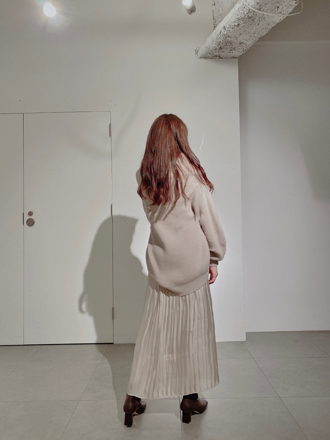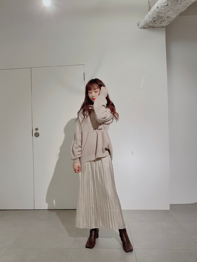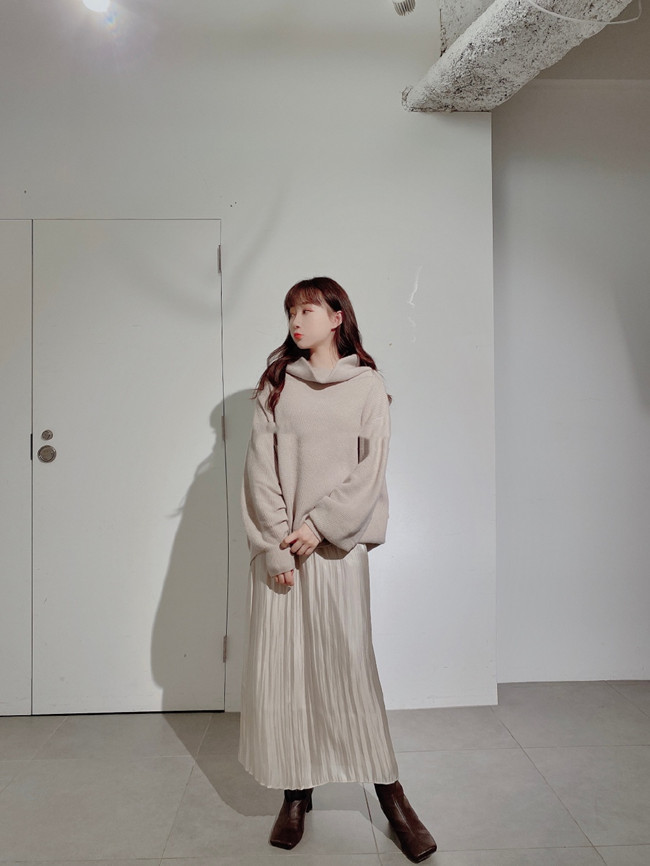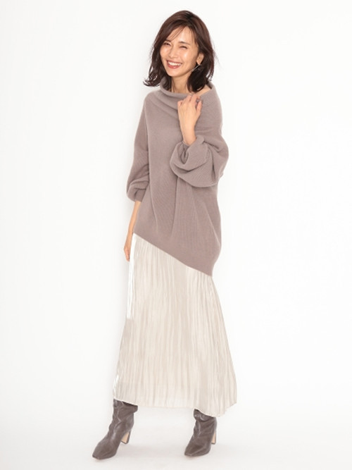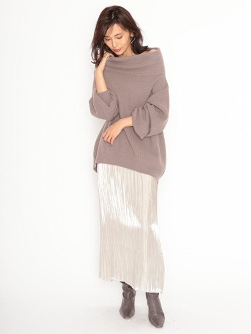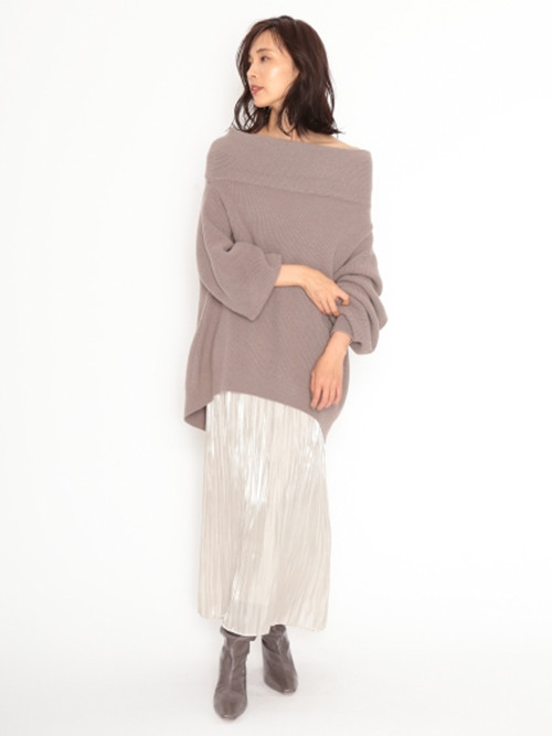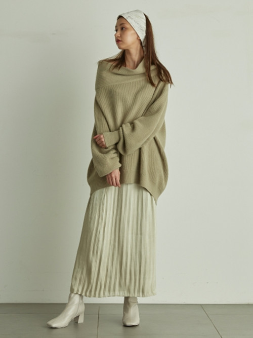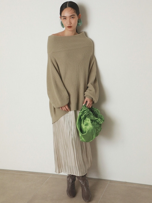 一枚で旬のコーディネートが完成する、ニットとスカートのセットアイテム。アシンメトリーデザインのニットは、着るだけでトレンド感のある表情に。伸縮性のあるリブ編みを採用しているので、肩の落とし具合は自由に調整いただけます。存在感のあるオーバーサイズですが、軽い仕上がりでストレスフリーな着心地を叶えました。袖の内側にはタックをあしらい、綺麗なボリュームがキープ出来るよう工夫しています。オーロラに輝くプリーツスカートは、Iラインにすることで新鮮なシルエットに。それぞれセパレートでも着用でき、抜群の着回し力でコーディネートを彩ります。