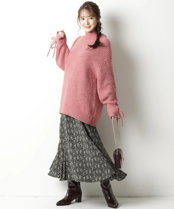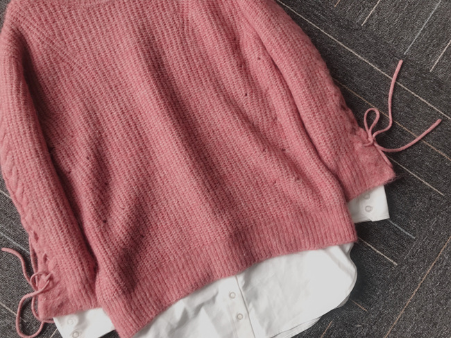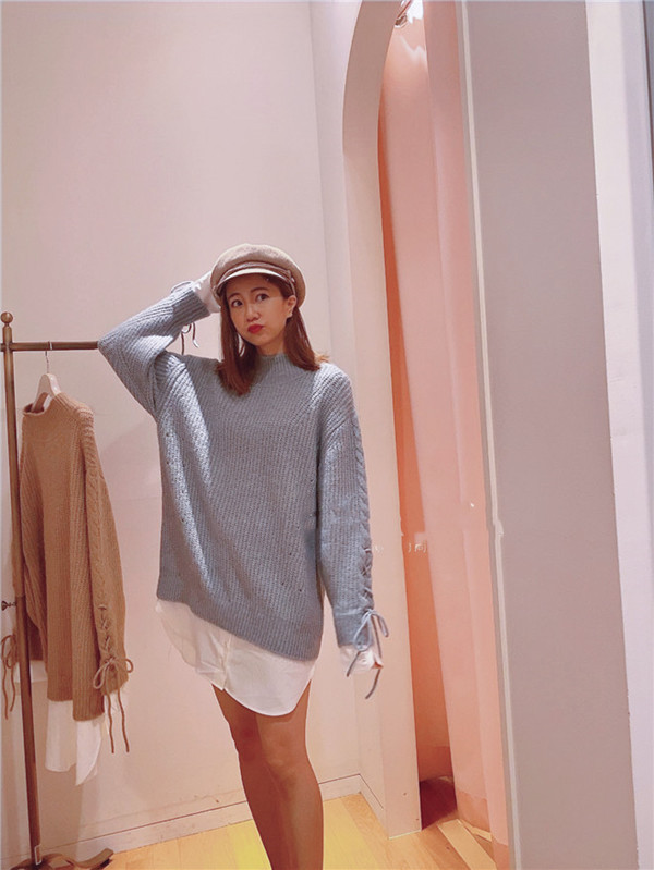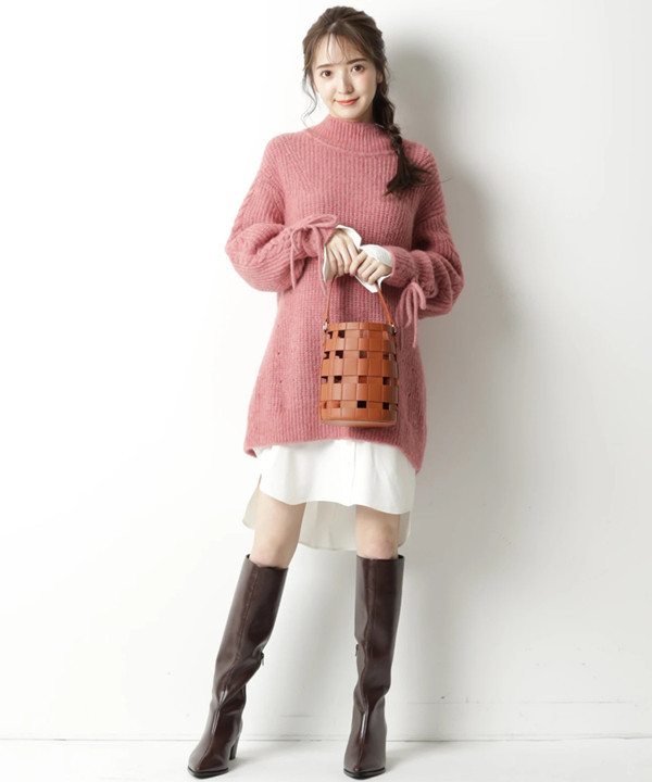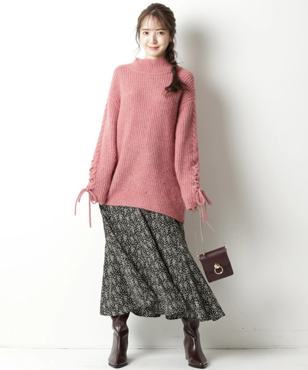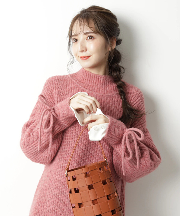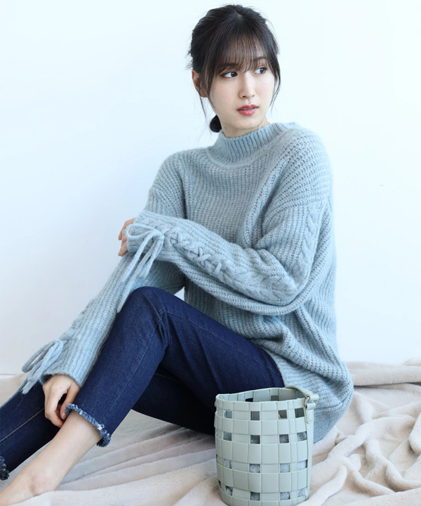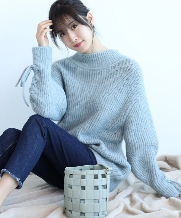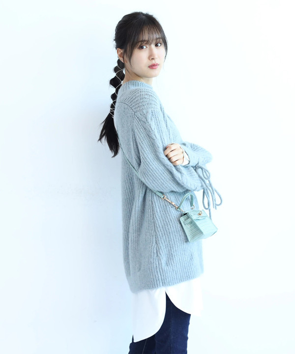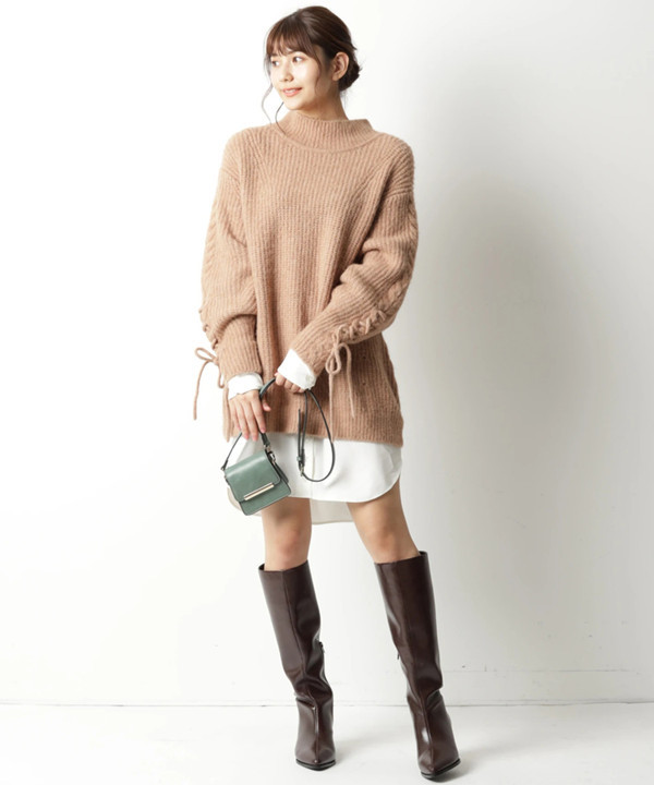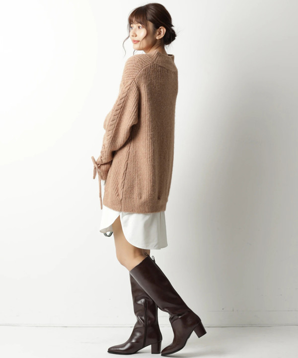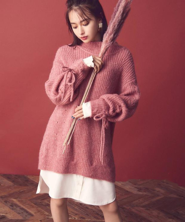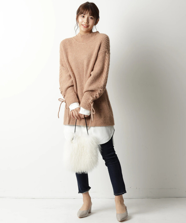 ざっくり感が女性らしい柔らかな印象を与えてくれるニットは、袖口のレースアップ仕様で甘さをグッと加速。シャツワンピースをインに合わせて、好感度レイヤードスタイルが手軽に楽しめるお得な2アイテムセットです。