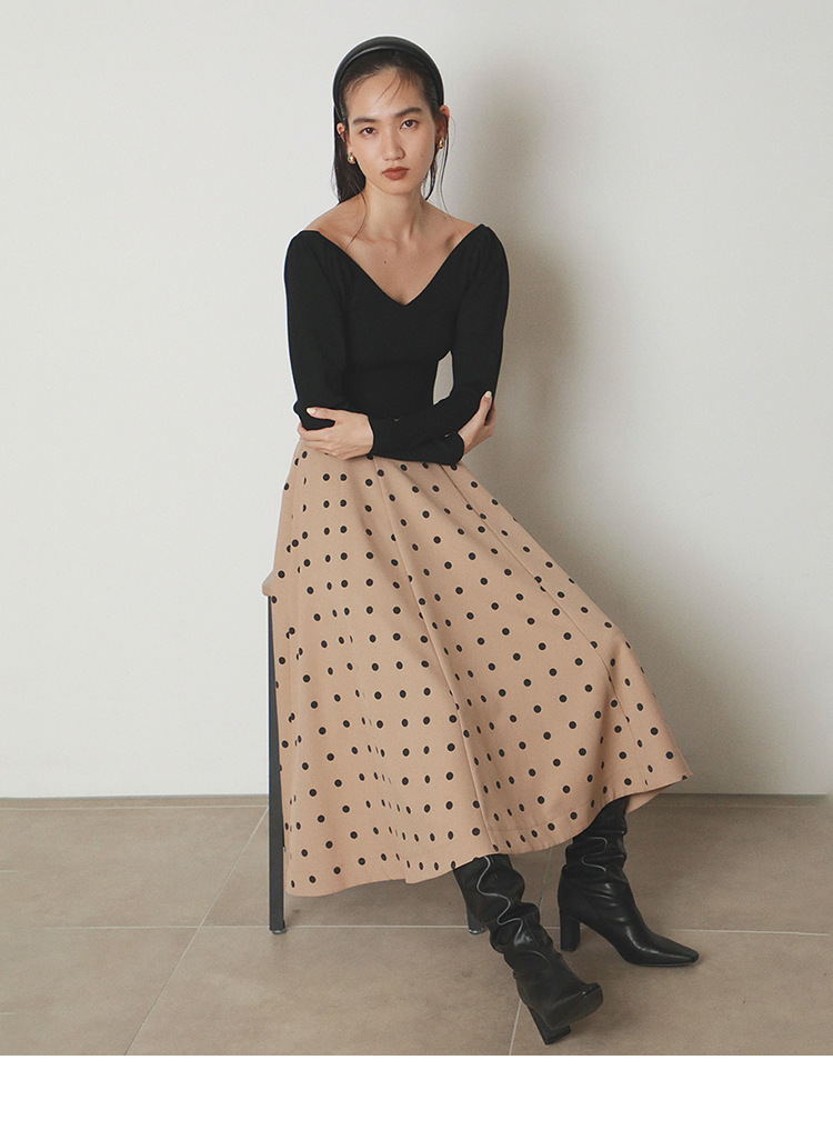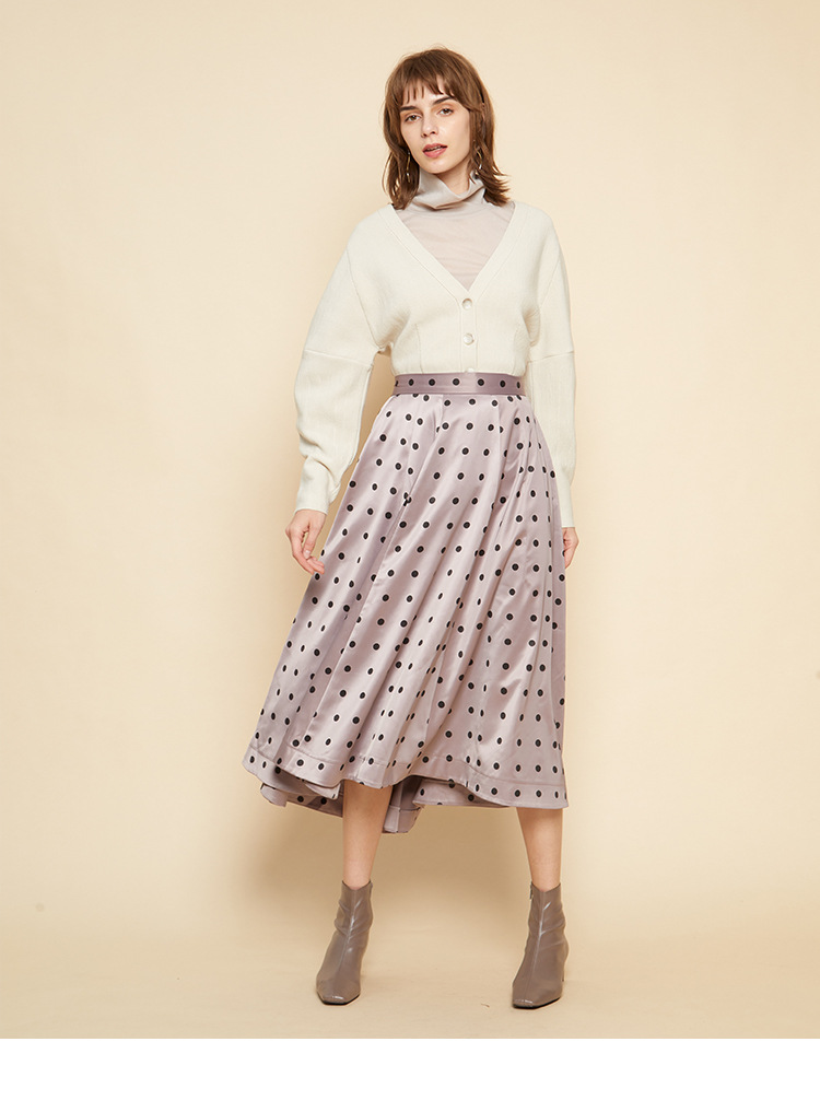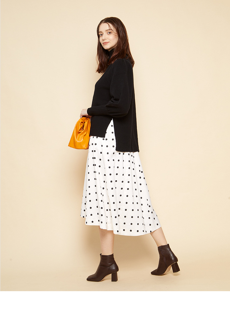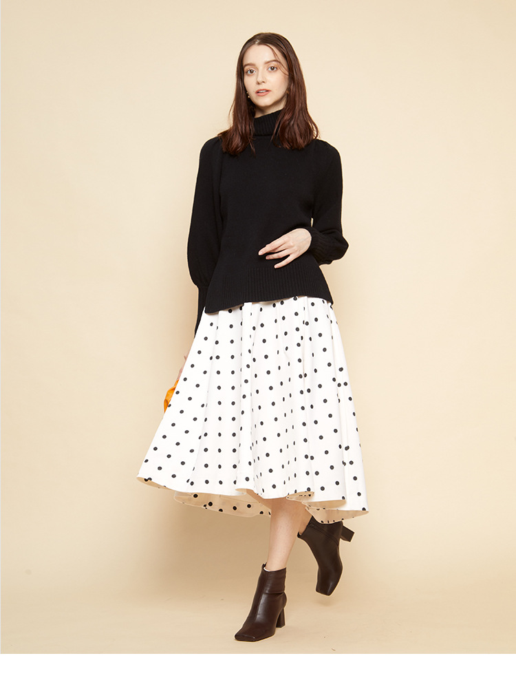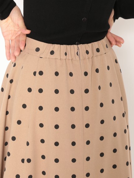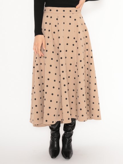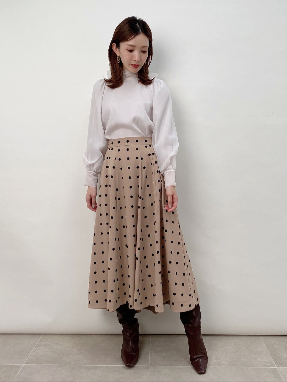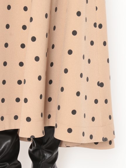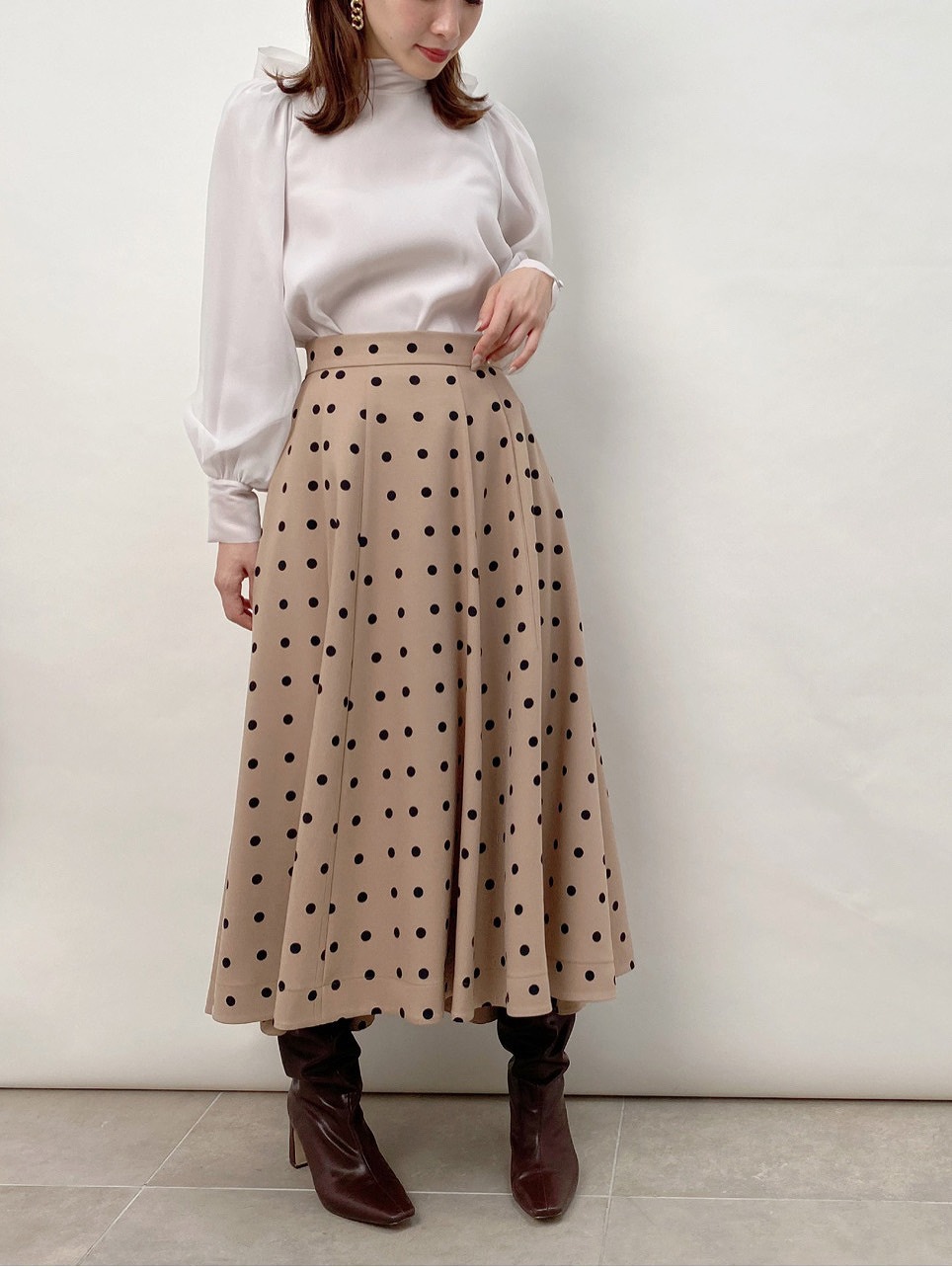 トレンドの光沢感のある肉厚なハリ感のある生地にドットプリントを施したフレアスカート。タックや切り替えをふんだんにあしらい、女性らしく広がる美しいボリュームフレアを実現しました。後ろを長く前後差をつけたシルエットが、歩く度に揺れるドラマティックな装い。華やかなルックスはコーディネートの主役を担い、シーン問わず着用いただけます。透け感:なし