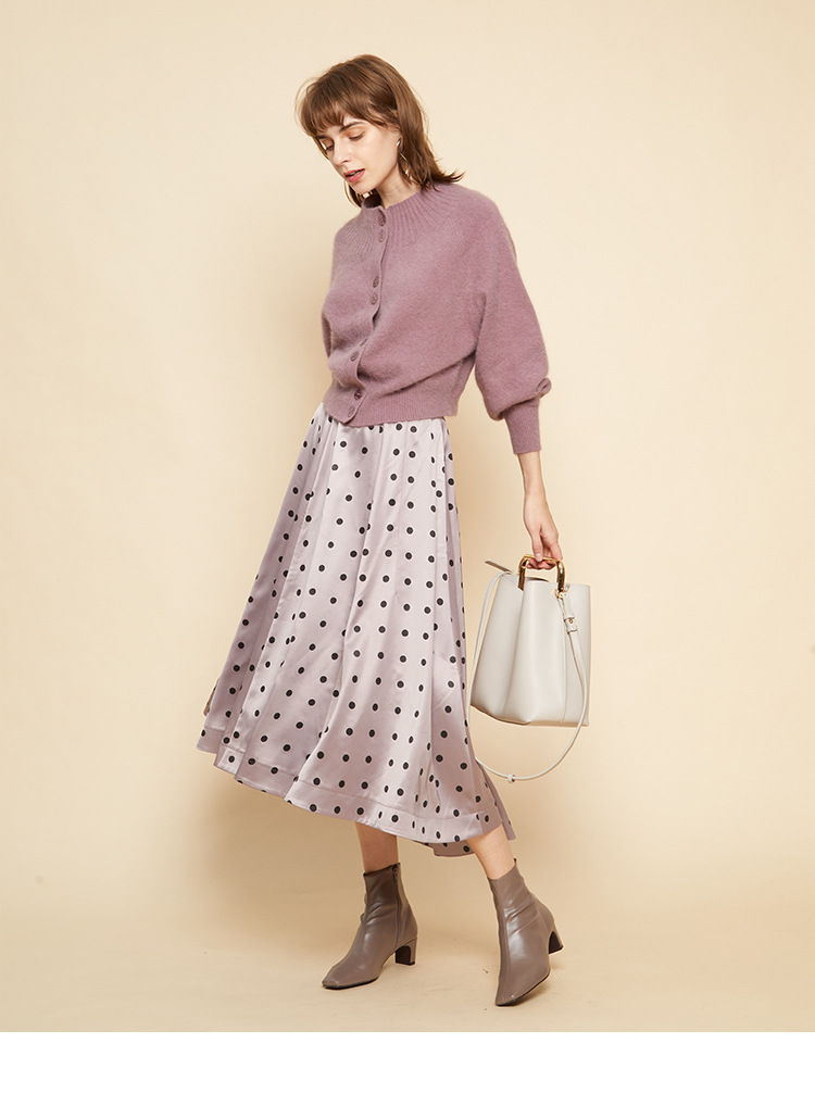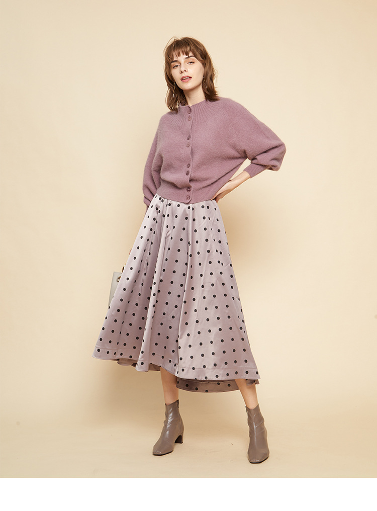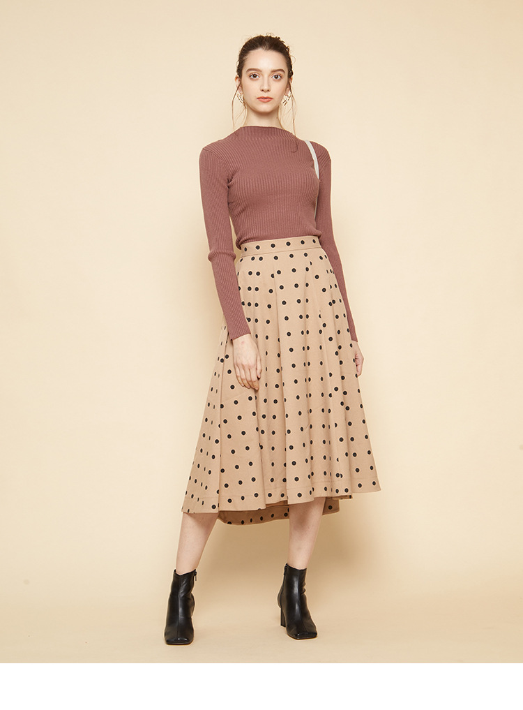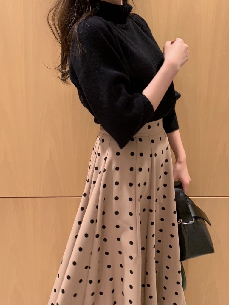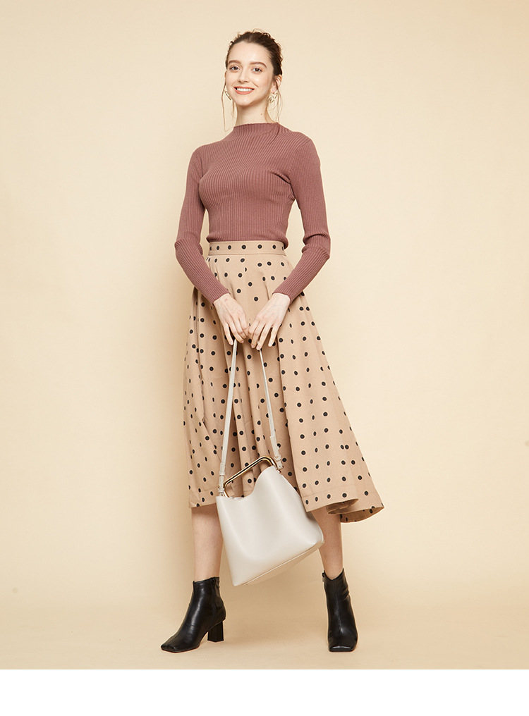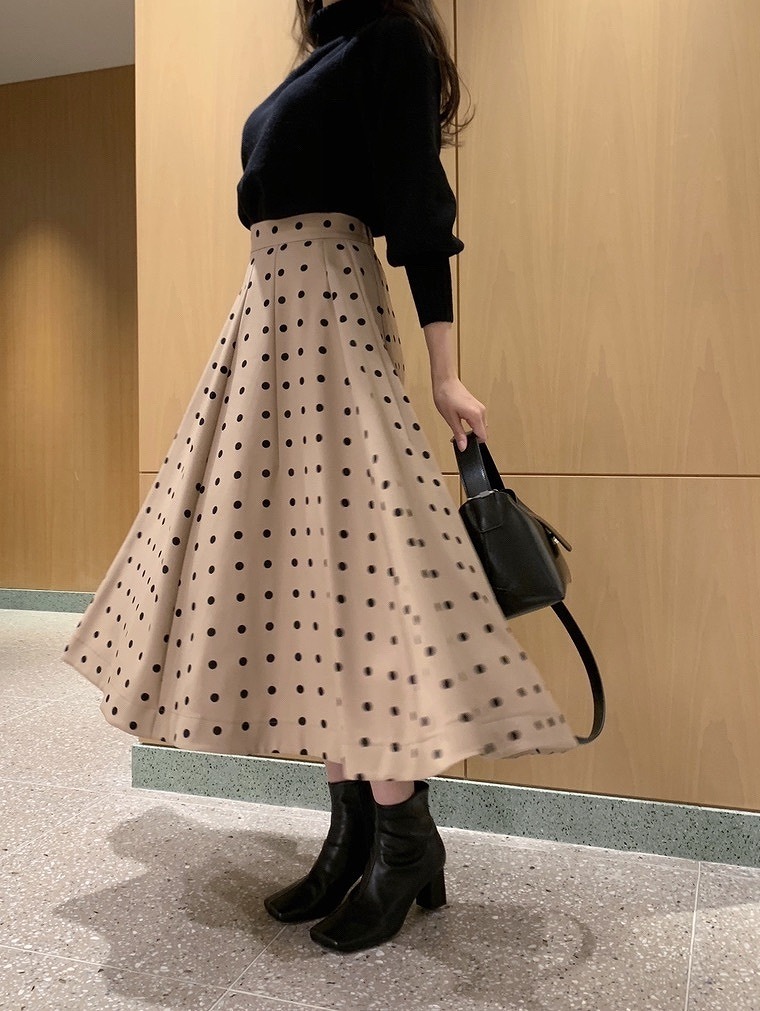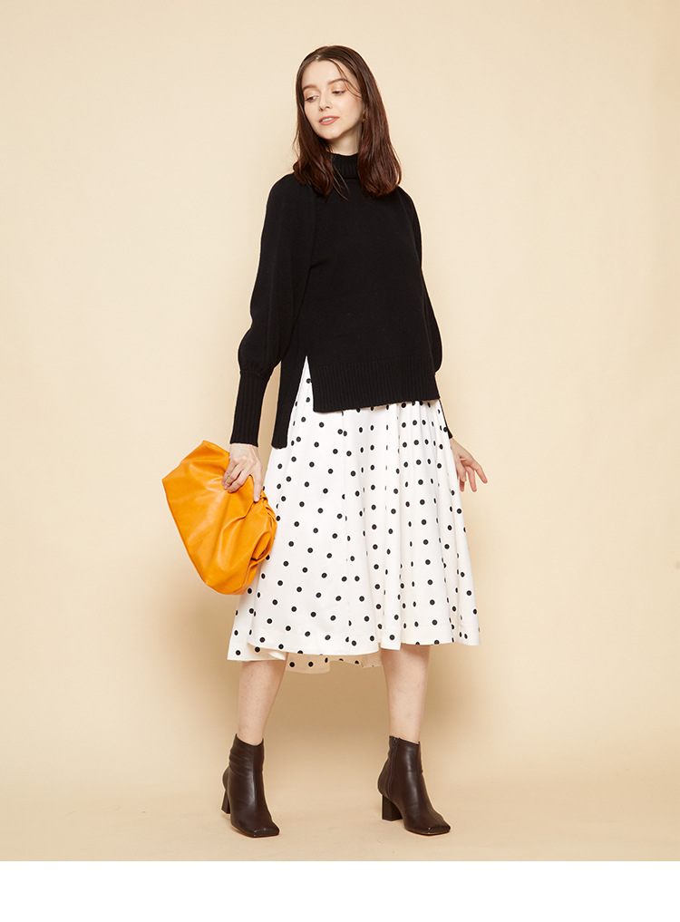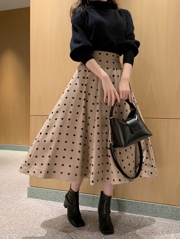 トレンドの光沢感のある肉厚なハリ感のある生地にドットプリントを施したフレアスカート。タックや切り替えをふんだんにあしらい、女性らしく広がる美しいボリュームフレアを実現しました。後ろを長く前後差をつけたシルエットが、歩く度に揺れるドラマティックな装い。華やかなルックスはコーディネートの主役を担い、シーン問わず着用いただけます。透け感:なし