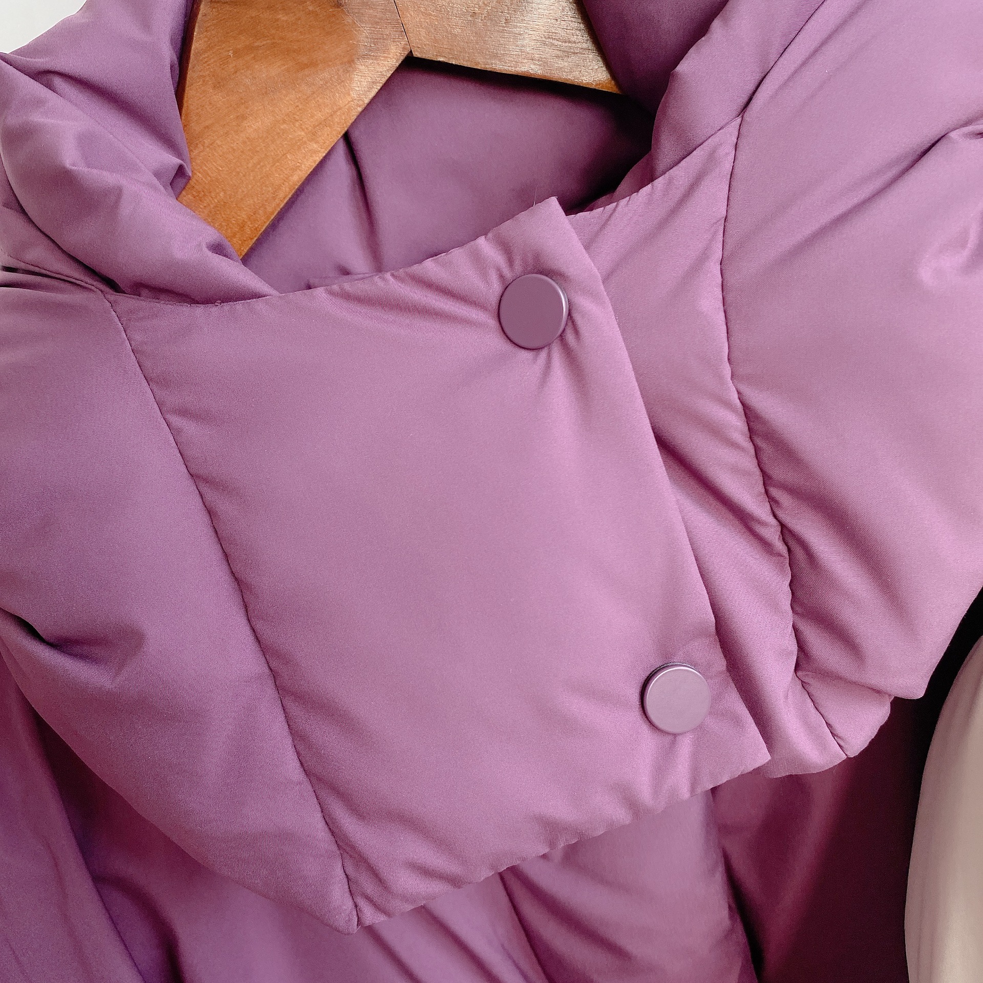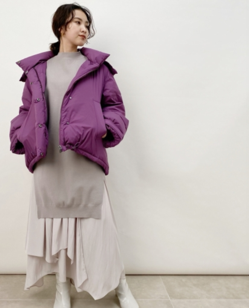 表地にはシームレスの生地を、内側には上質なフレンチダウンを使用しました。抜群の保温性を発揮し、柔軟性や放湿性に優れているのが特徴です。オフホワイト、ベージュ、パープルの3色をご用意しました。