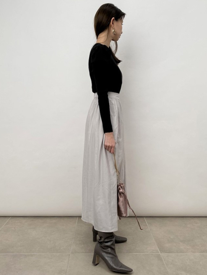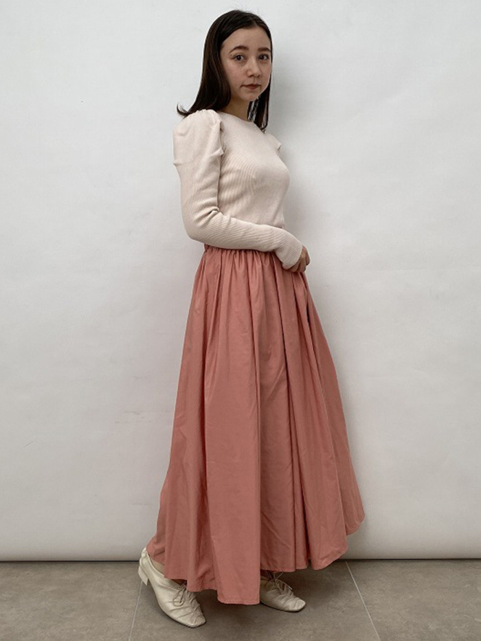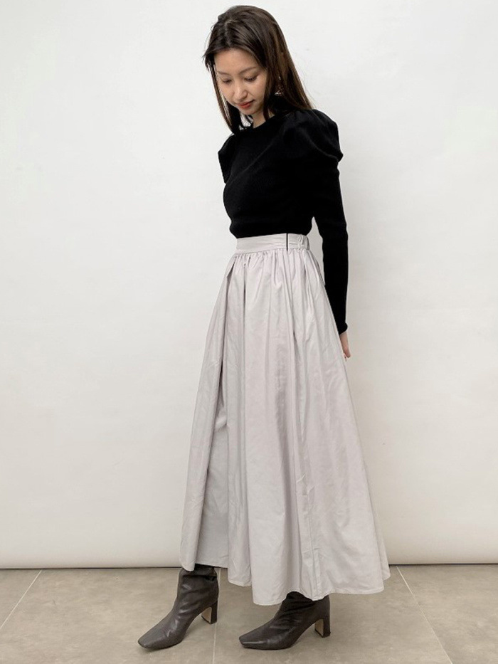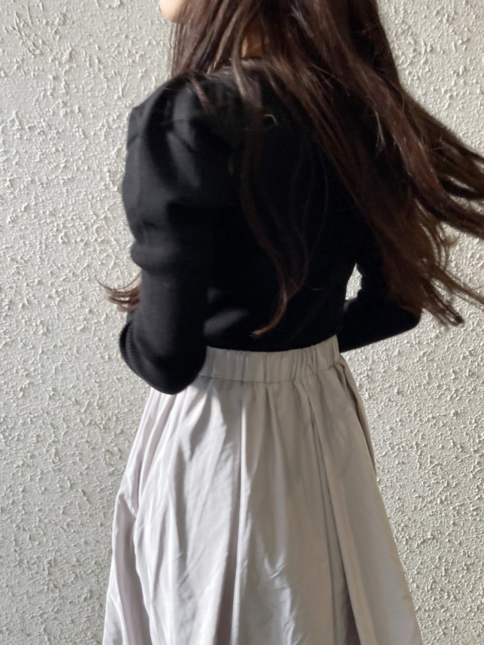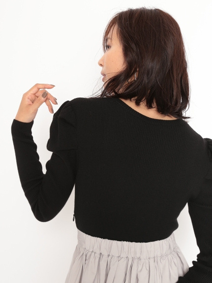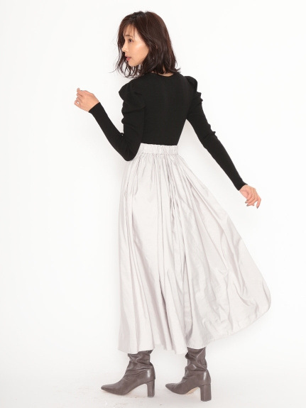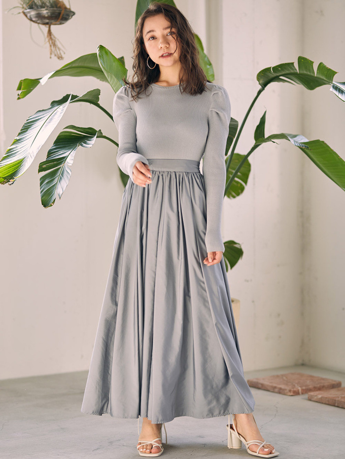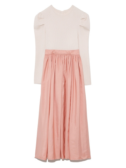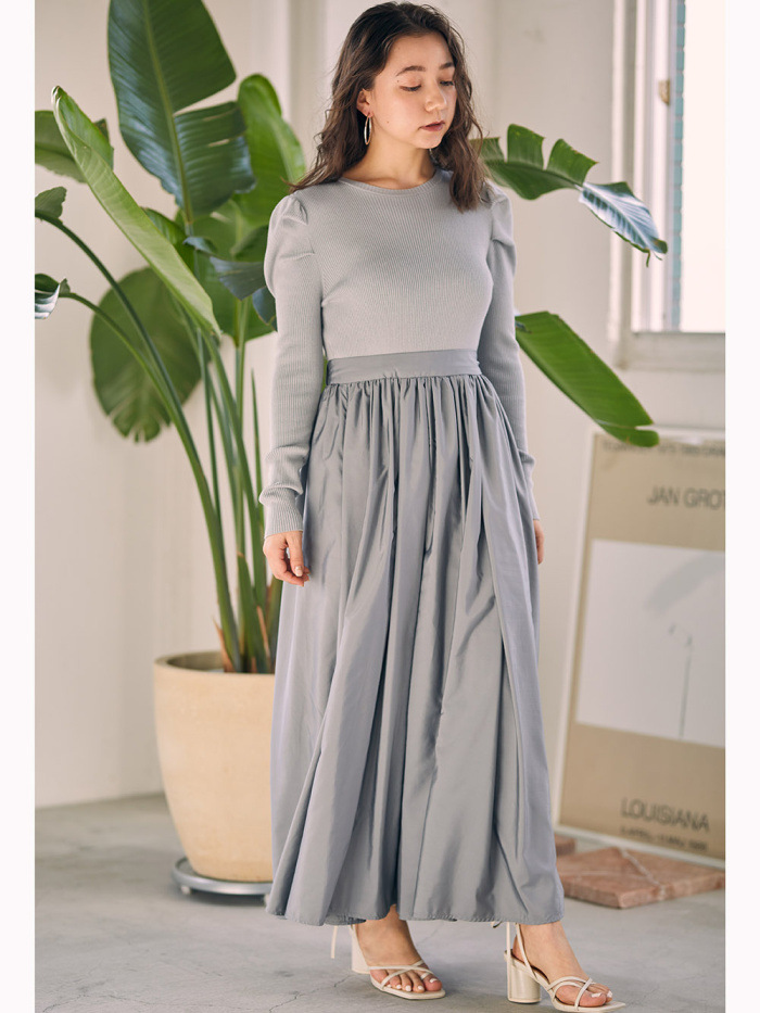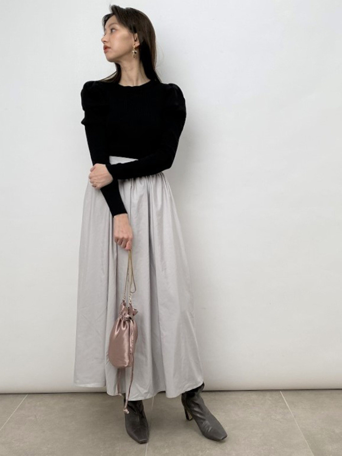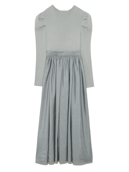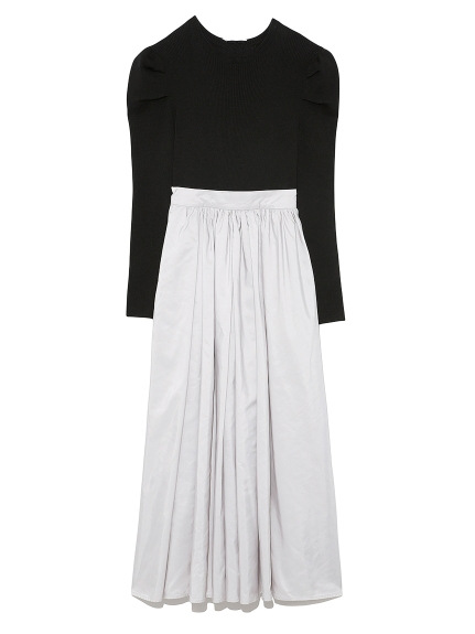 さらりとした糸で編み上げたニットと華やかに広がるタフタスカートを合わせた、今季らしいマテリアルのドッキングワンピース。詰まりネックでシックに仕上げたトップスは、ボリュームあるパフスリーブで女性らしさをプラス。たっぷりのボリュームを持たせたスカートは、歩く度に揺れてドラマティックなシルエットを描きます。やや高めの位置で切り替えたウエストはスタイルアップに貢献し、後ろに施したゴムでストレスフリーな着心地。同色系ワントーンとバイカラーがモードな雰囲気を醸し、一枚で奥行きあるスタイリングが完成します。