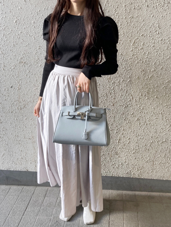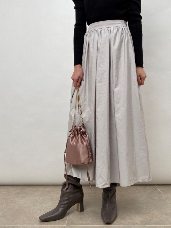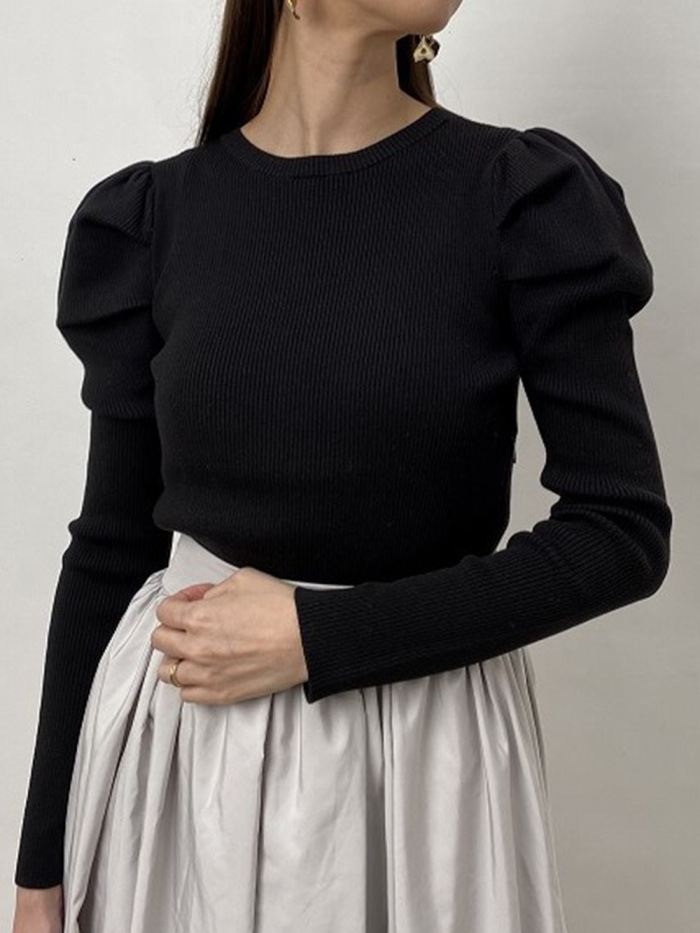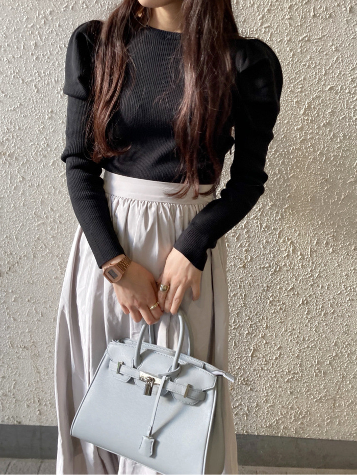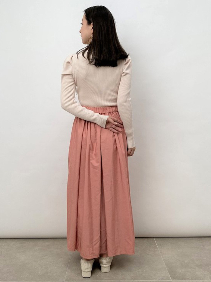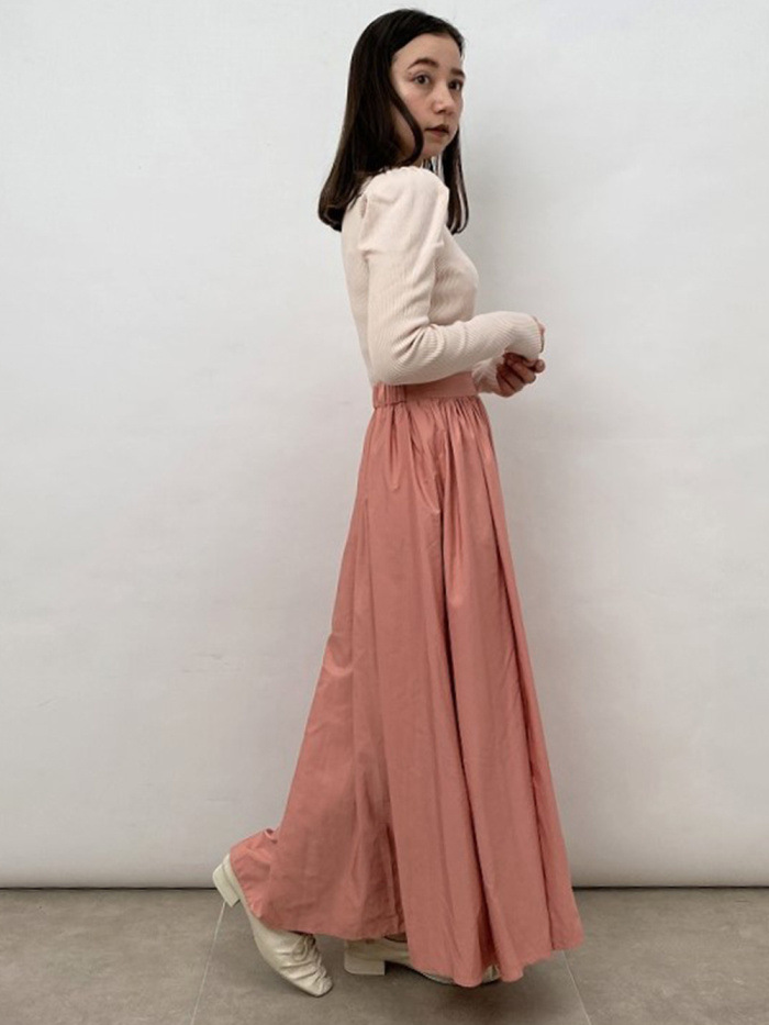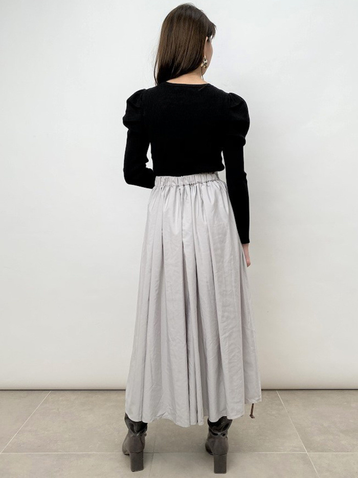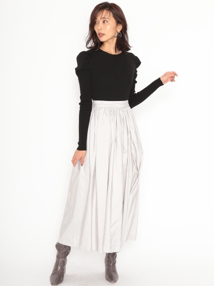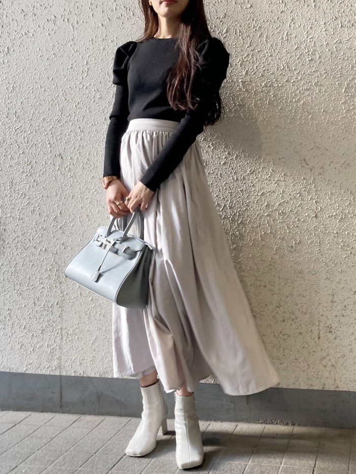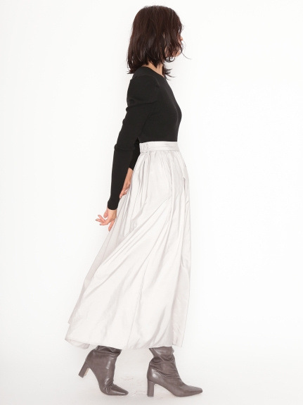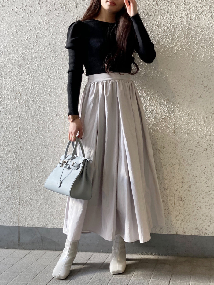 さらりとした糸で編み上げたニットと華やかに広がるタフタスカートを合わせた、今季らしいマテリアルのドッキングワンピース。詰まりネックでシックに仕上げたトップスは、ボリュームあるパフスリーブで女性らしさをプラス。たっぷりのボリュームを持たせたスカートは、歩く度に揺れてドラマティックなシルエットを描きます。やや高めの位置で切り替えたウエストはスタイルアップに貢献し、後ろに施したゴムでストレスフリーな着心地。同色系ワントーンとバイカラーがモードな雰囲気を醸し、一枚で奥行きあるスタイリングが完成します。