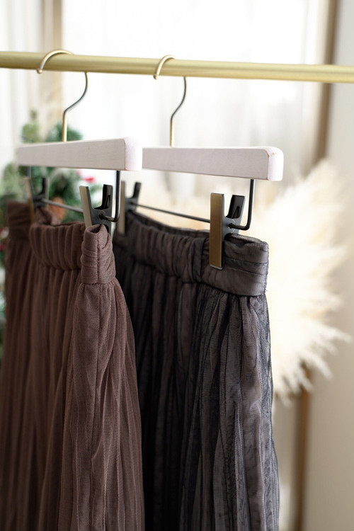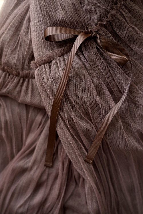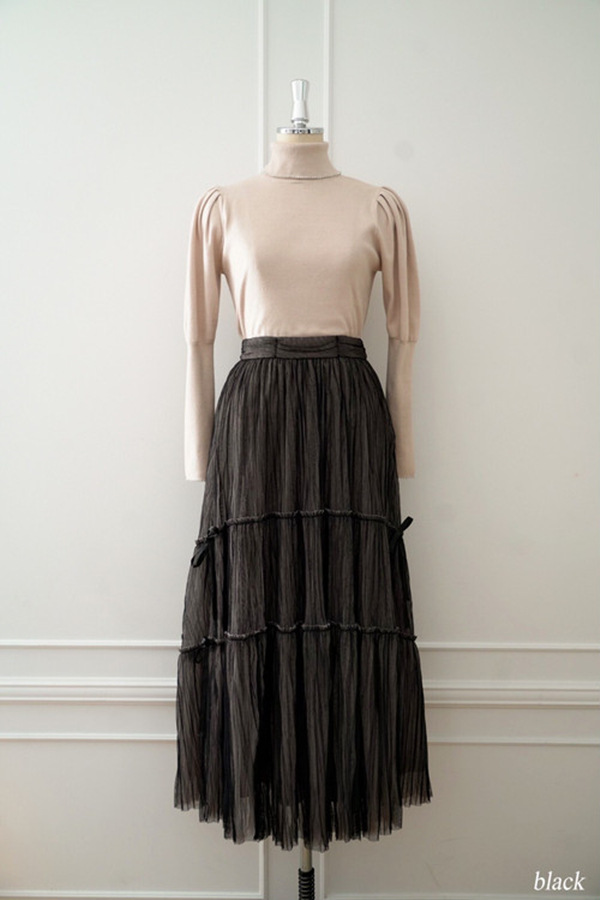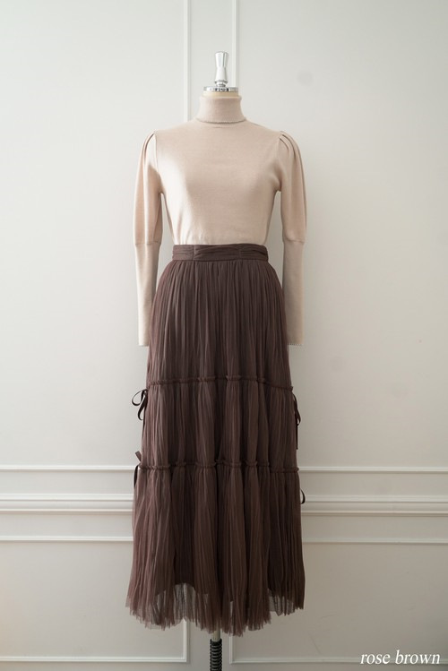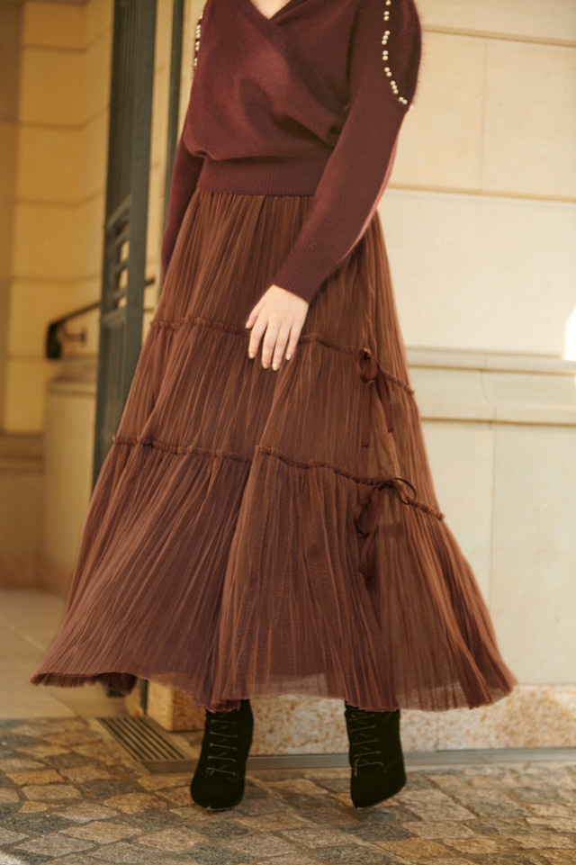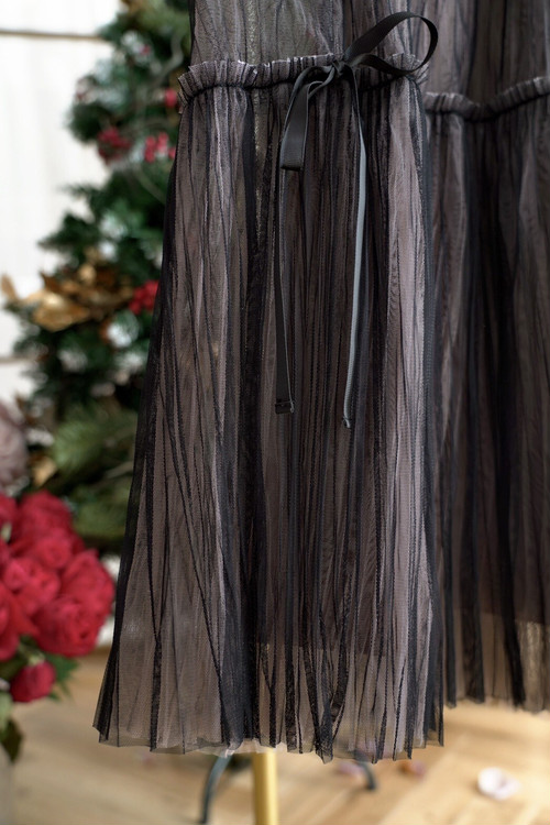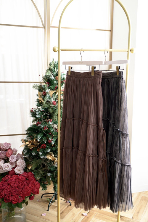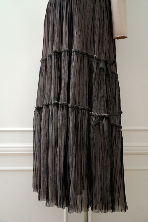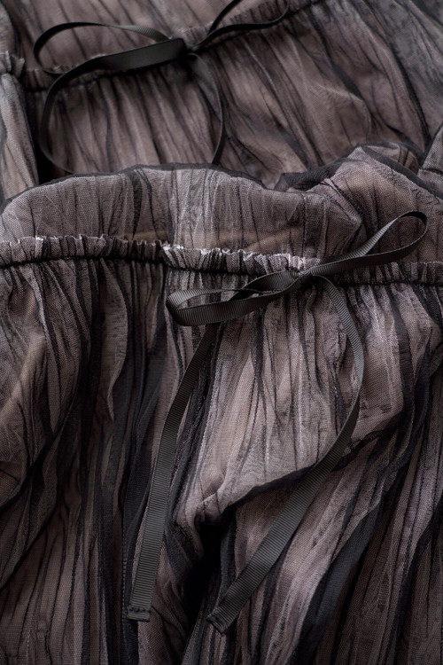 二色の配色のシアーチュールを重ねボリューム感のあるシルエットを演出。ウエストはゴムを配した、ハイライズウエストのシルエット。