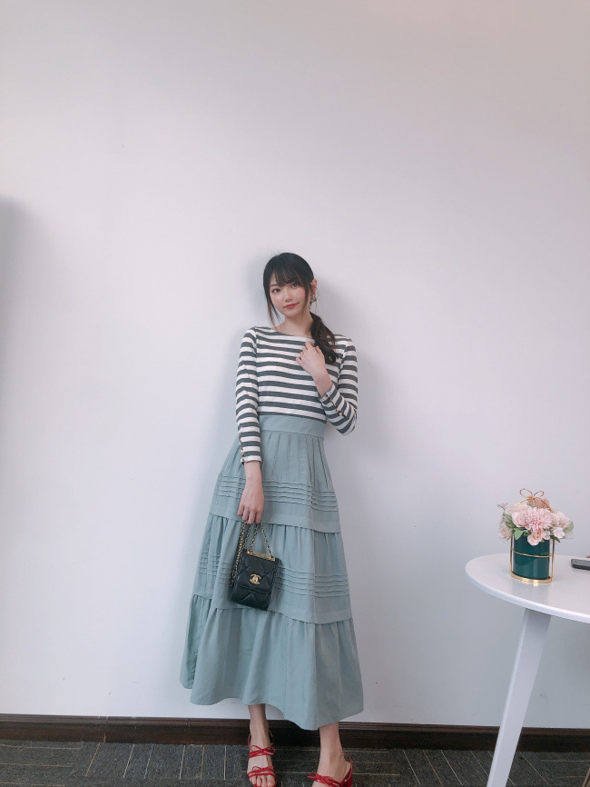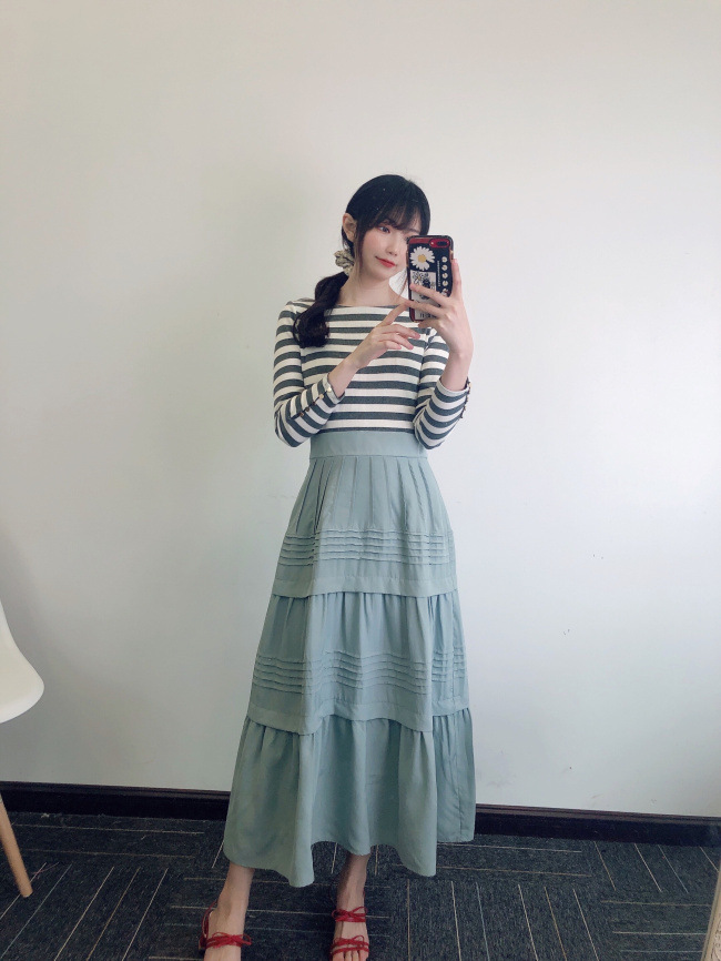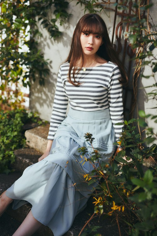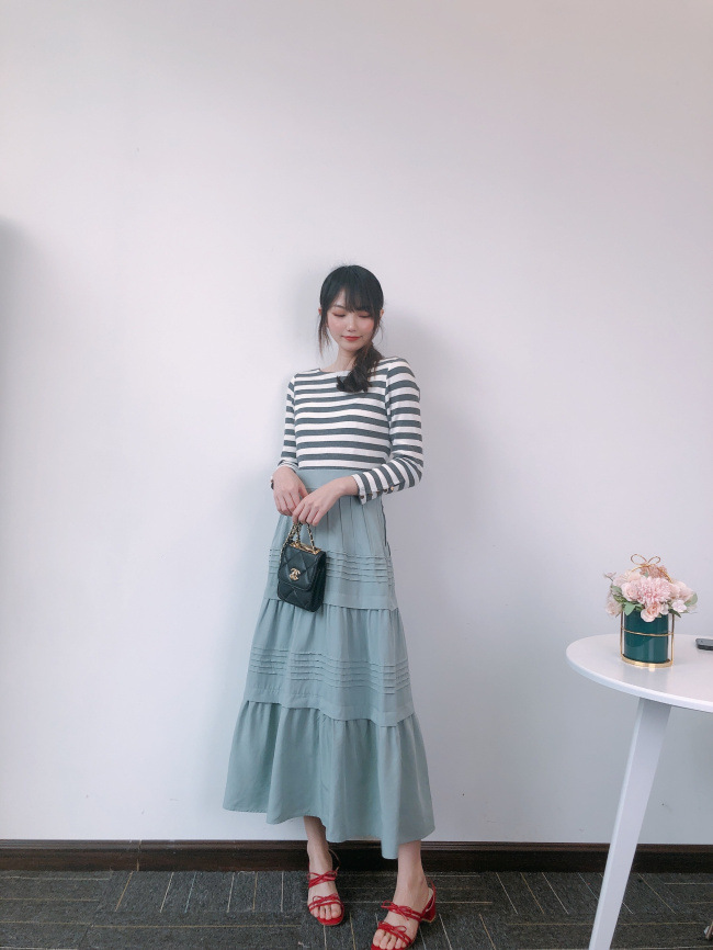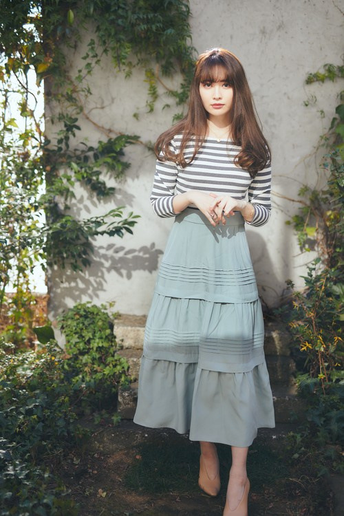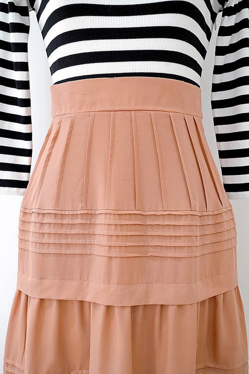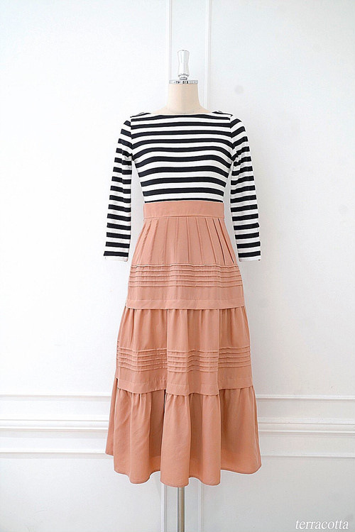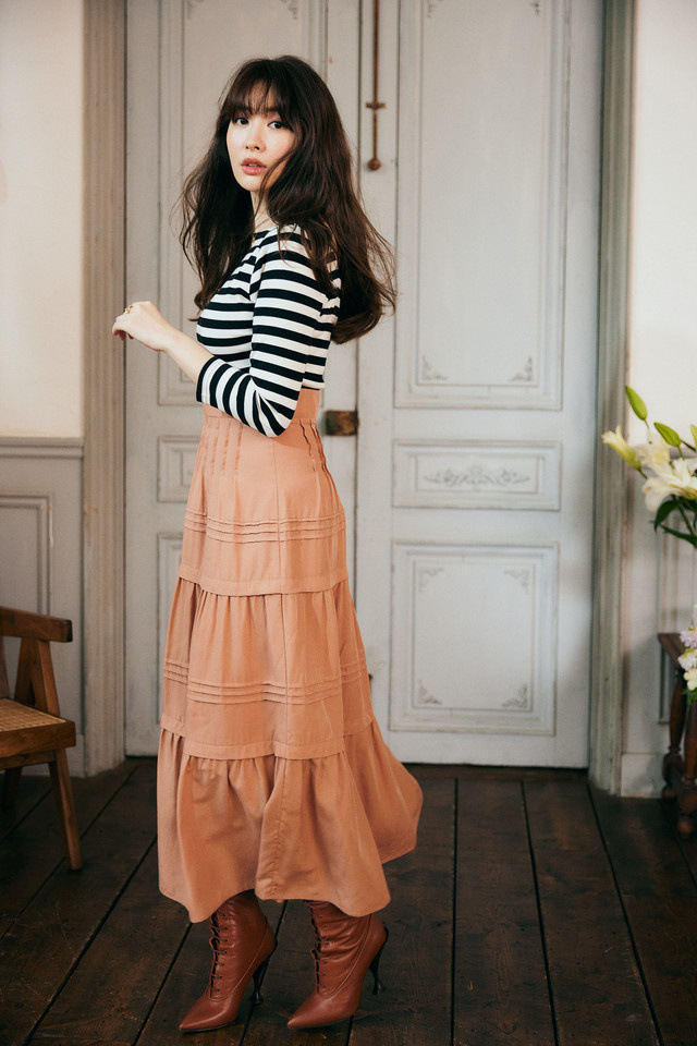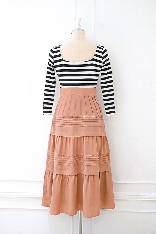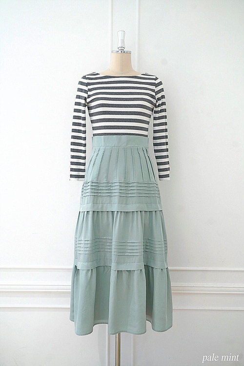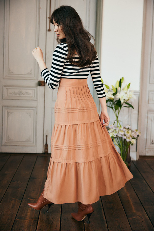 ウエストから裾にかけて縦向きのピンタックが施されていることでウエストを細くみせ、フレアスカートが程よく広がるシルエット。