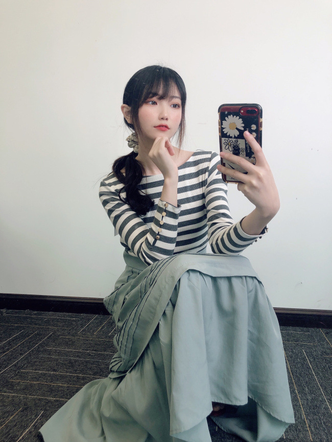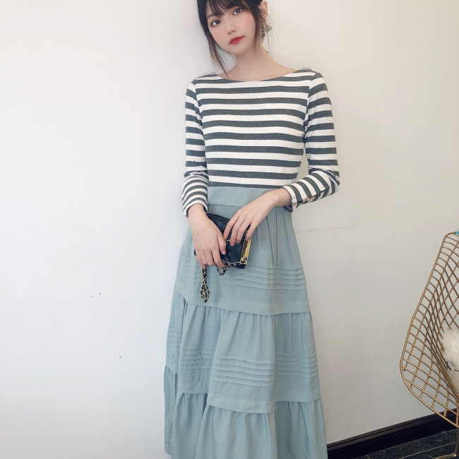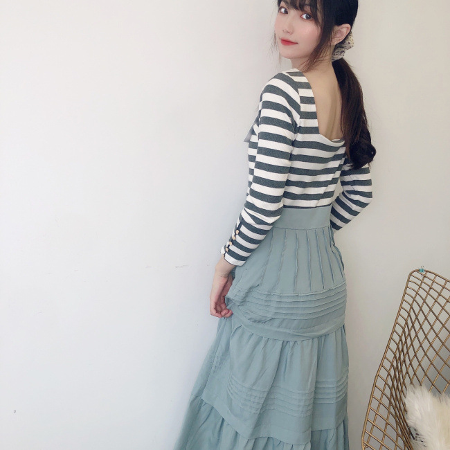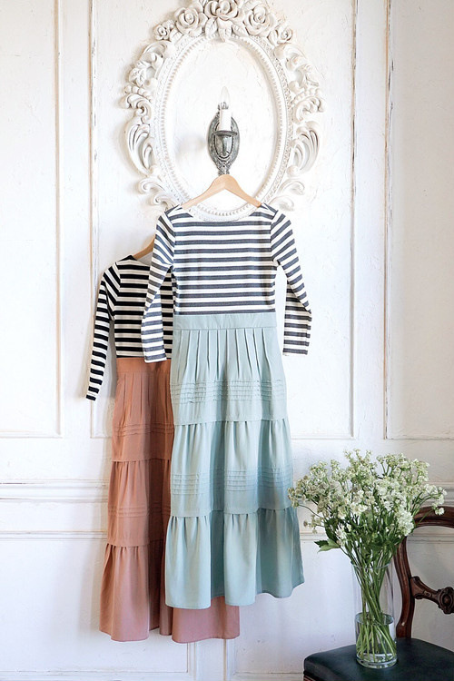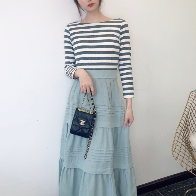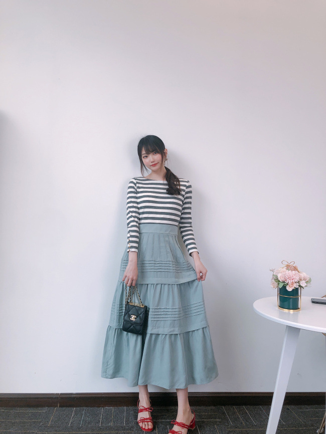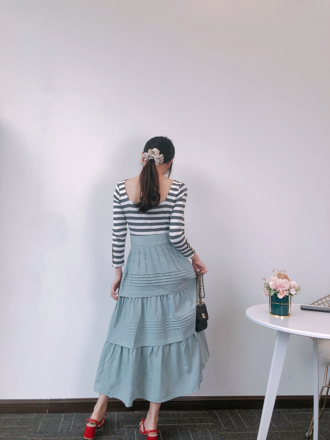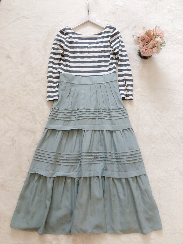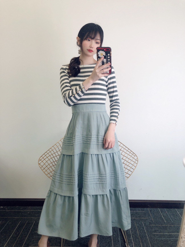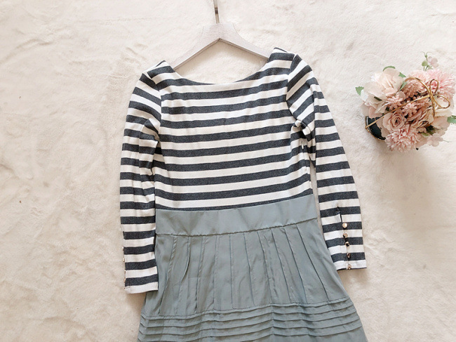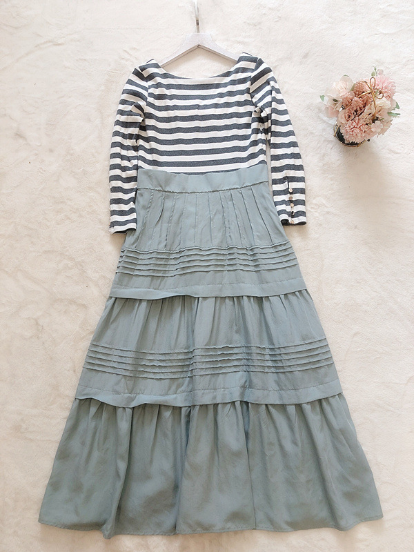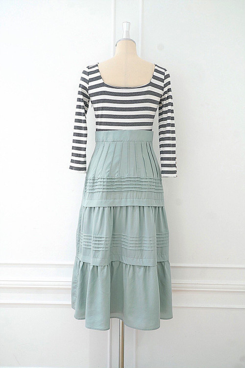 ボーダーに綺麗色スカートがドッキングされた目を引く印象的なドレス。