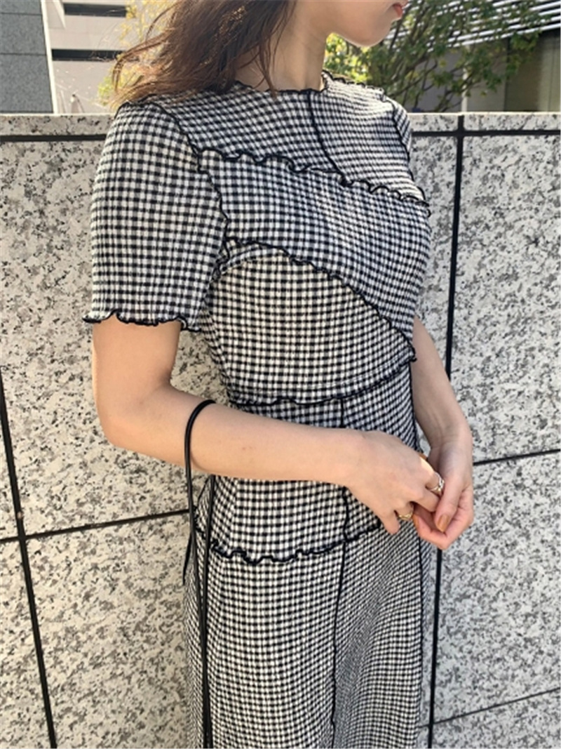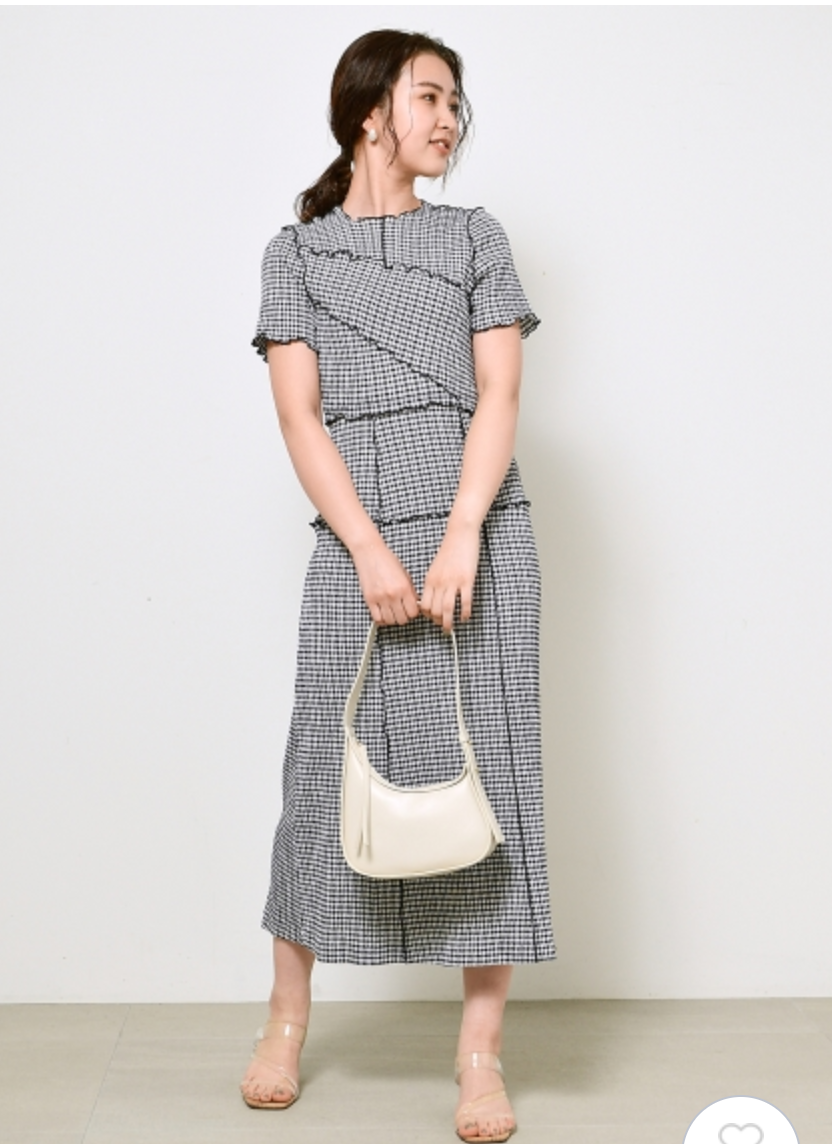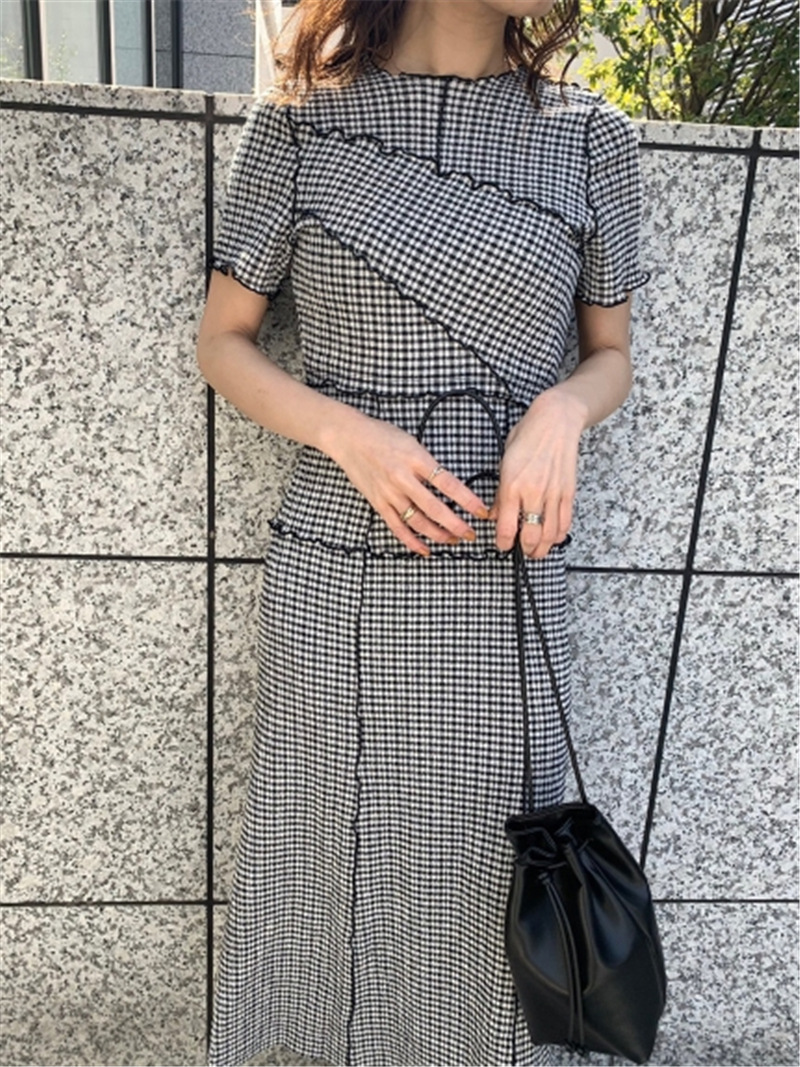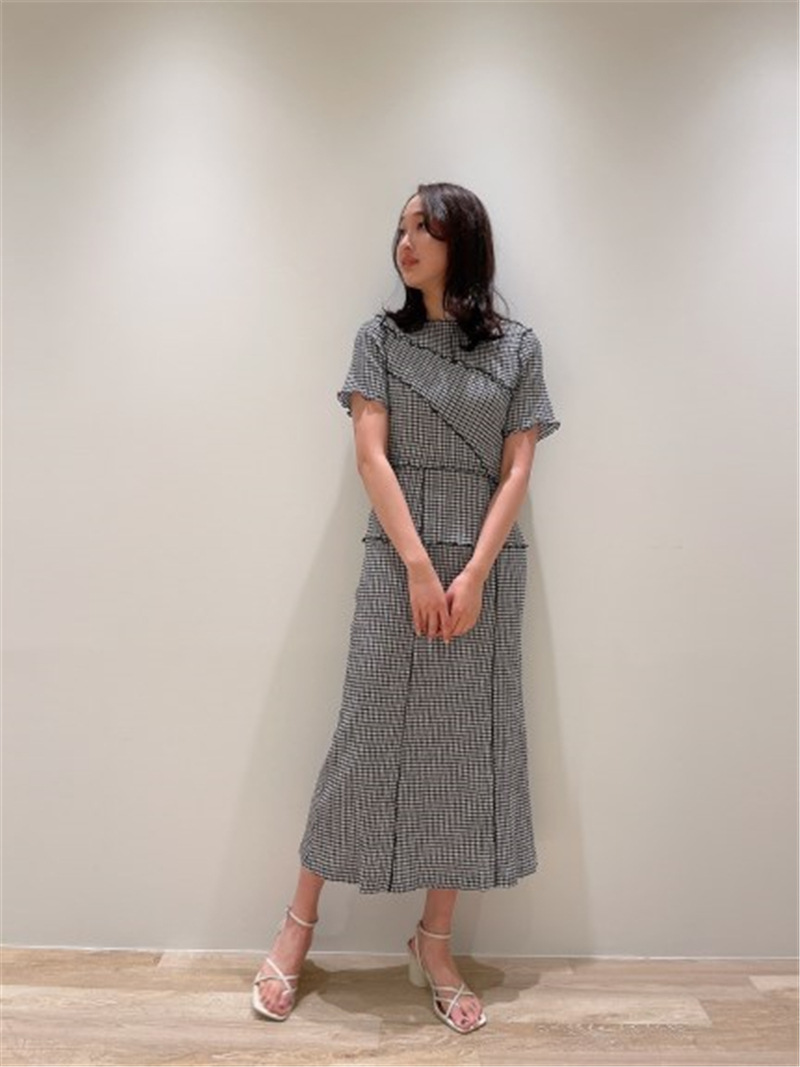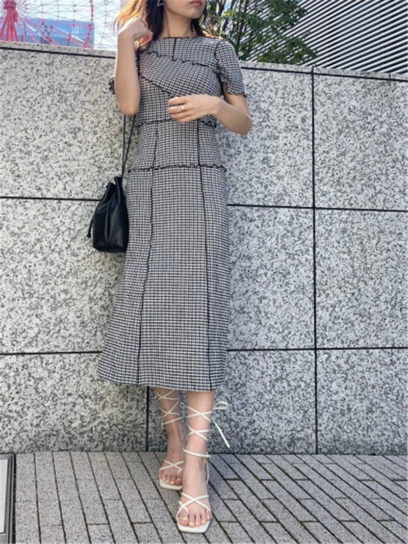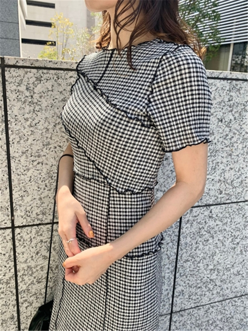 パッチワークの切り替えと配色のメロウステッチがアクセントに。縦ラインを強調してスタイルアップが叶う女性らしいシルエットです。