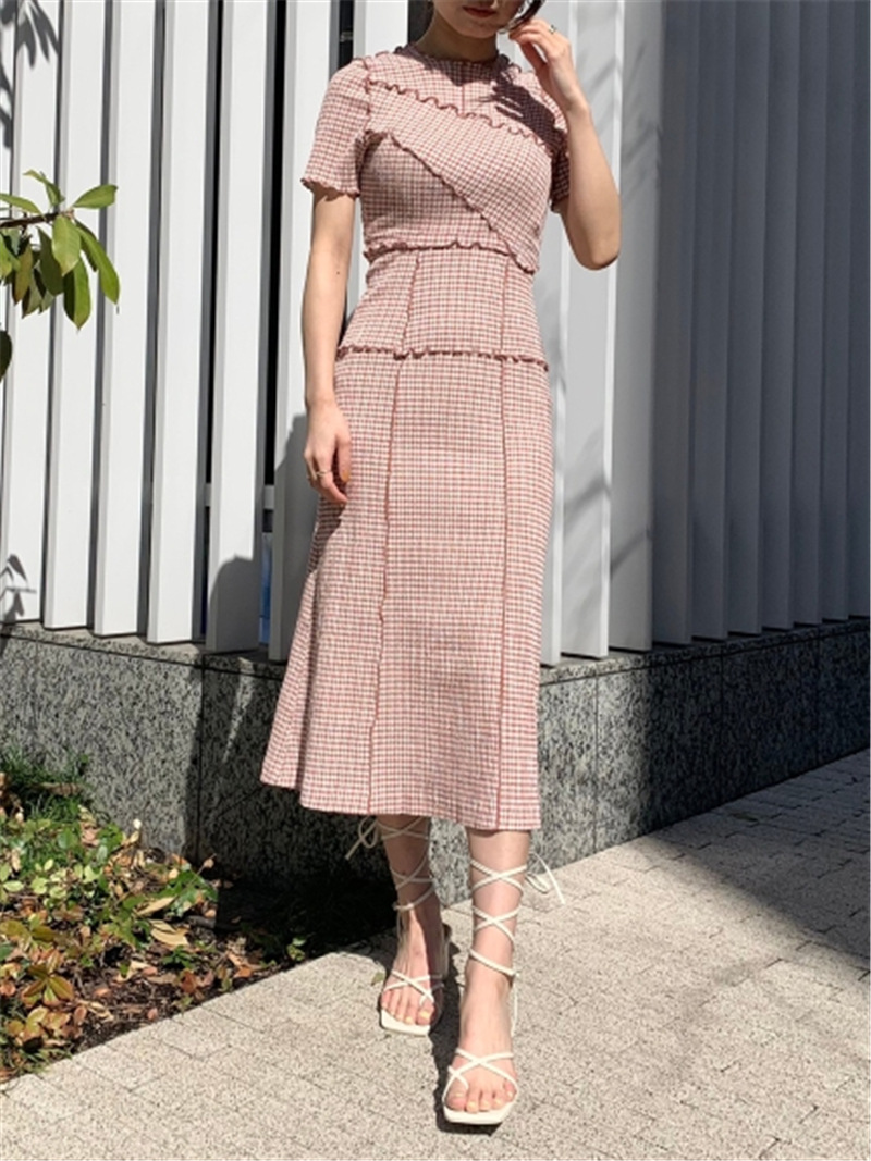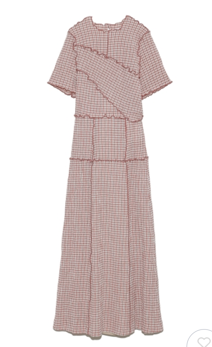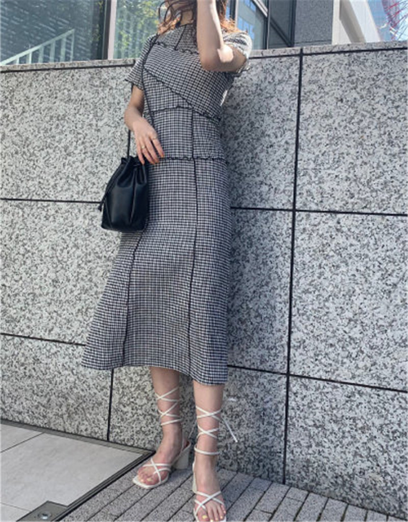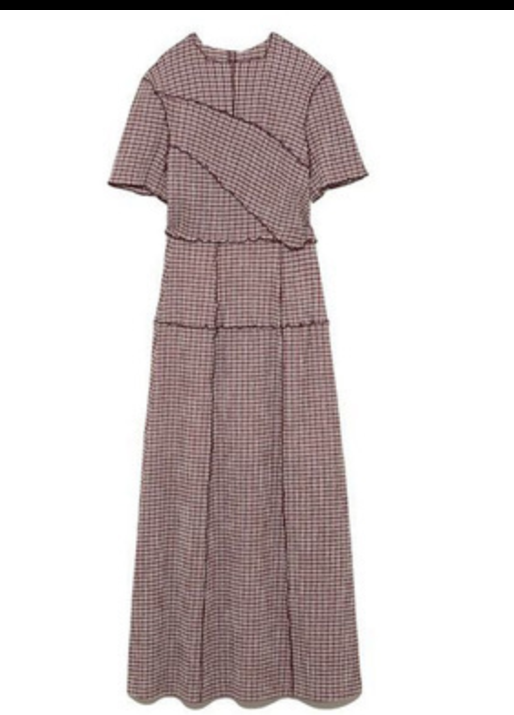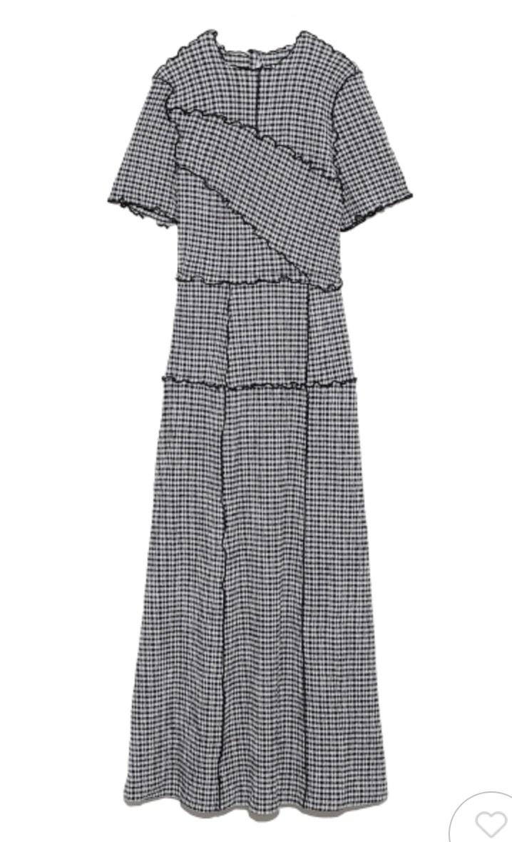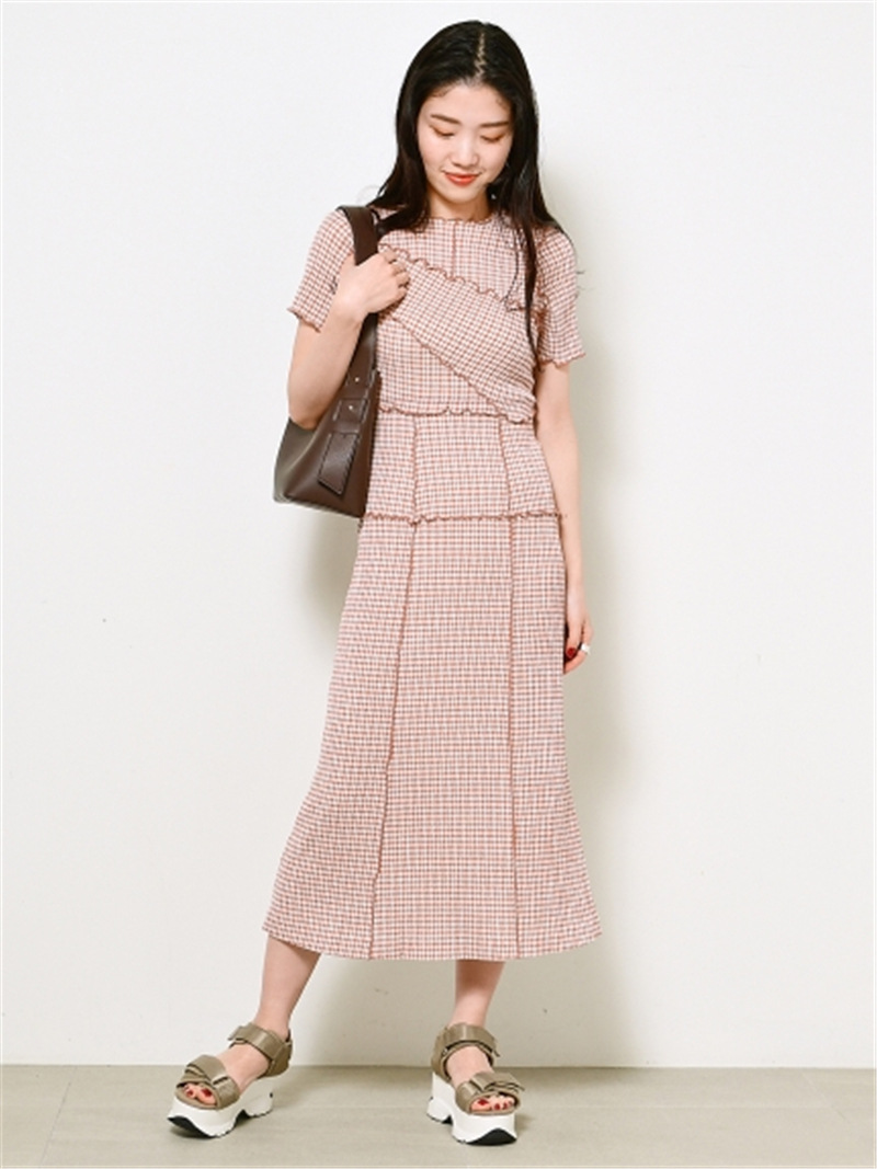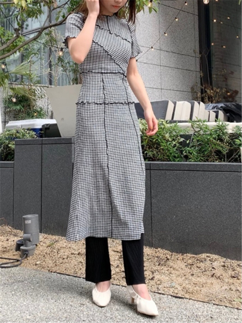 パッチワークの切り替えと配色のメロウステッチがアクセントに。縦ラインを強調してスタイルアップが叶う女性らしいシルエットです。