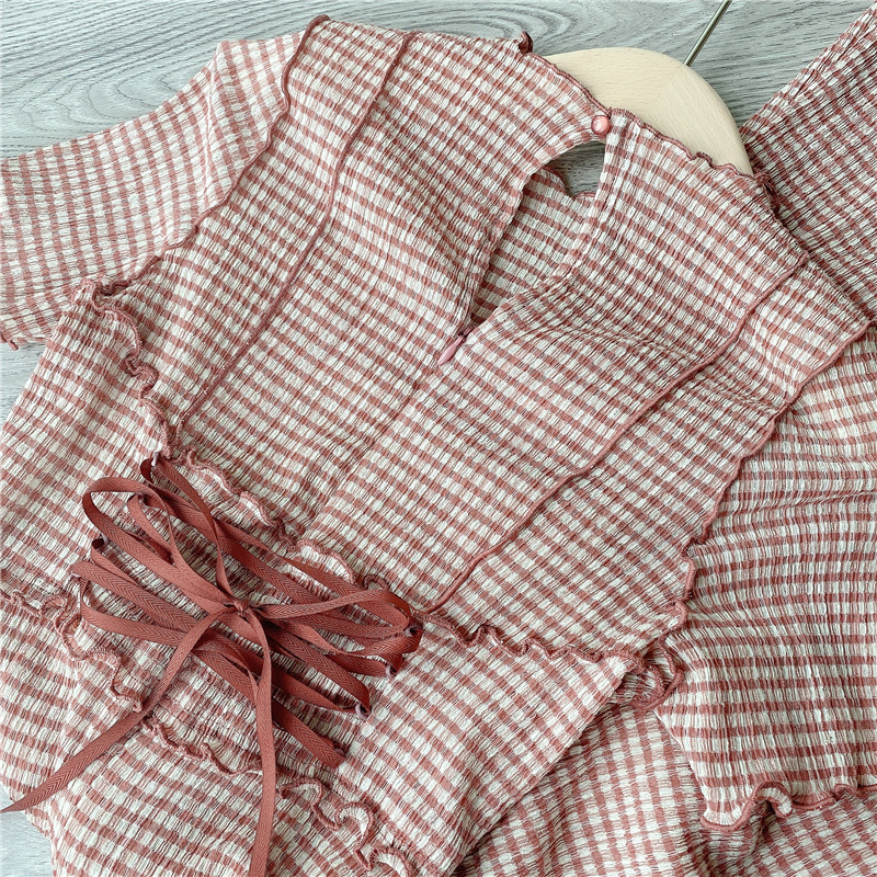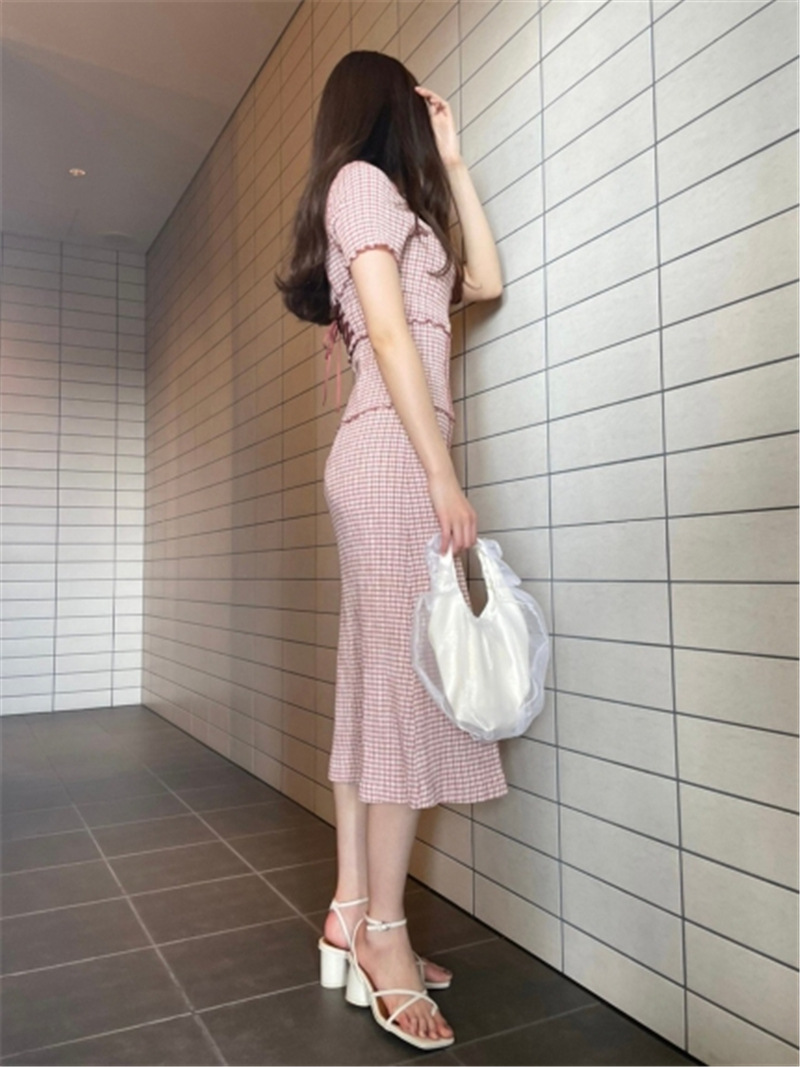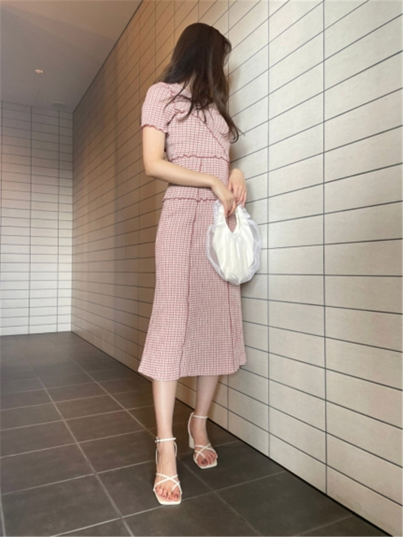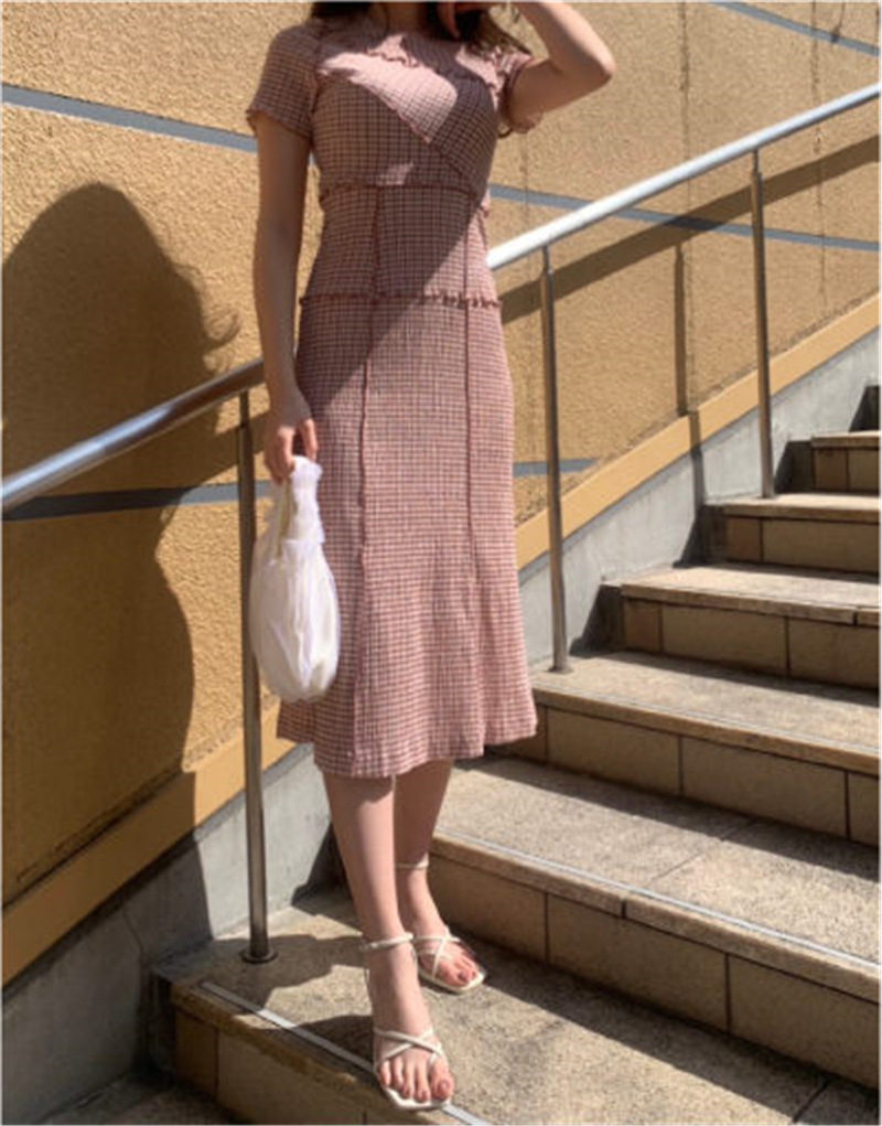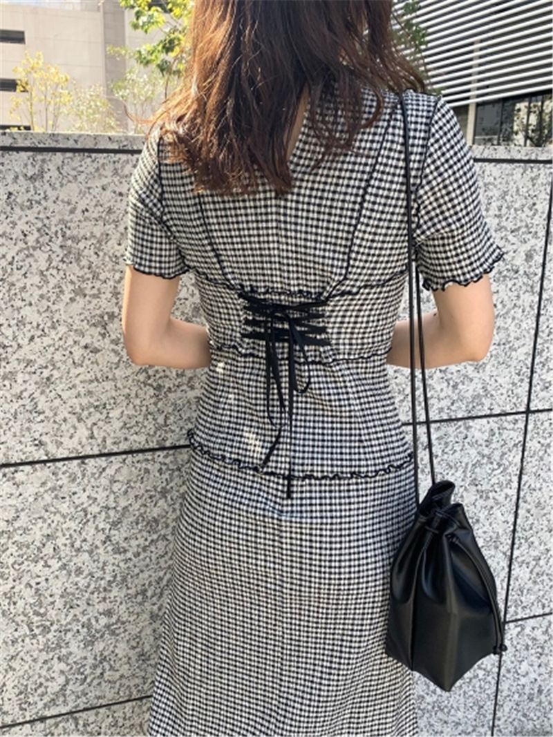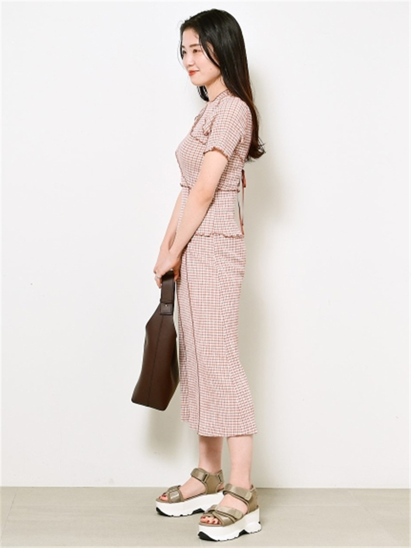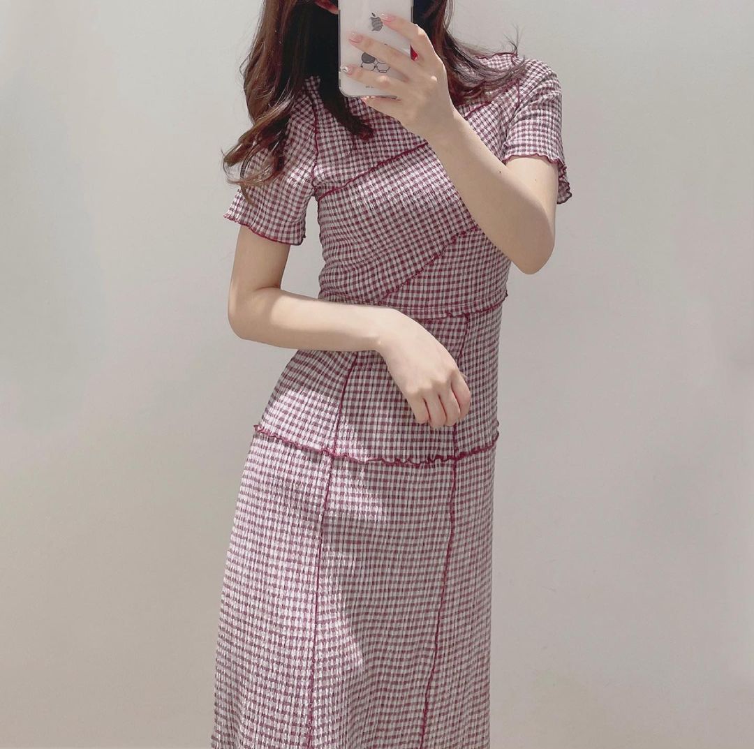 パッチワークの切り替えと配色のメロウステッチがアクセントに。縦ラインを強調してスタイルアップが叶う女性らしいシルエットです。
