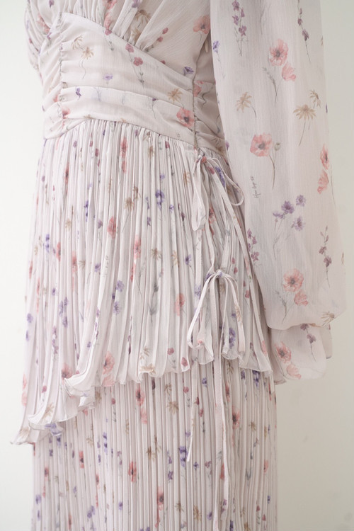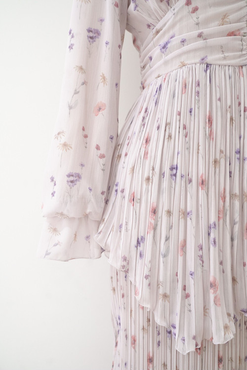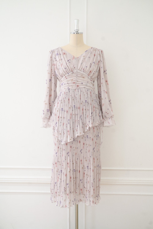胸元の細かなギャザーが美しく、2段に重なったアシメトリーのスカートがディティールポイントです。