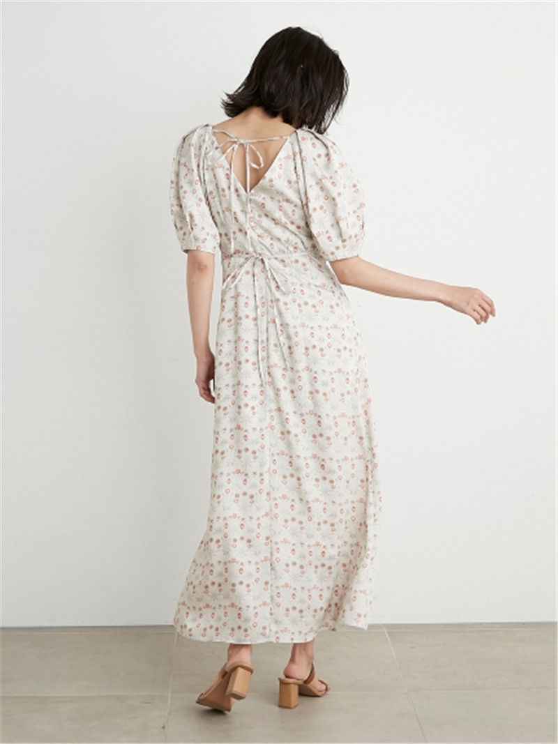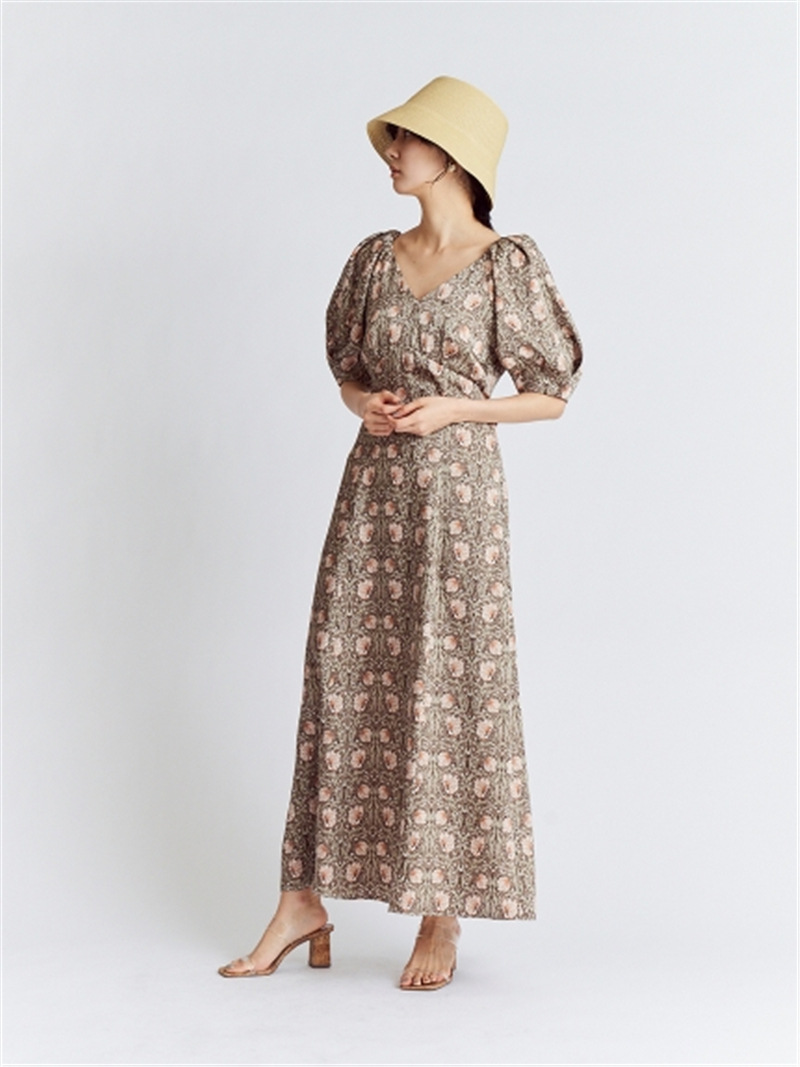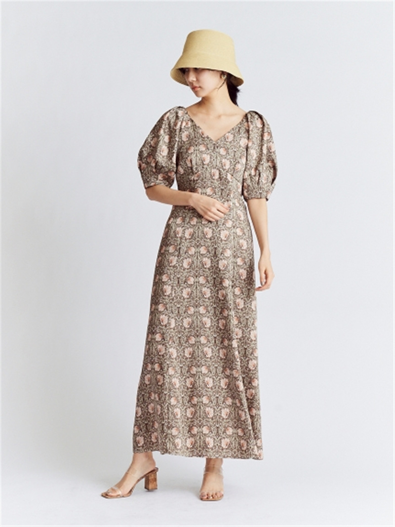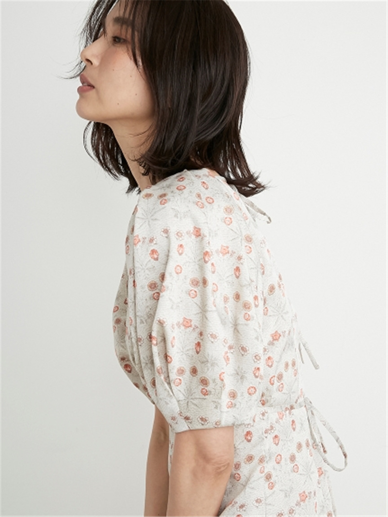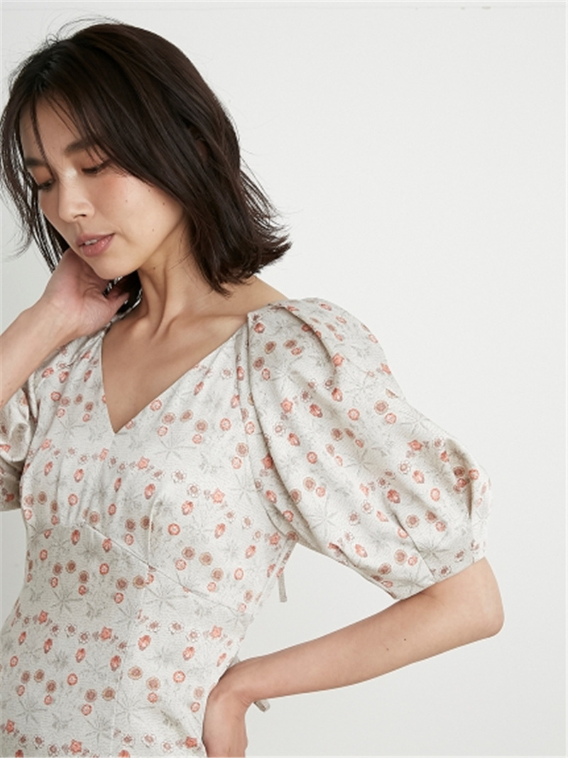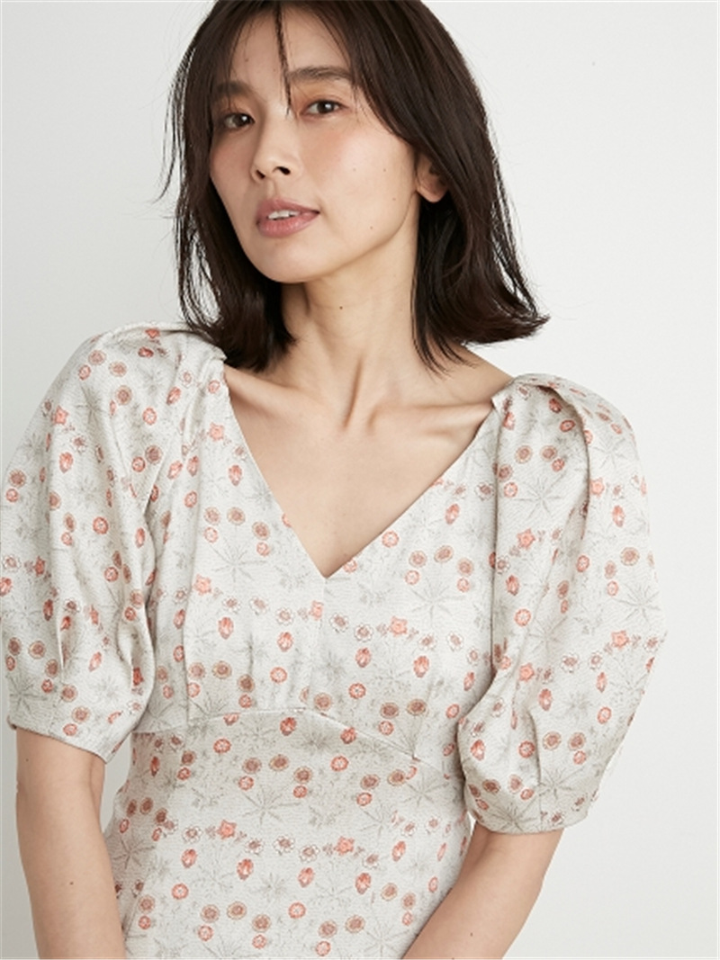 リサイクルポリエステル100%の、艶のあるツイル生地で仕立てたプリントワンピース。描いたパターンは、19世紀にデザイナーとして活躍した「WILLIAM MORRIS(ウィリアム モリス)」とのコラボレーション。有機的な植物モチーフの図案を採用しています。ラグランスリーブから深めのタックを取って立体感を出したボリュームスリーブが、デコルテラインを華奢に魅せ小顔効果も期待。バスト下にはパネル切り替えを施し、身体の線を美しく魅せるシルエットでスタイルアップを叶えます。ウエストにあしらったリボンは、調整が可能です。